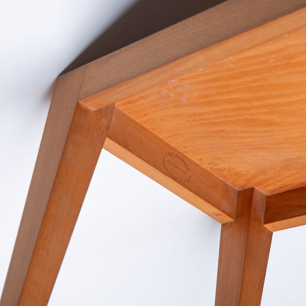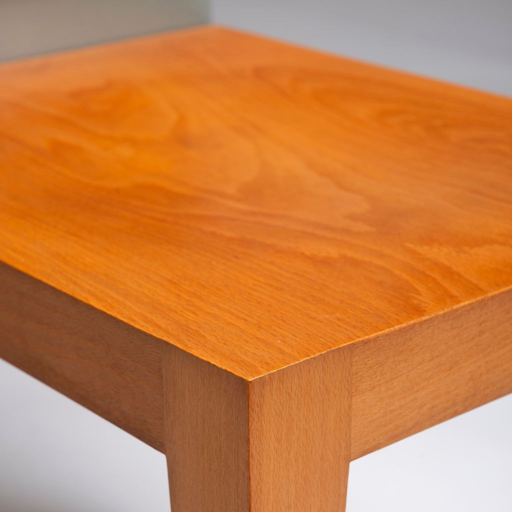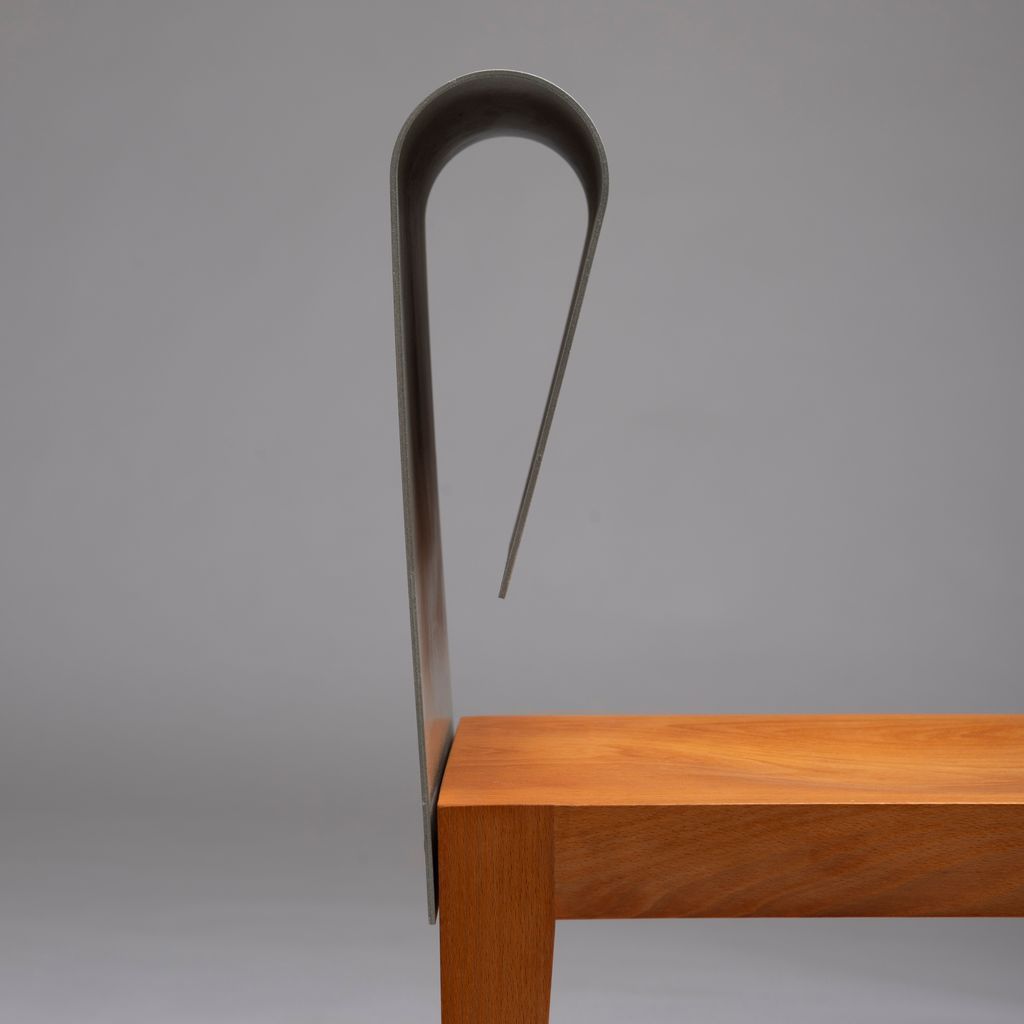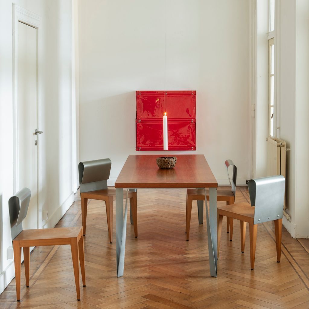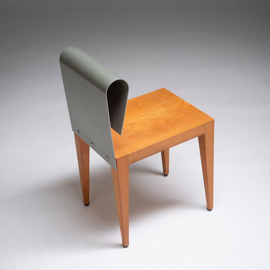 This set of 4 extremely rare chairs - a production of only 10 prototypes - consist of a folded & oven powder coated aluminium backrest connected to an oiled beech base that is slightly inclined & curved for seating comfort.
