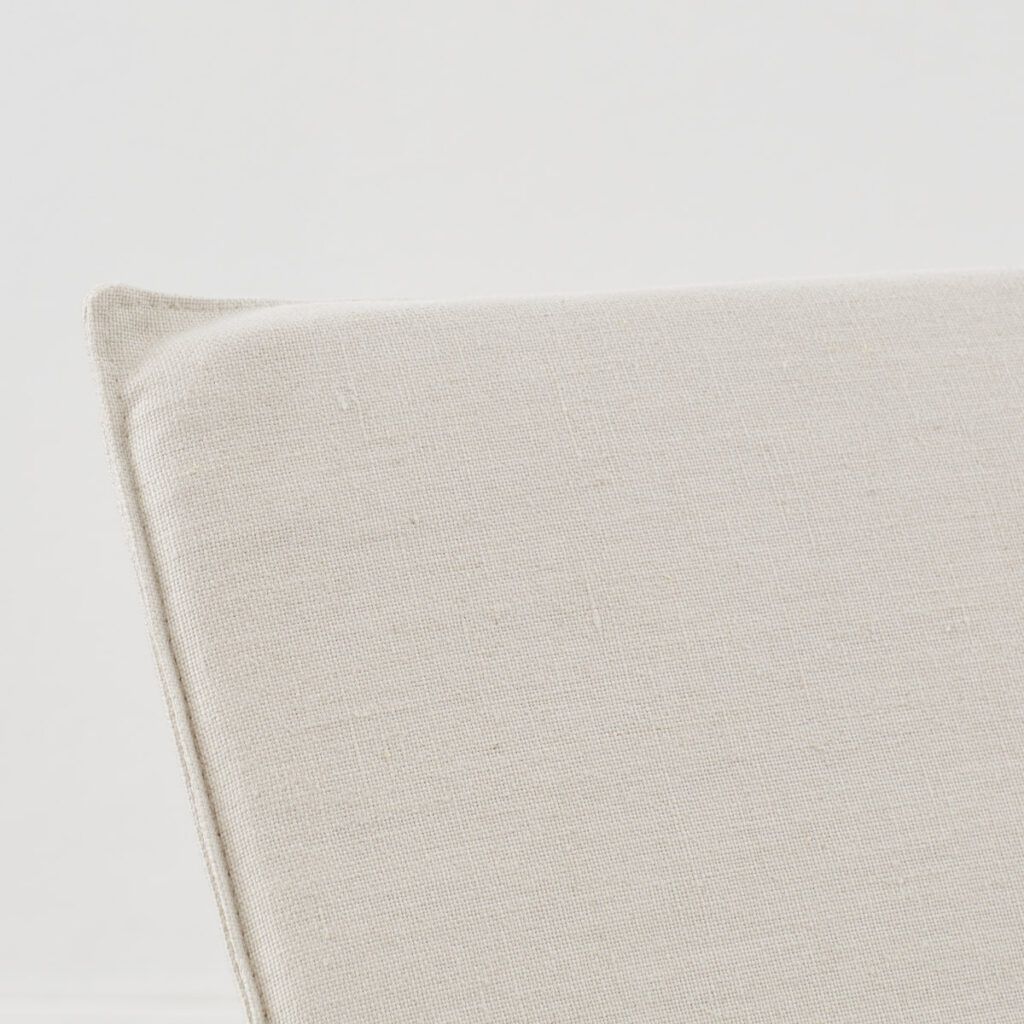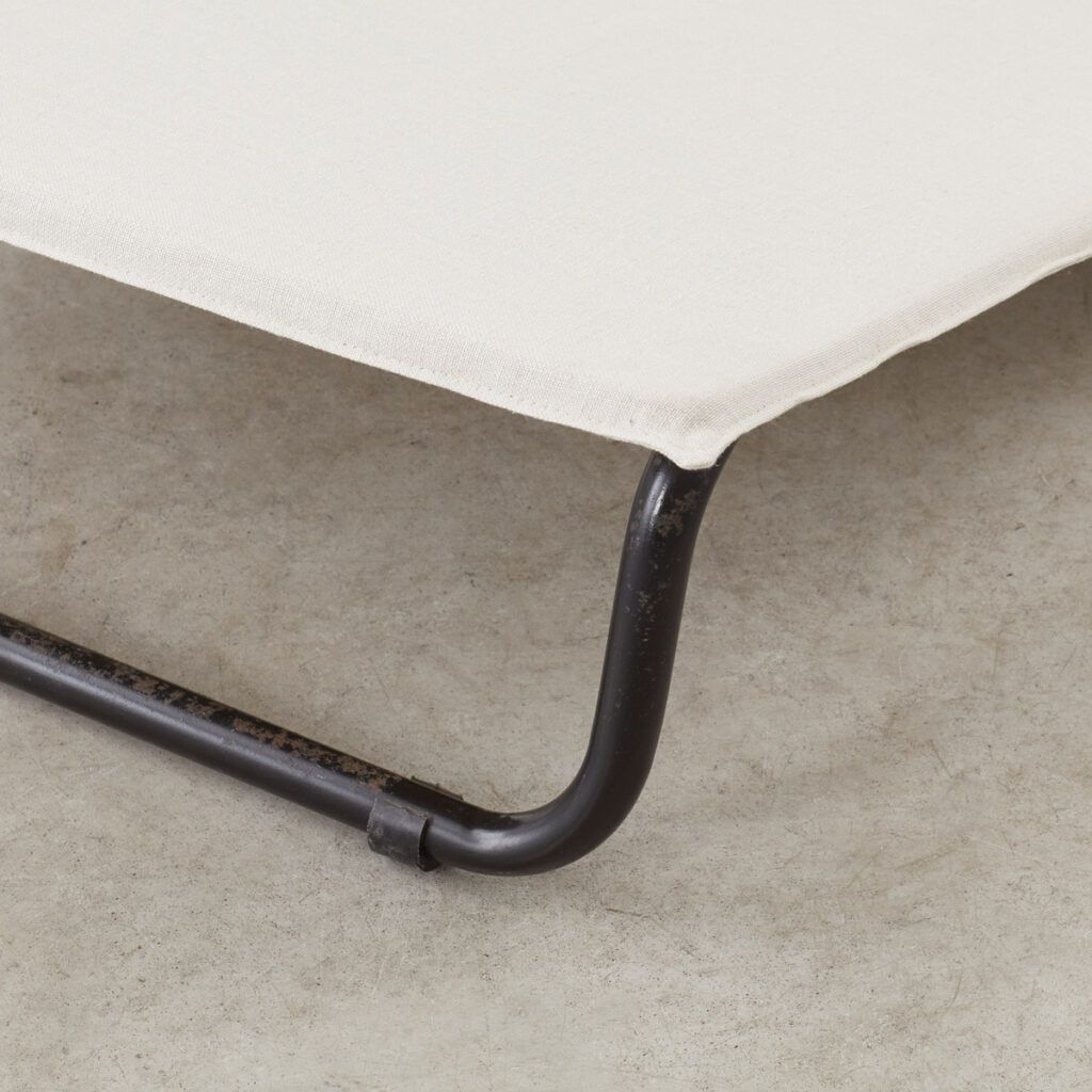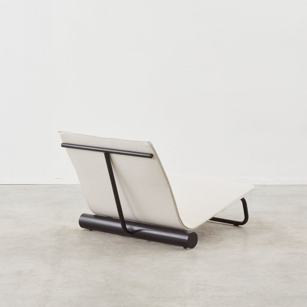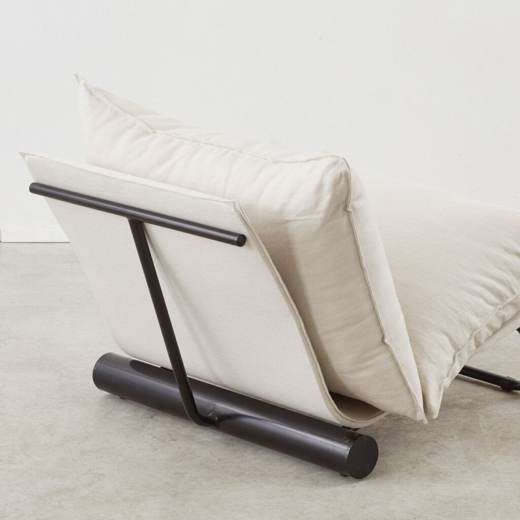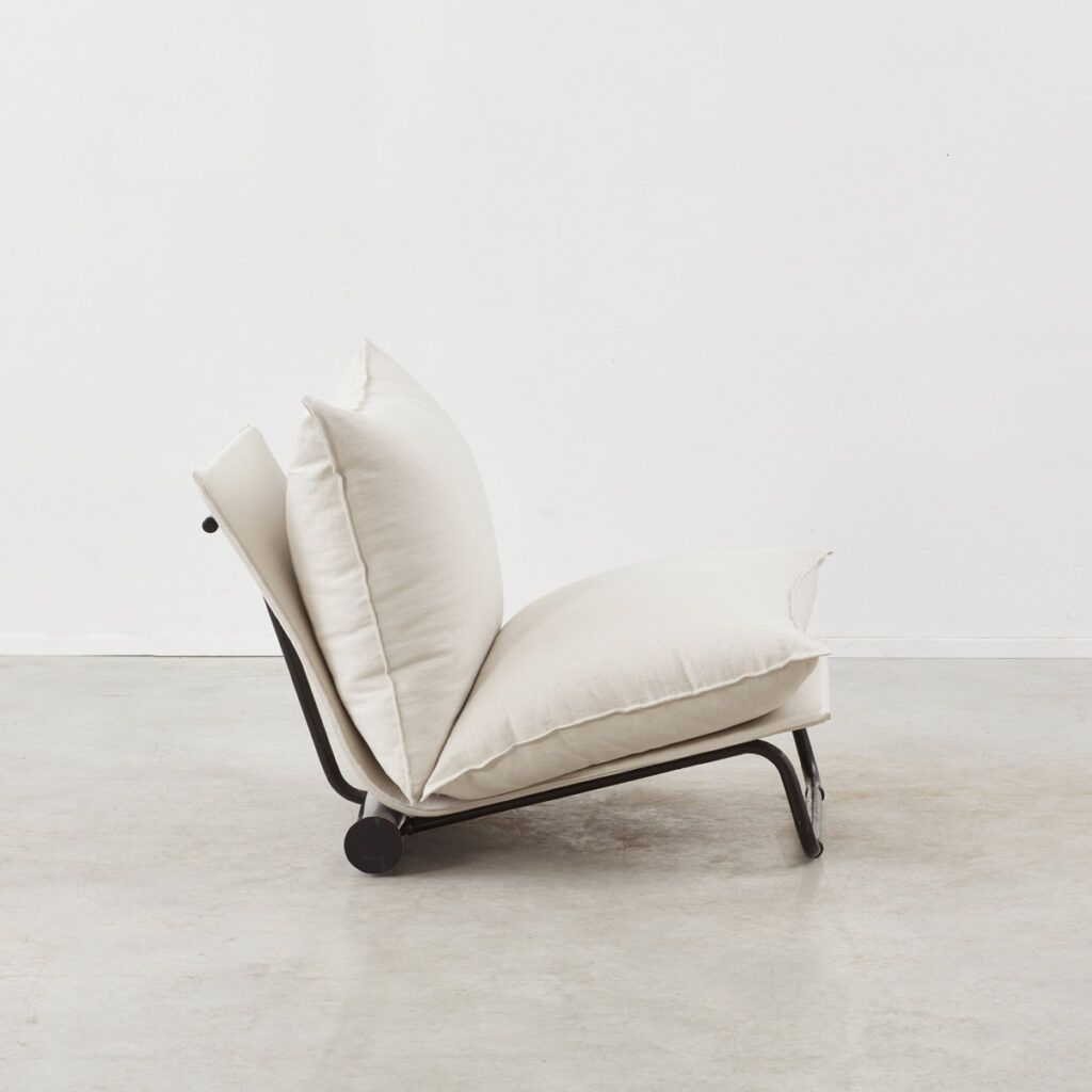 Recently reupholstered in an off-white linen canvas. Frame is in good condition with some light wear to the coated metal. One available but can be used modularly amongst other Le Farfalle armchairs, to form a larger sofa.