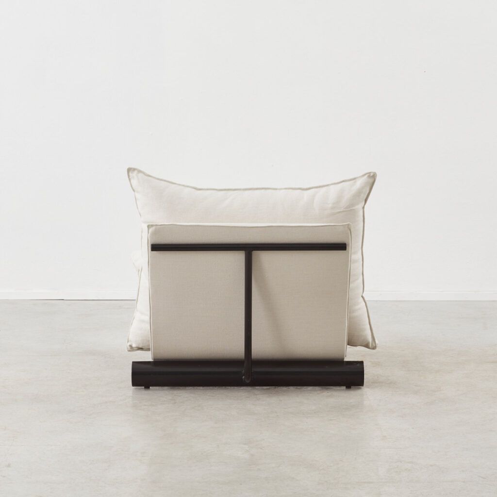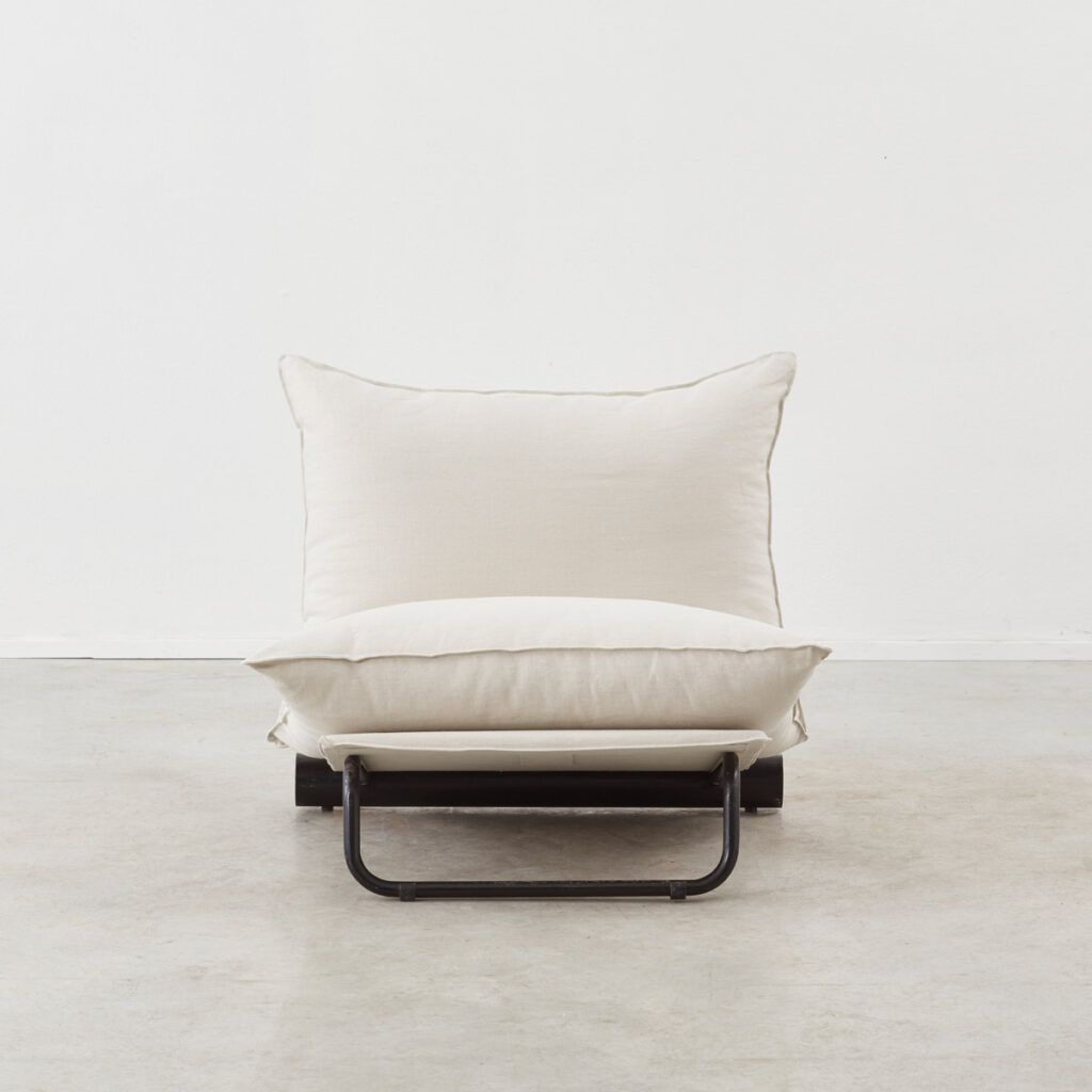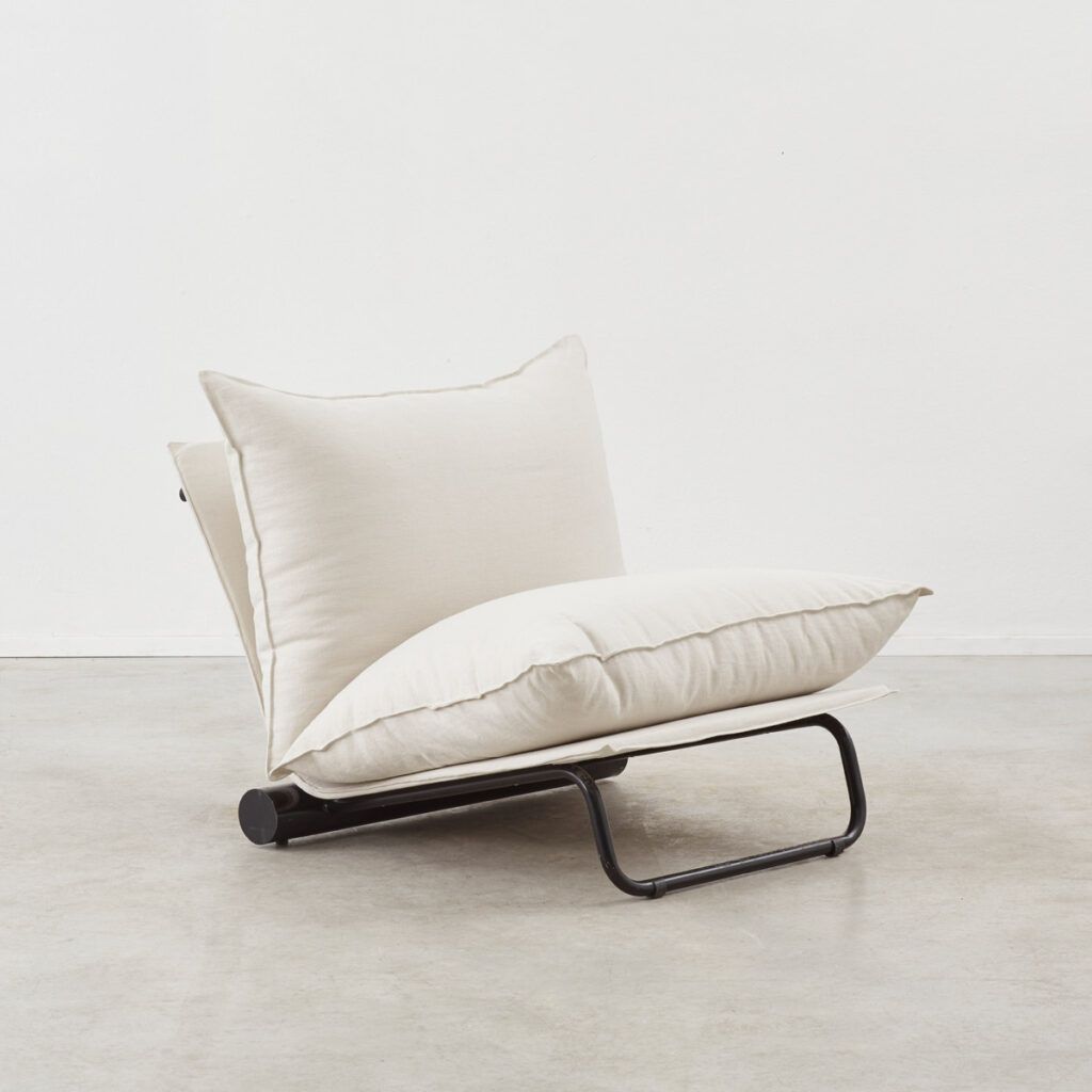 Le Farfalle, translates to butterfly in Italian, reflecting the striking winged form of the chair. Roberto Lucci and Paolo Orlandini began their partnership in 1968, creating a wide array of products for companies including Elam and Knoll, Le Farfalle being one of these. With its metal frame blooming out like wings to support two plump cushions, they skillfully created an unexpected harmony between natural form and sharp industrial metal.