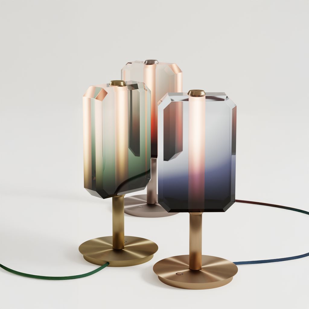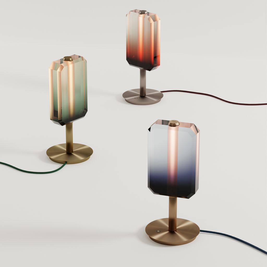 Table lamps made of colored methacrylate with gradient effect in 'Ruby', 'Sapphire' or 'Emerald' colours. Steel base and stem, with touch switch and dimmer. Tubular LED source, protected by a cylindrical opaline diffuser. The lamp body features one or two blocks of methacrylate milled with a "baguette" cut, hand-polished and coloured. Power cord covered in fabric to match the diffuser. wall driver, max 8W (single diffuser), weight 5 Kg, or 16W (double diffuser), weight 8 Kg. Metal parts are available in the metal finishing selection.