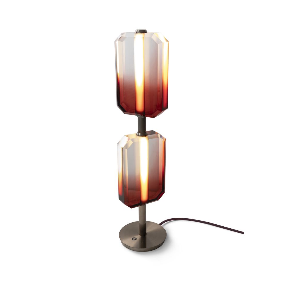 Table lamps made of colored methacrylate with gradient effect in 'Ruby', 'Sapphire' or 'Emerald' colours. Steel base and stem, with touch switch and dimmer. Tubular LED source, protected by a cylindrical opaline diffuser. The lamp body features one or two blocks of methacrylate milled with a "baguette" cut, hand-polished and coloured. Power cord covered in fabric to match the diffuser. wall driver, max 8W (single diffuser), weight 5 Kg, or 16W (double diffuser), weight 8 Kg. Metal parts are available in the metal finishing selection.