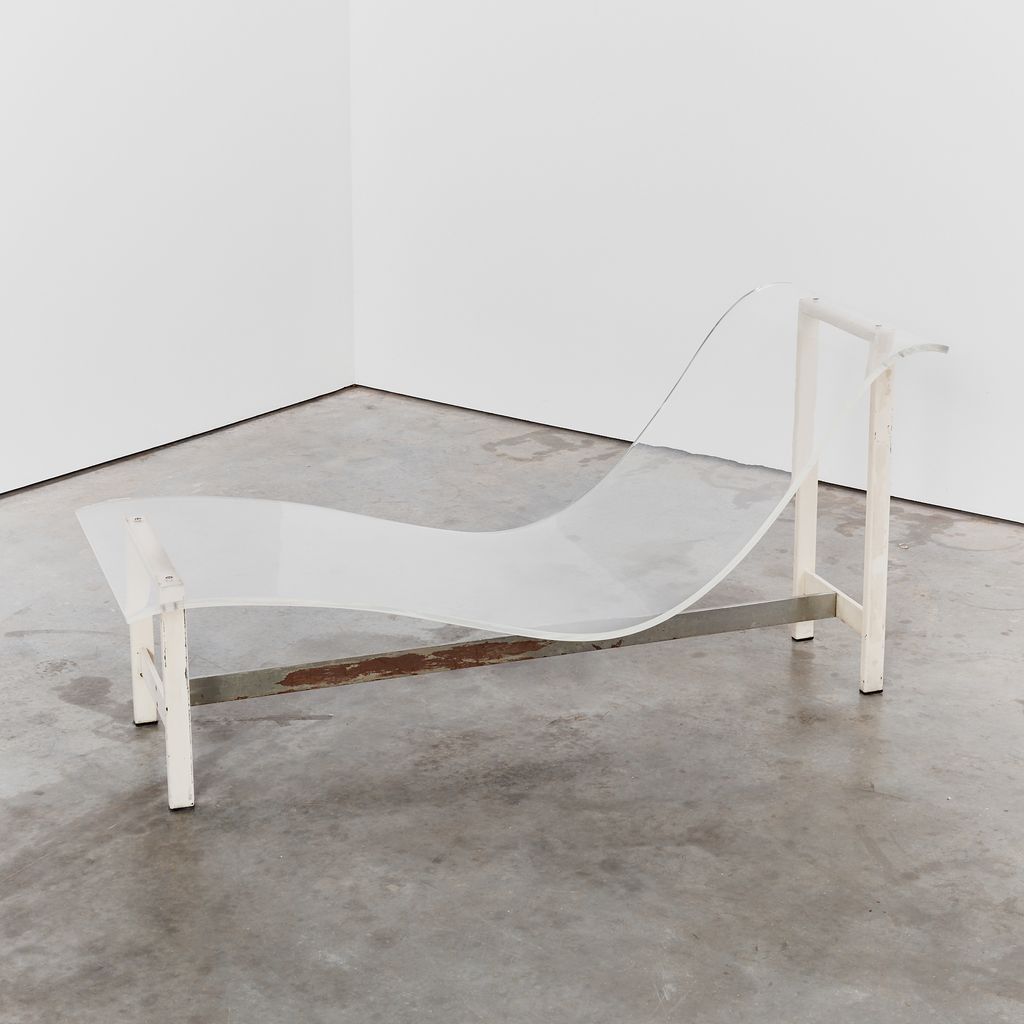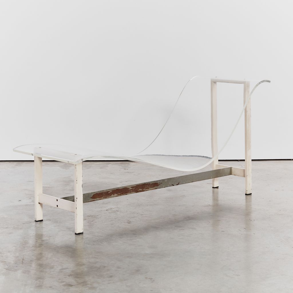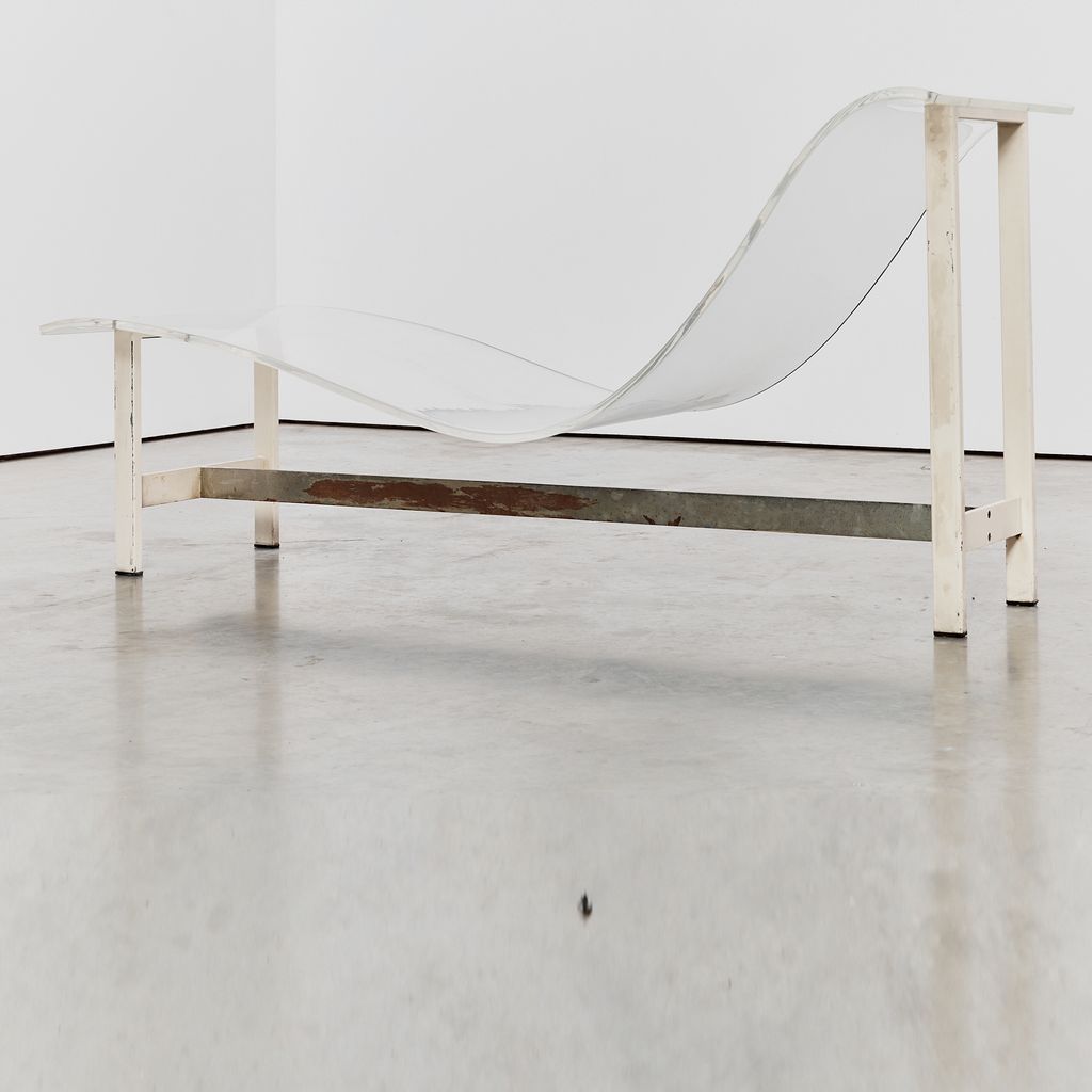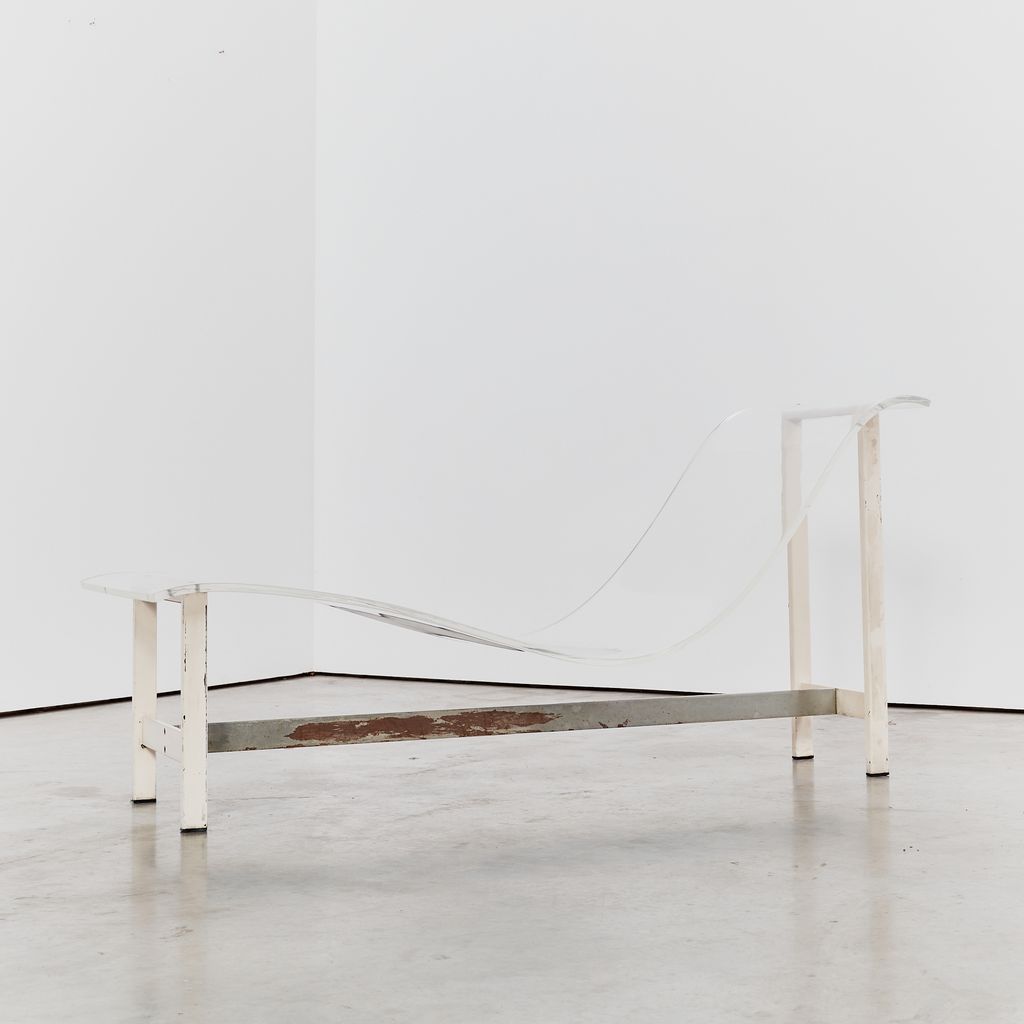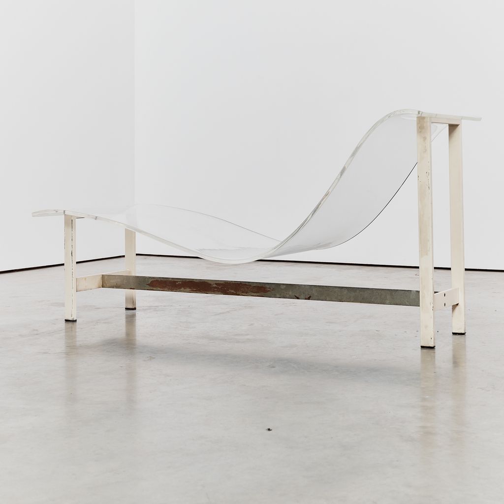 Large undulating chaise lounge in a single sheet of moulded lucite, resting on a simple steel frame with distressed paint work.