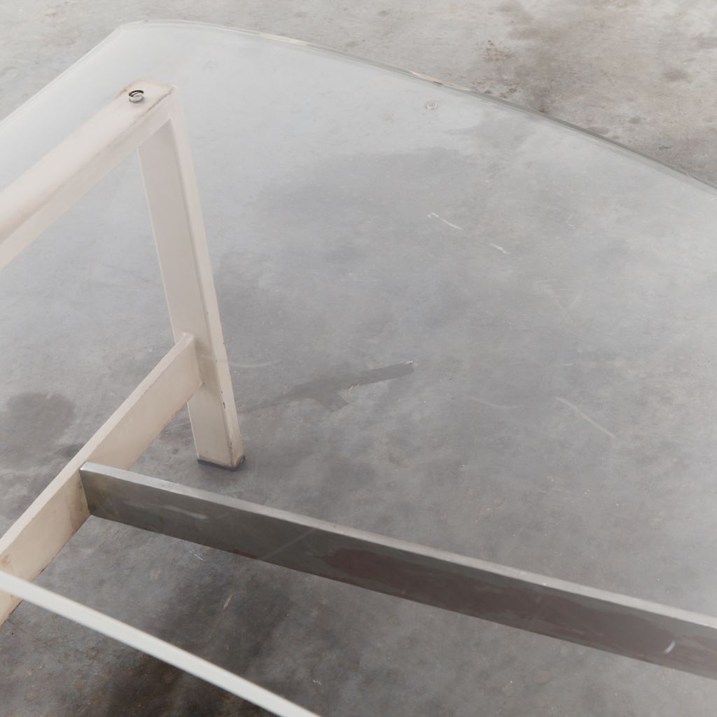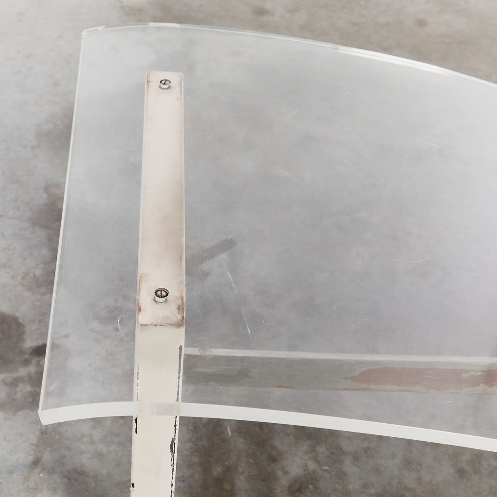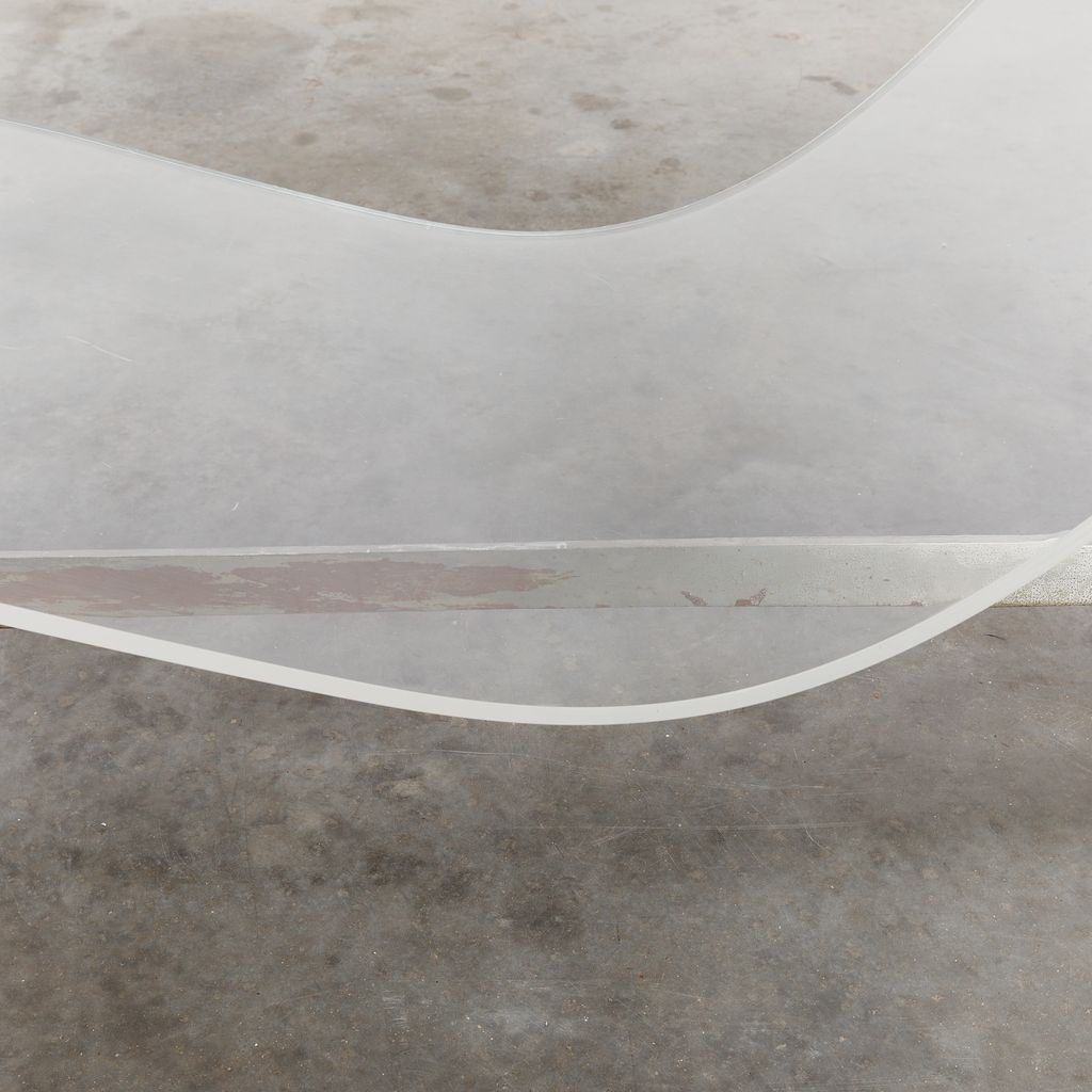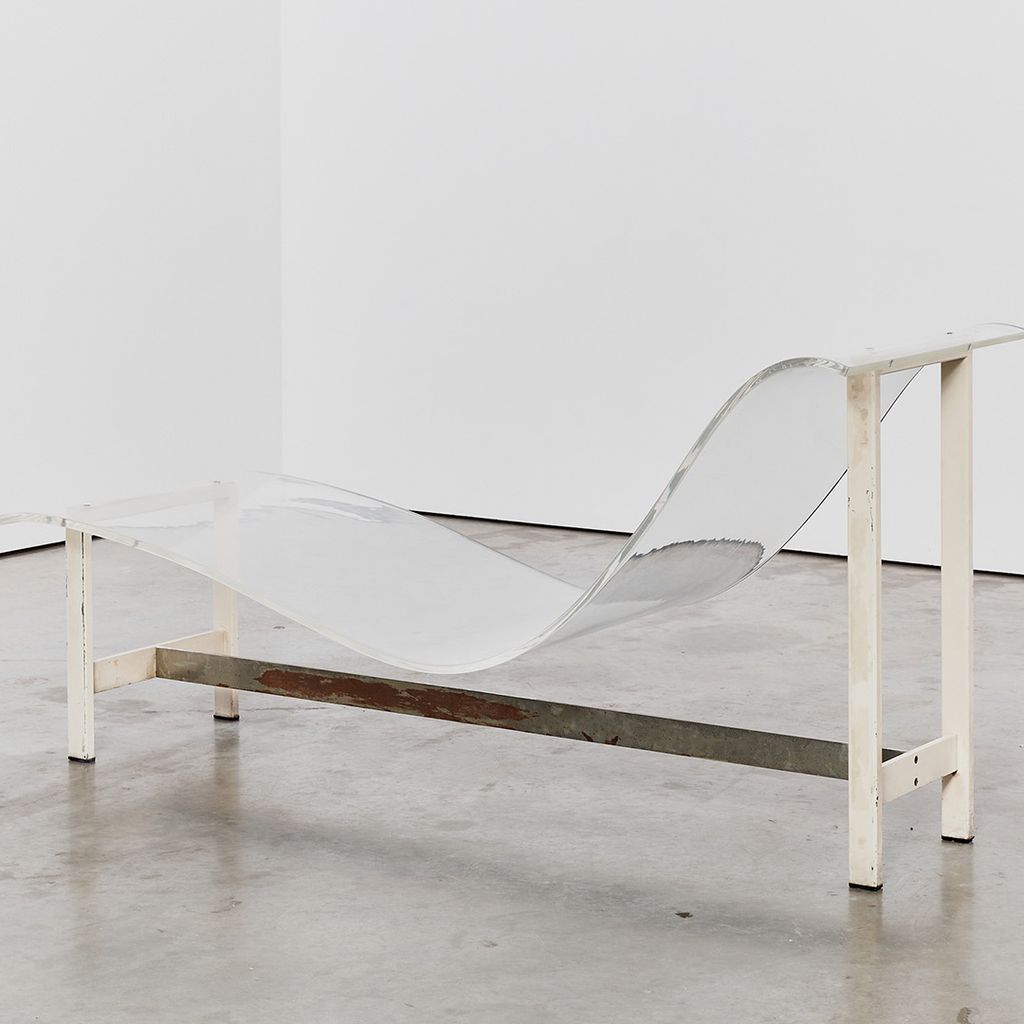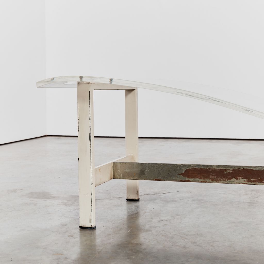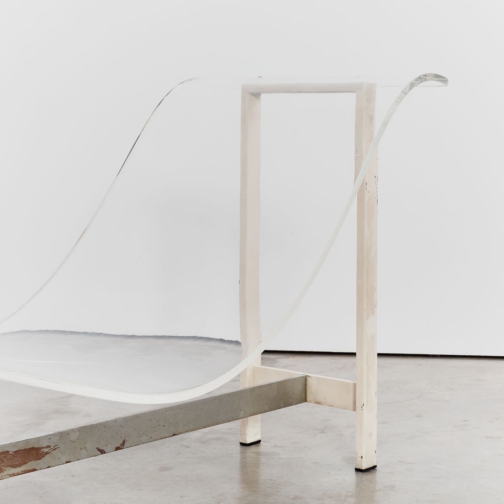 Large undulating chaise lounge in a single sheet of moulded lucite, resting on a simple steel frame with distressed paint work.