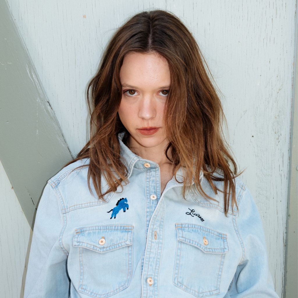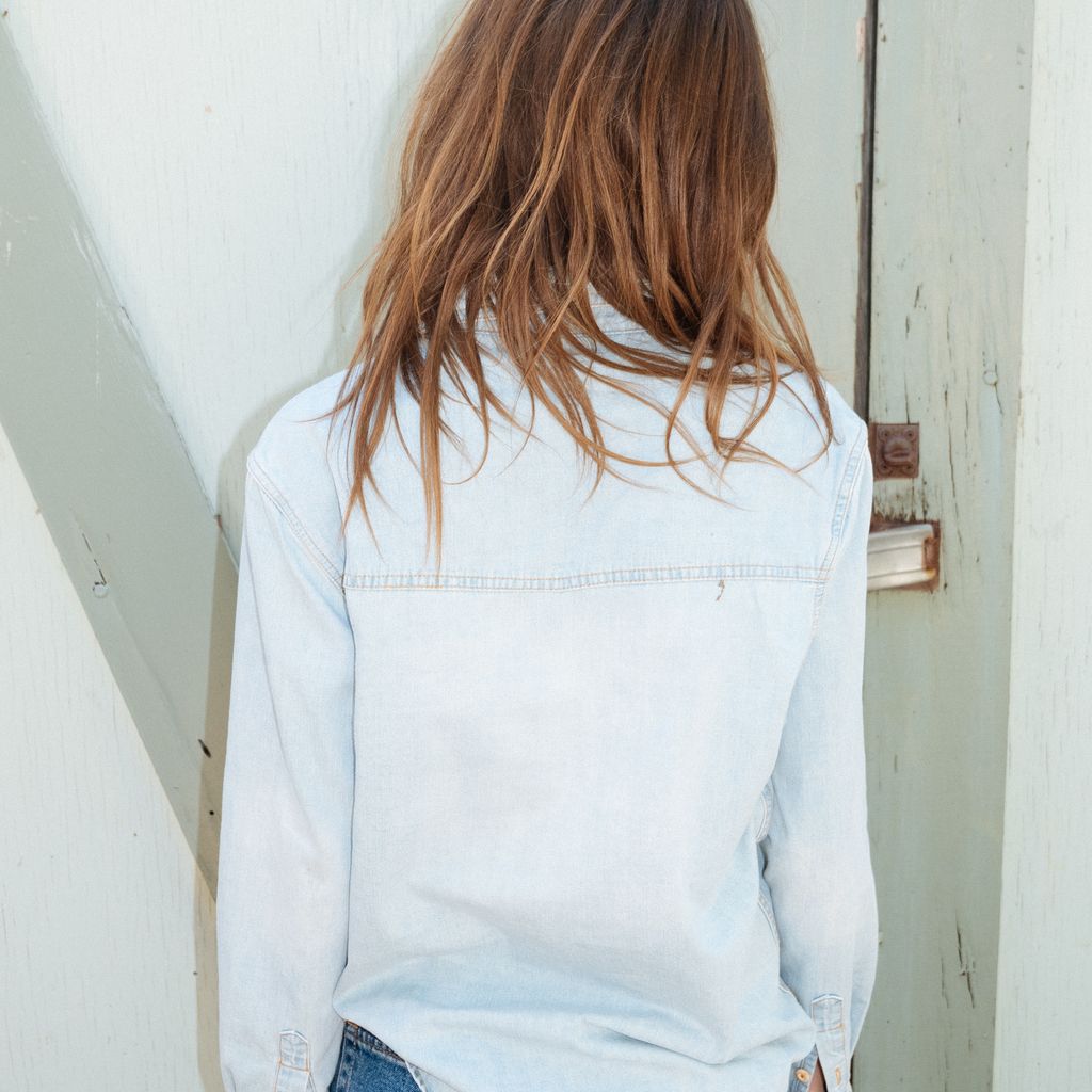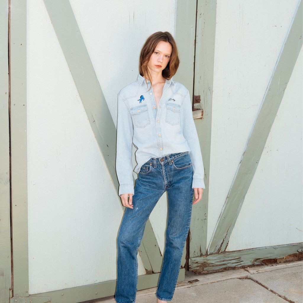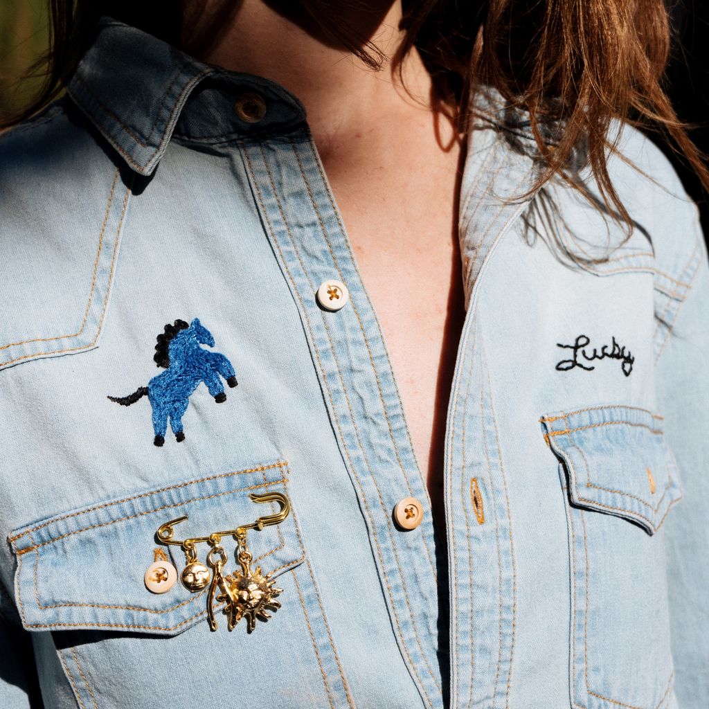 Denim shirt with hand embroidery at the front. Hand embroidered in Aspen, Colorado. 100% cotton.