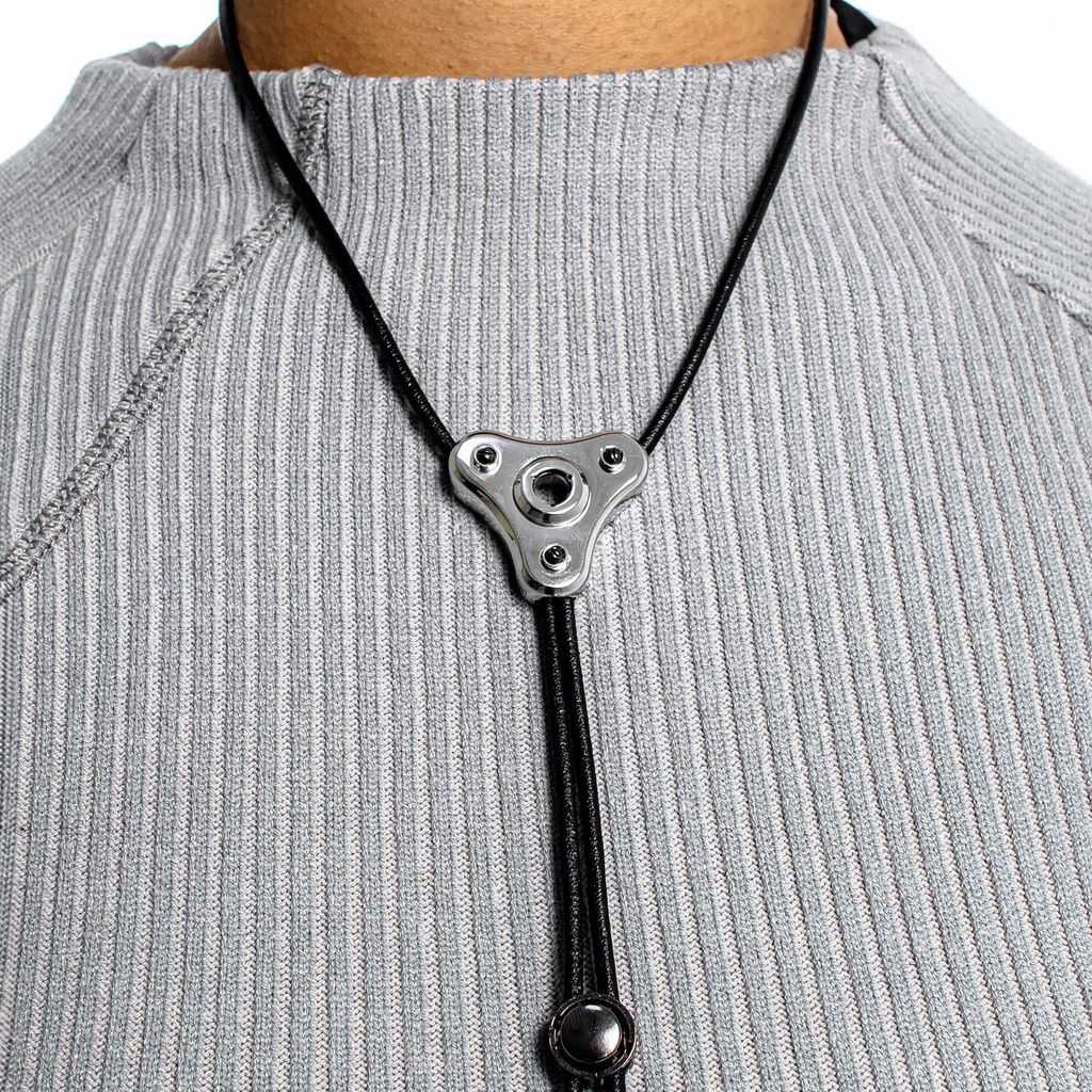 Adjustable leather bolo tie with surgical steel hardware and gunmetal detailing.