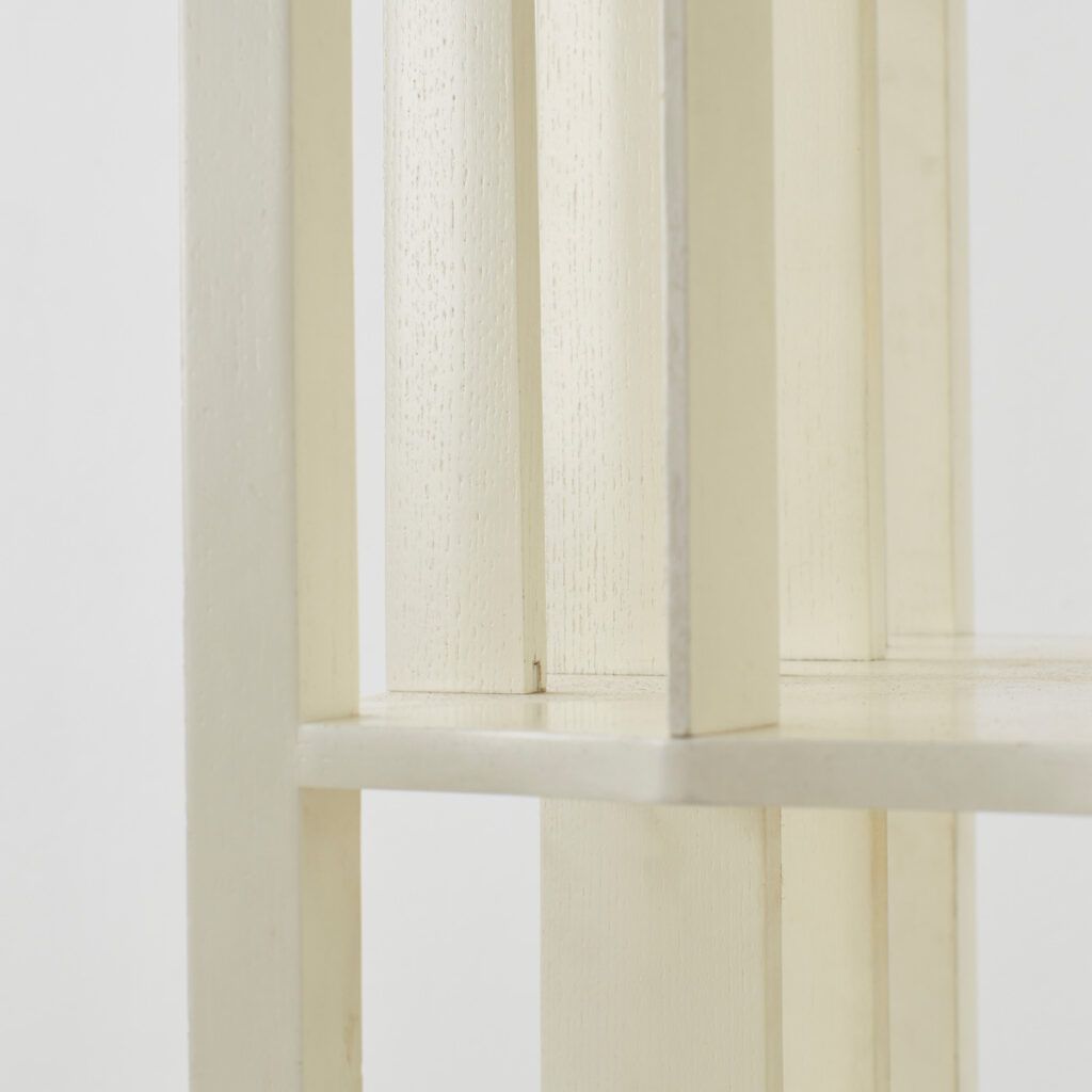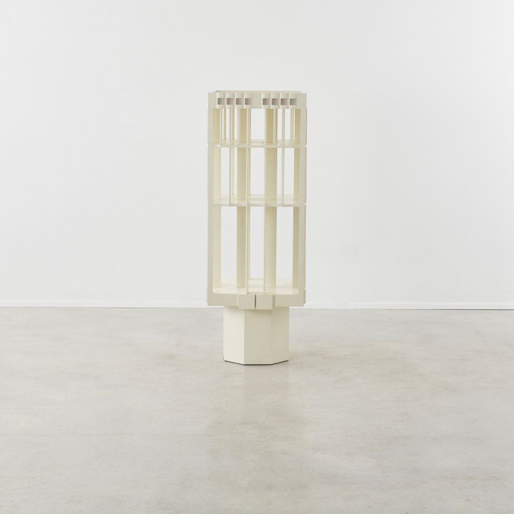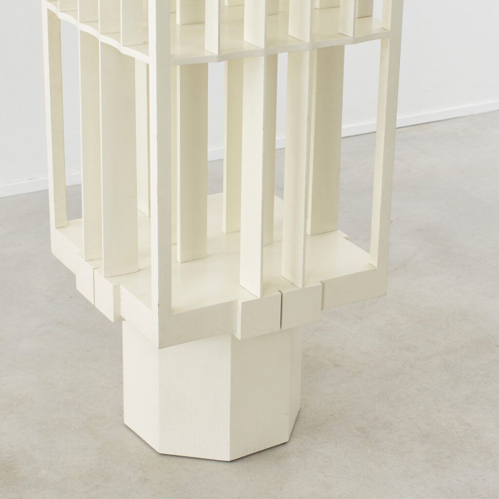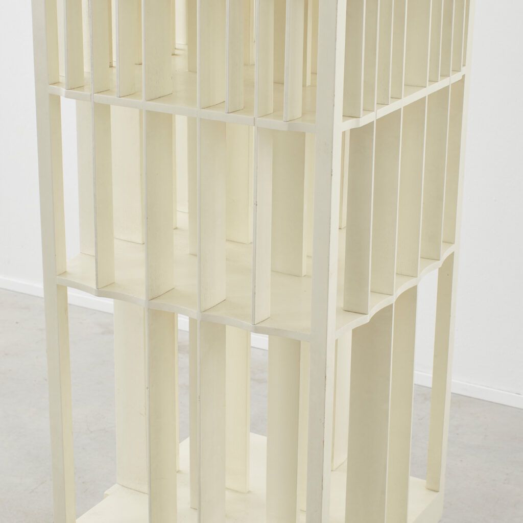 This revolving bookcase was designed in 1904 for Hous’hill, a house at Nitshill in Glasgow. It is Mackintosh’s only revolving bookcase and was destined for the drawing room. The design is based on an organic principle, with the vertical divisions representing the boughs and branches of a tree which multiply at each shelf, ending in little painted squares which suggest blossom or leaves.