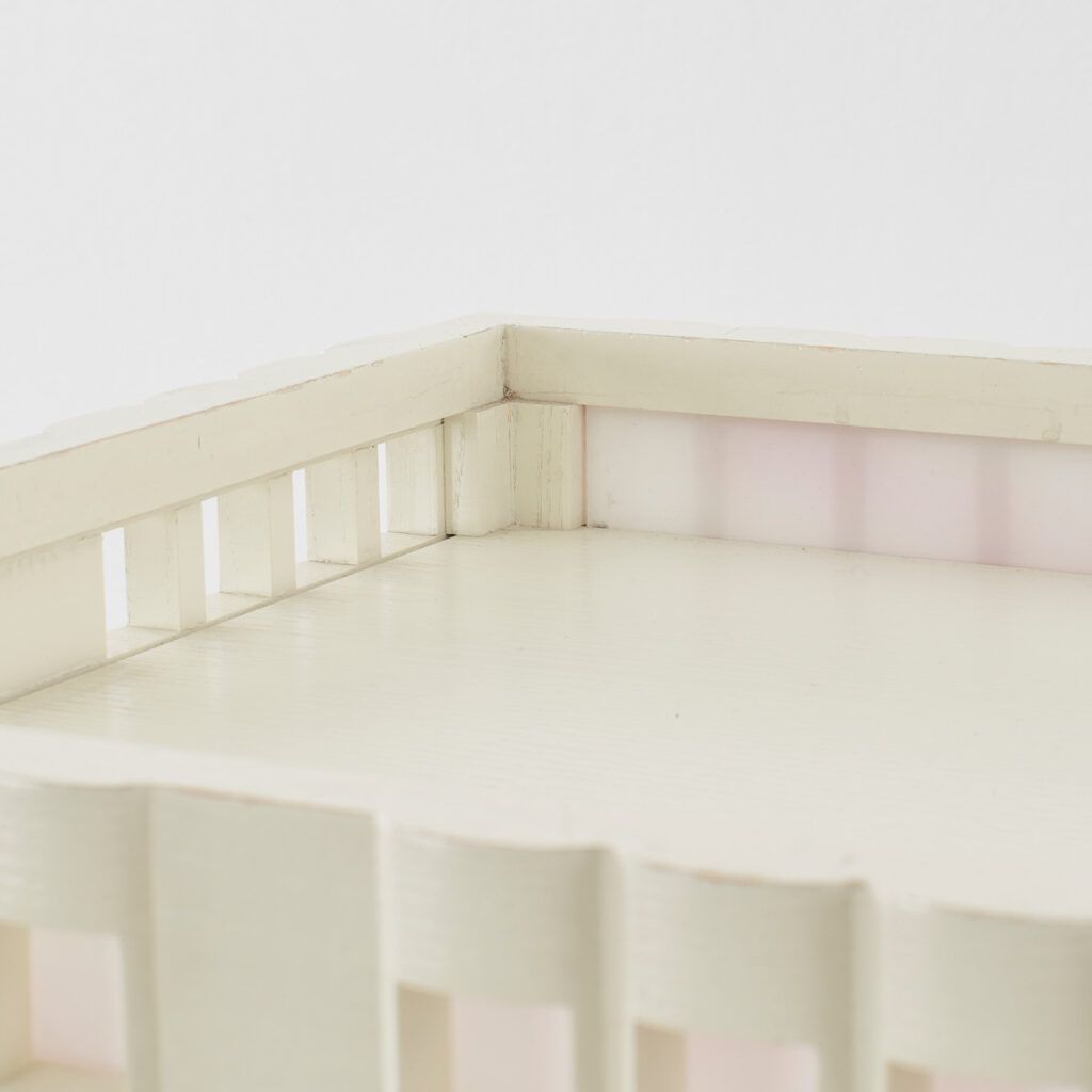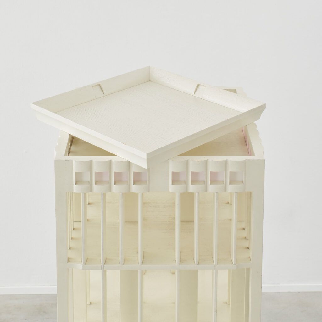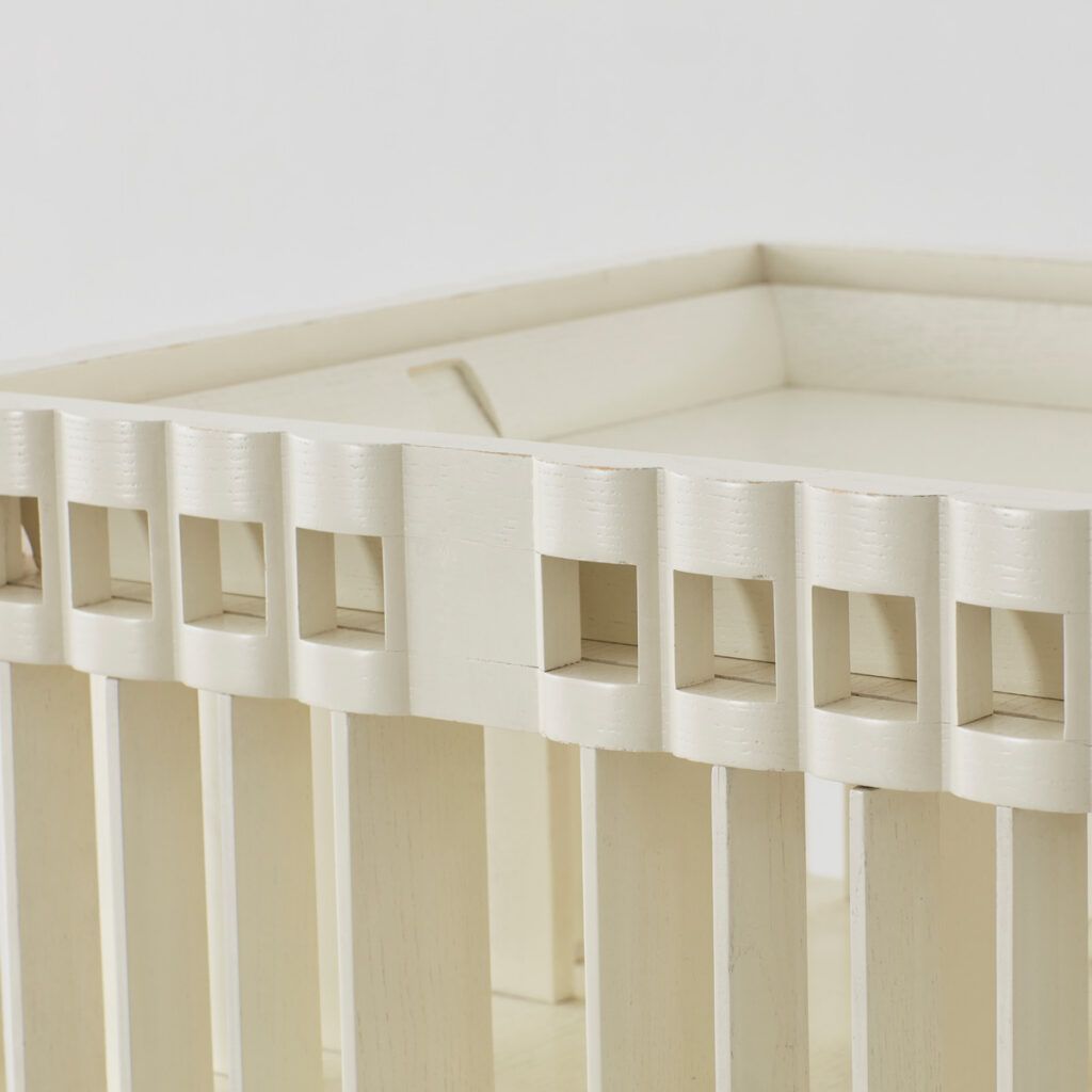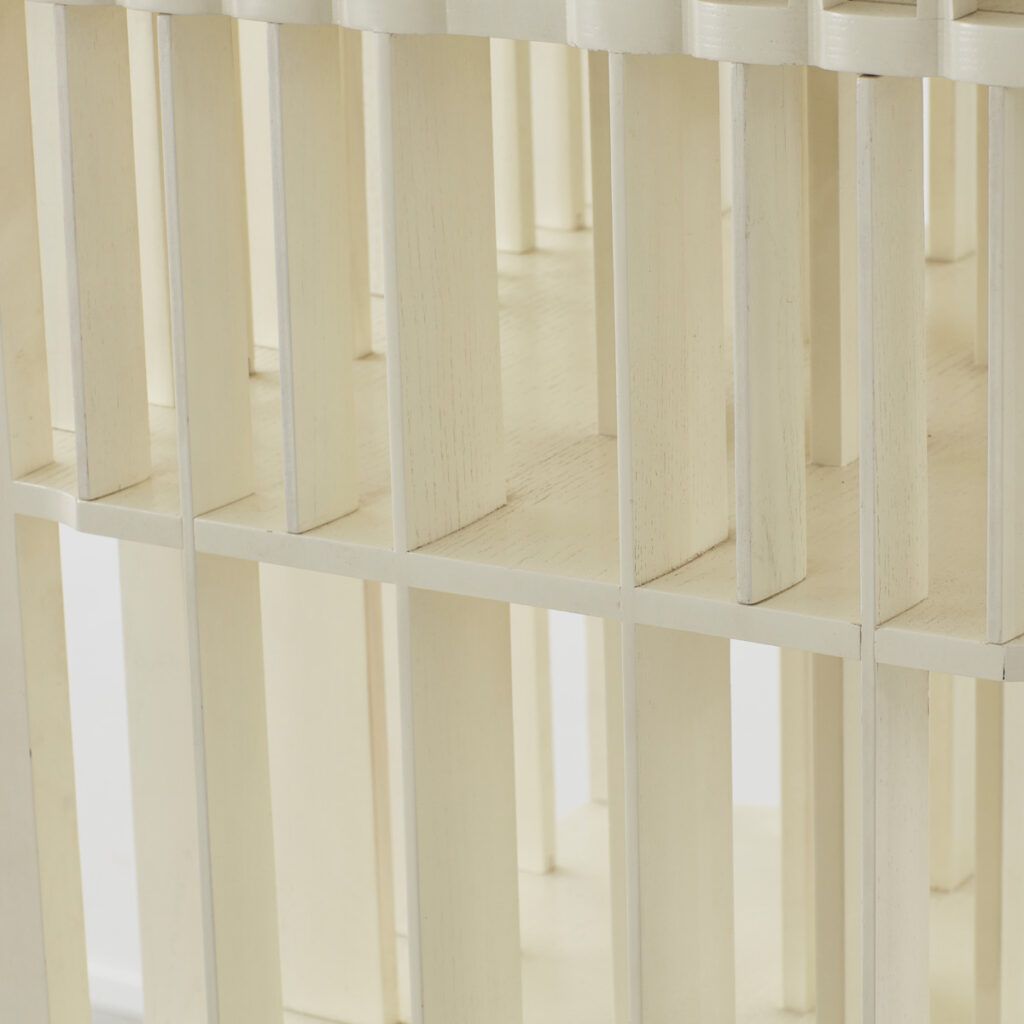This revolving bookcase was designed in 1904 for Hous’hill, a house at Nitshill in Glasgow. It is Mackintosh’s only revolving bookcase and was destined for the drawing room. The design is based on an organic principle, with the vertical divisions representing the boughs and branches of a tree which multiply at each shelf, ending in little painted squares which suggest blossom or leaves.