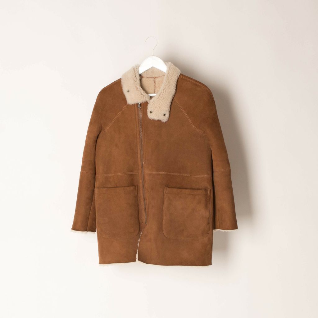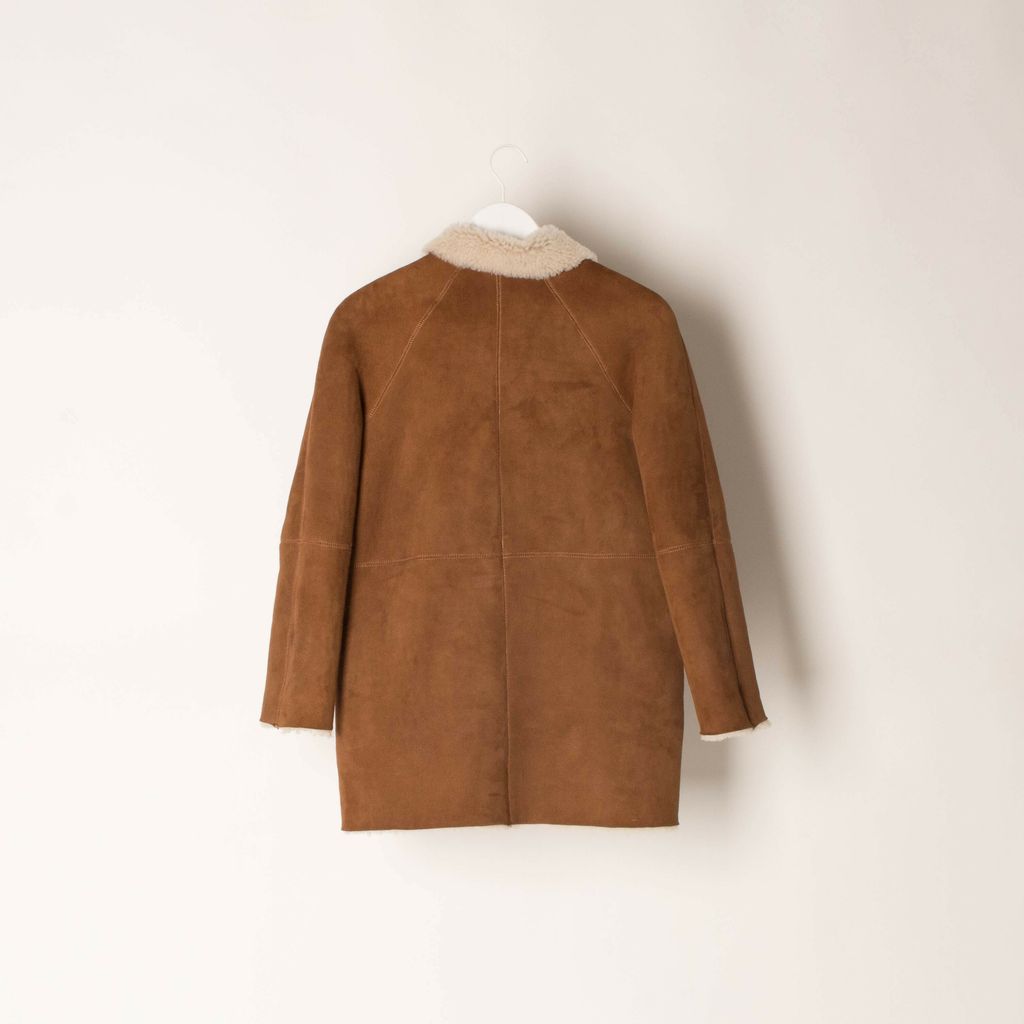 Have it both ways with this shearling and suede combo jacket. Wear either way. Features seam detailing, large pockets, zipper and snap closure.