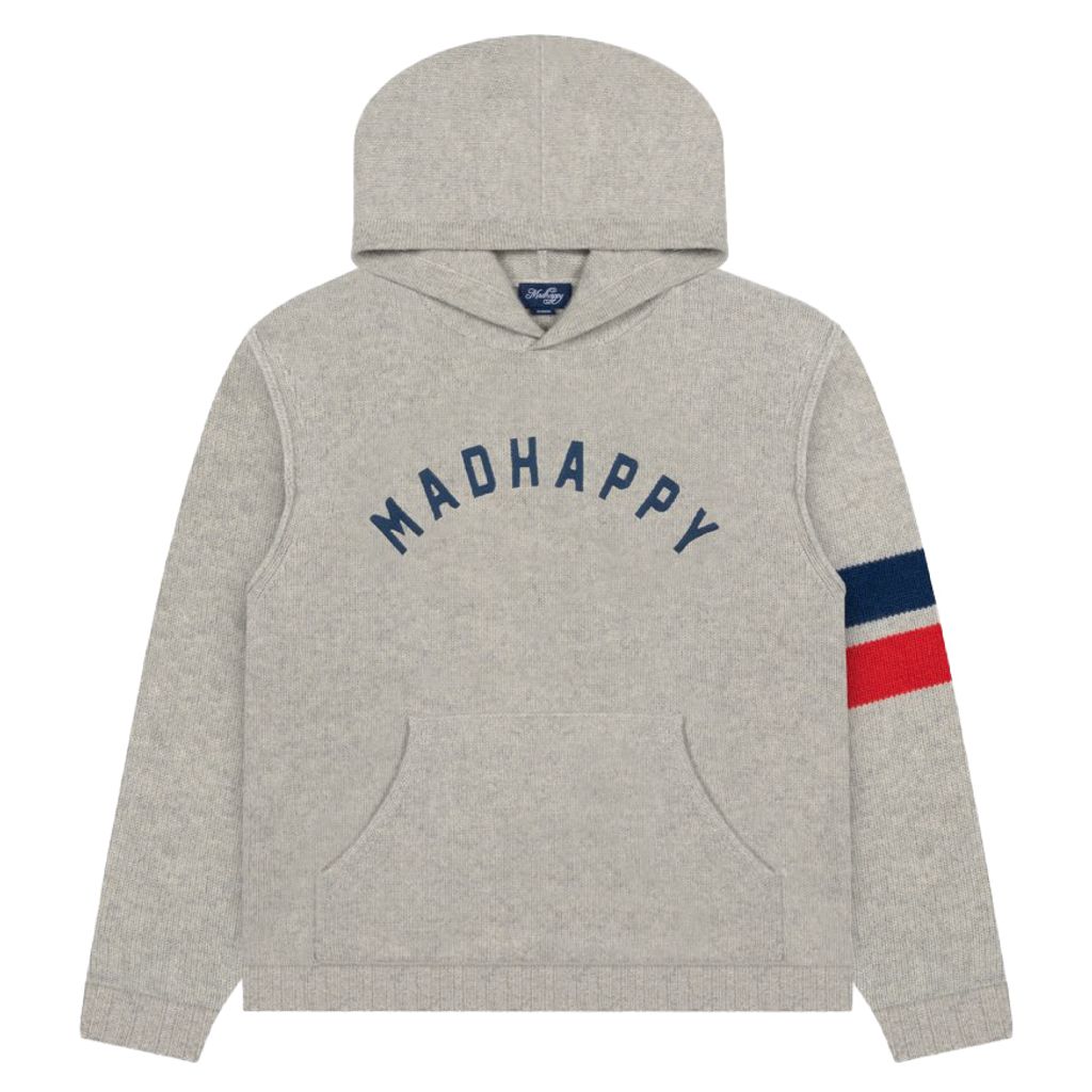Features "MADHAPPY" text on front and streaking blue and red bands on the arm