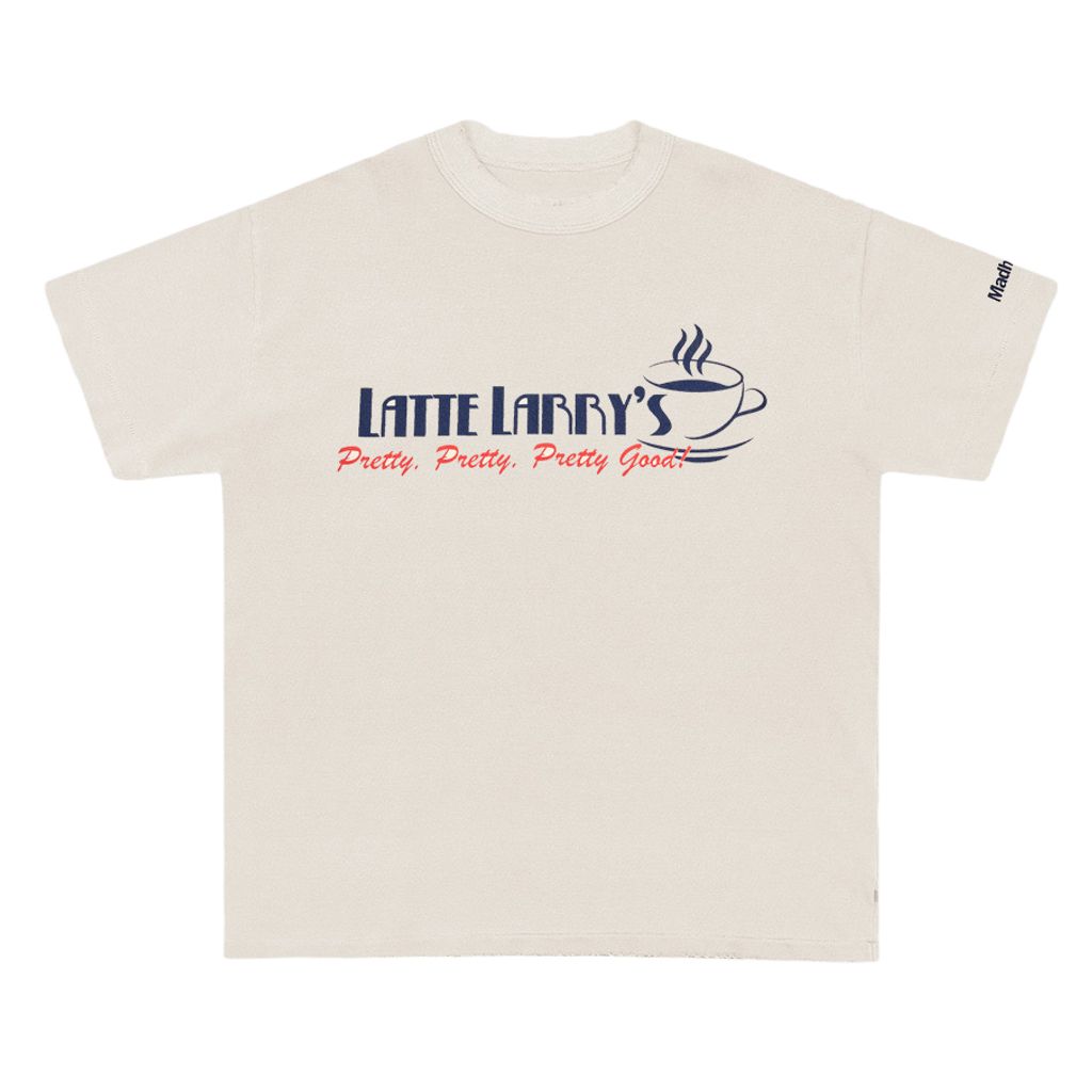 Features Latte Larry's text and coffee graphics on the front
