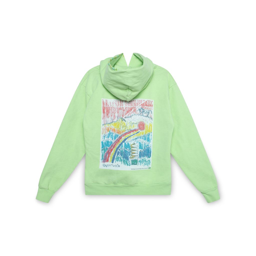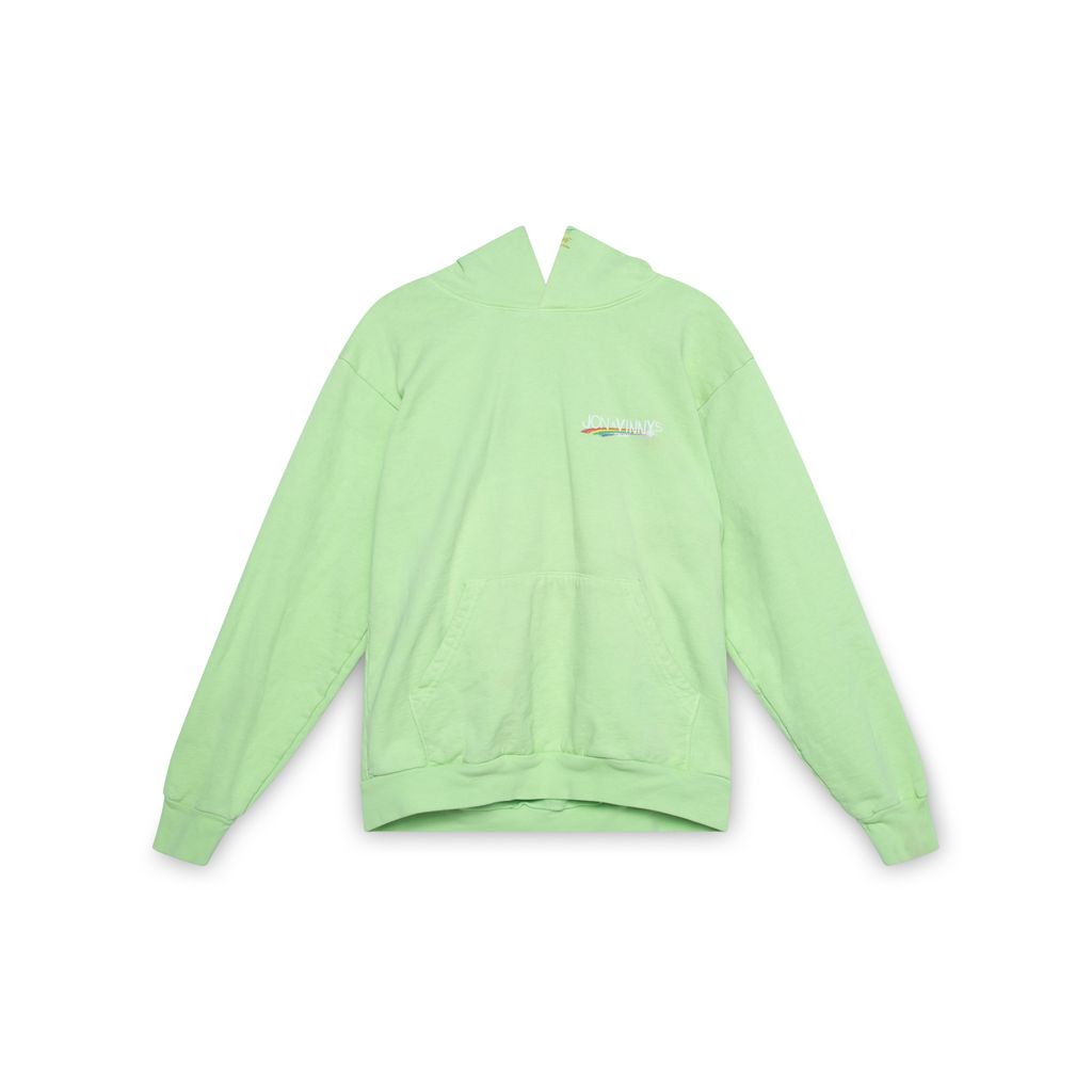 Madhappy x Jon & Vinnys hoodie features printed logo at front chest and back, kangaroo pocket at front, and embroidery detail at hood.