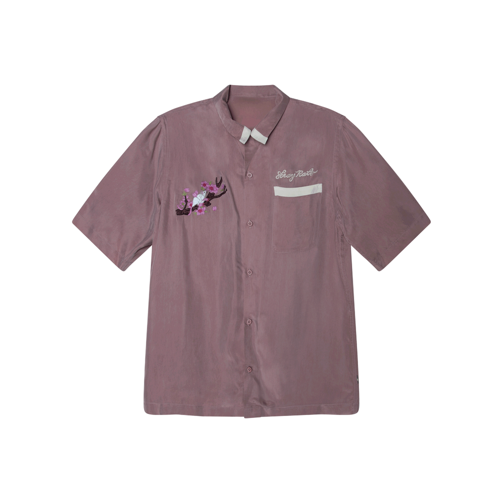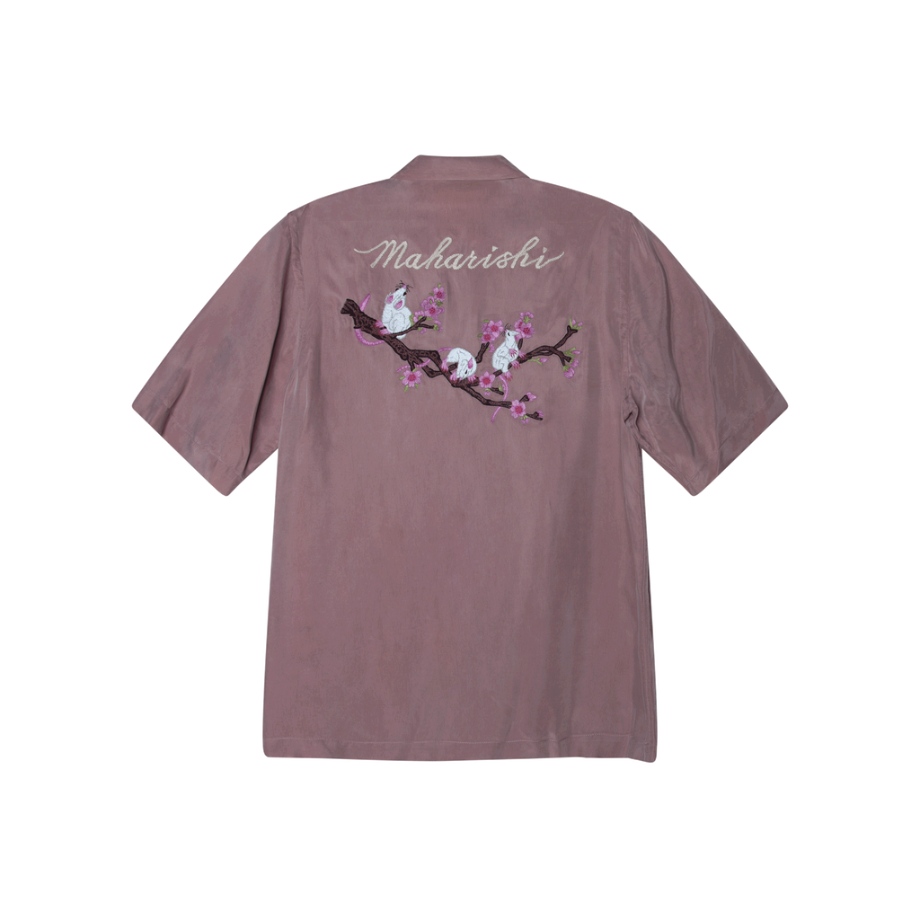 Maharishi x Stray Rats Vacation Shirt features Sukajan-inspired blossom embroidery on front and back, camp collar, front button closure, and chest patch pocket.