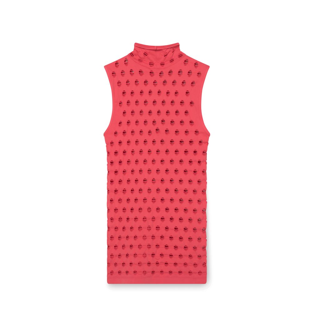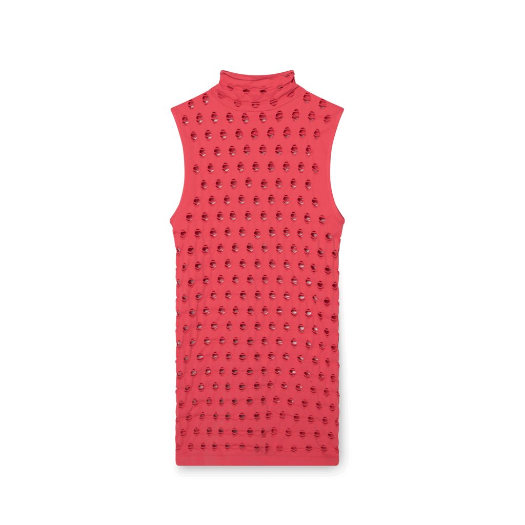 Maisie Wilen Red Perforated Sleeveless Turtleneck features cut out detailing.