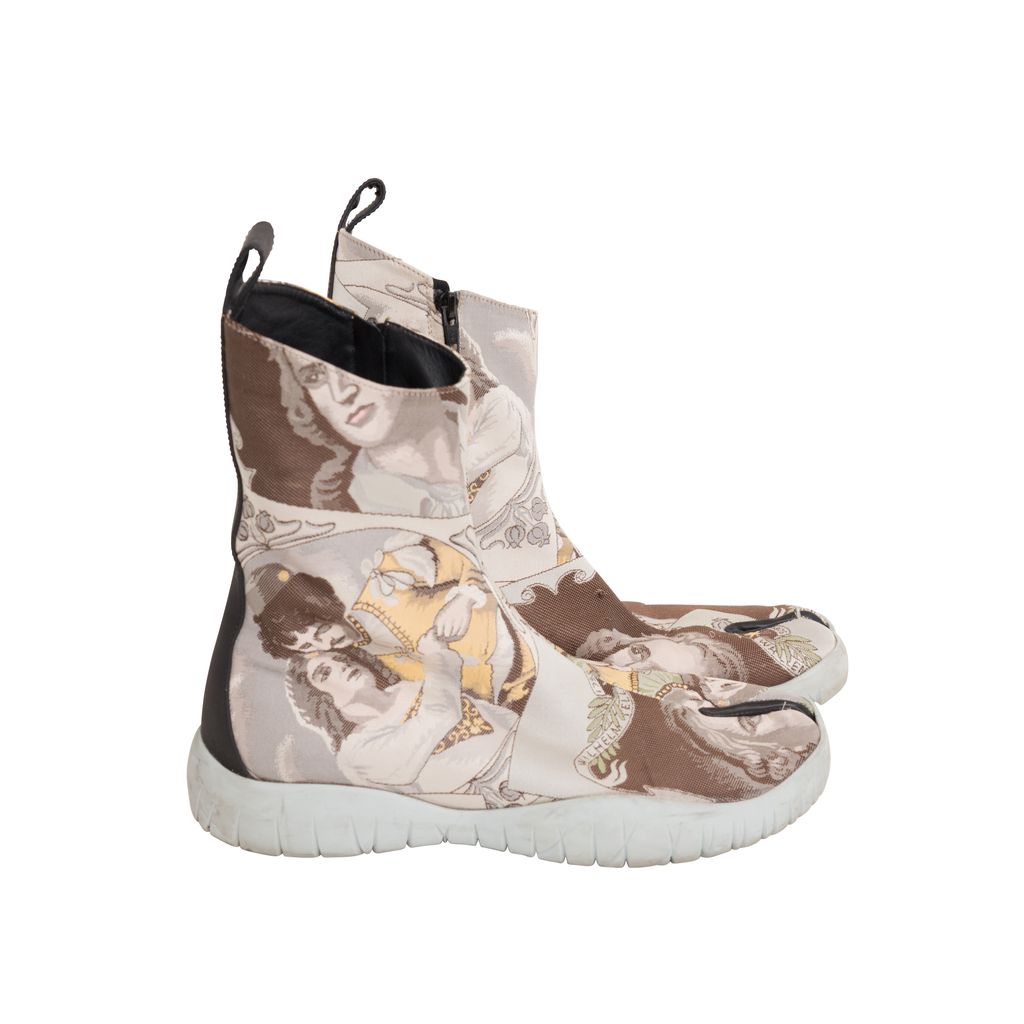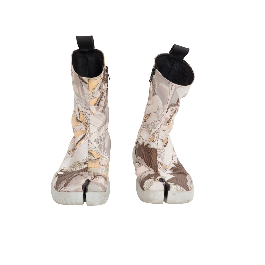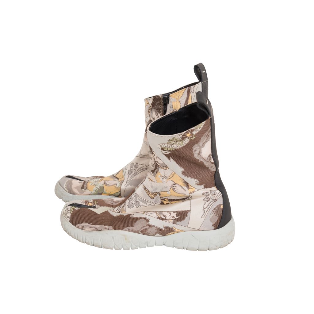 Maison Margiela Jacquard Tabi Boots features jacquard pattern throughout, rubber sole, zipper on inside leg, black lining on inside toe.