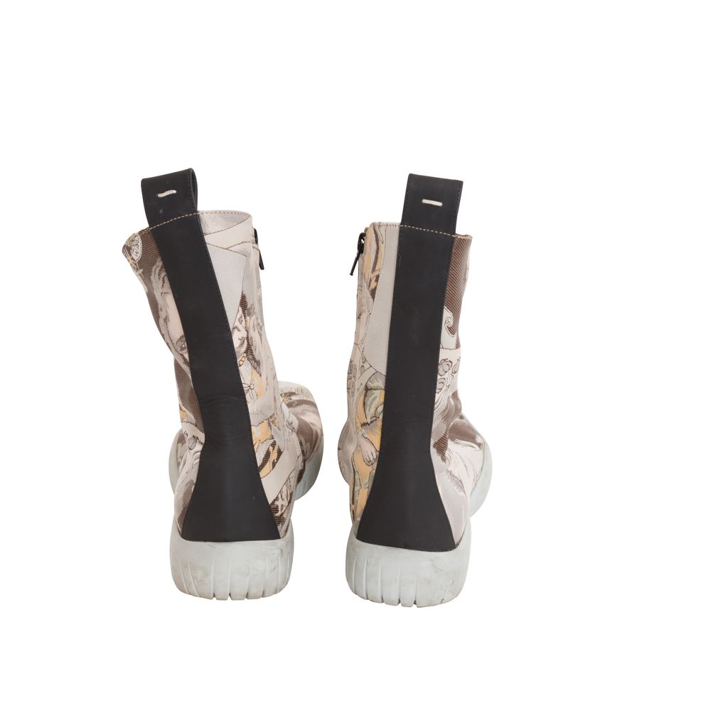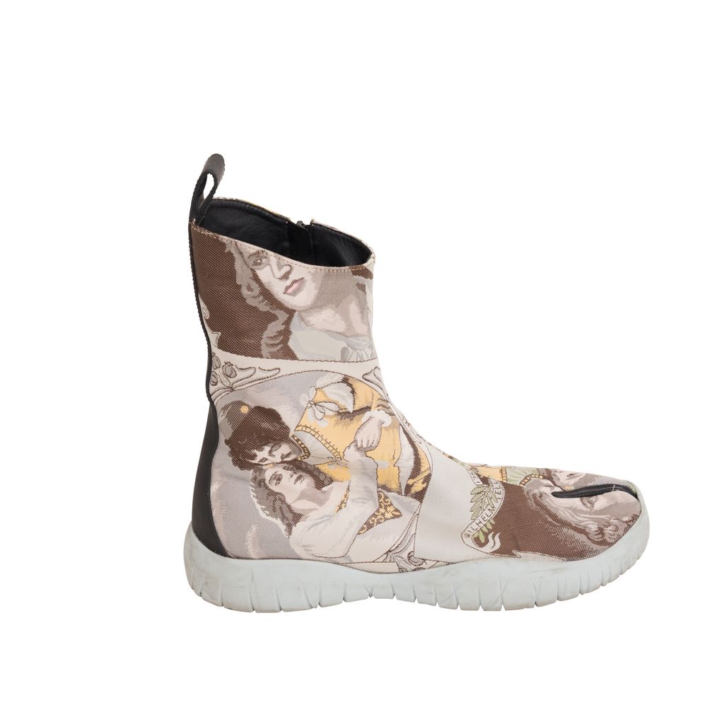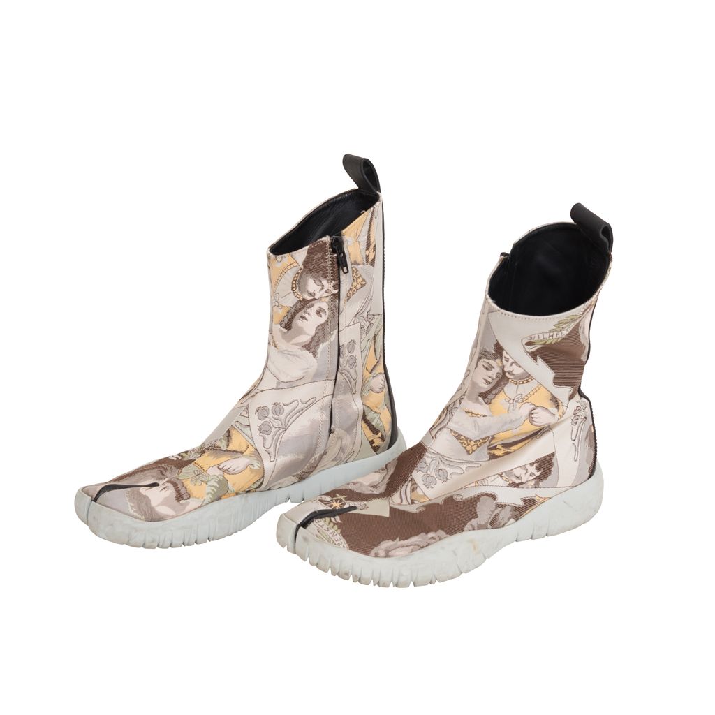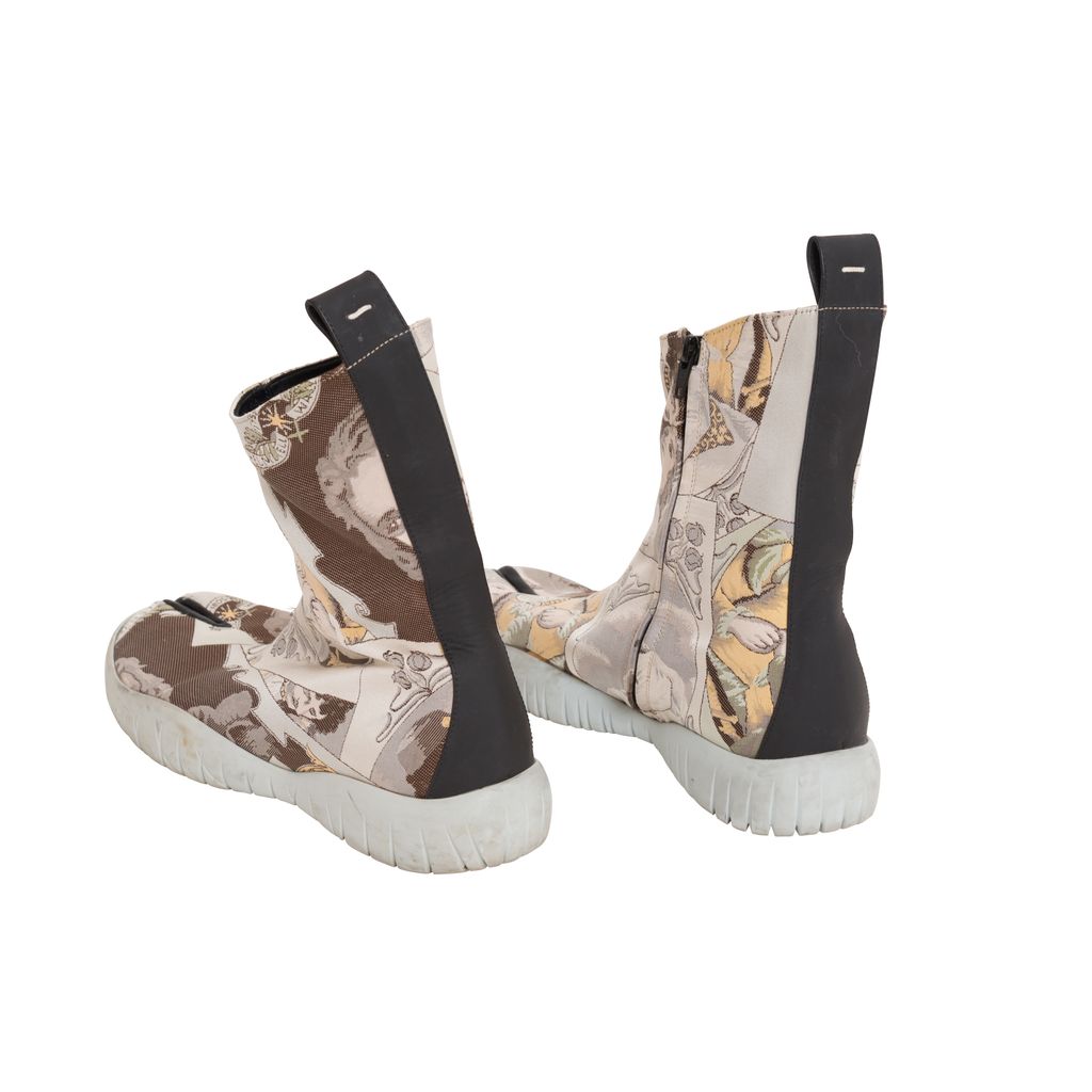 Maison Margiela Jacquard Tabi Boots features jacquard pattern throughout, rubber sole, zipper on inside leg, black lining on inside toe.