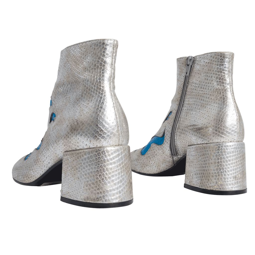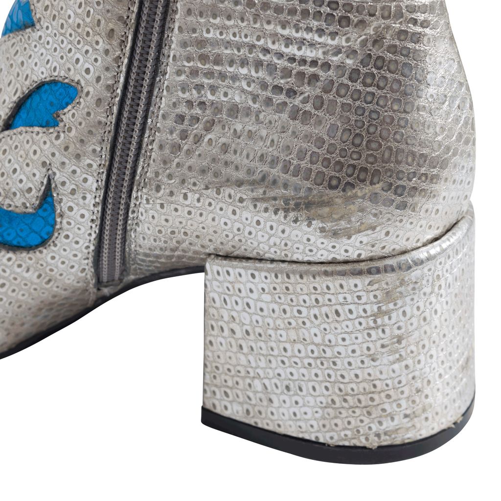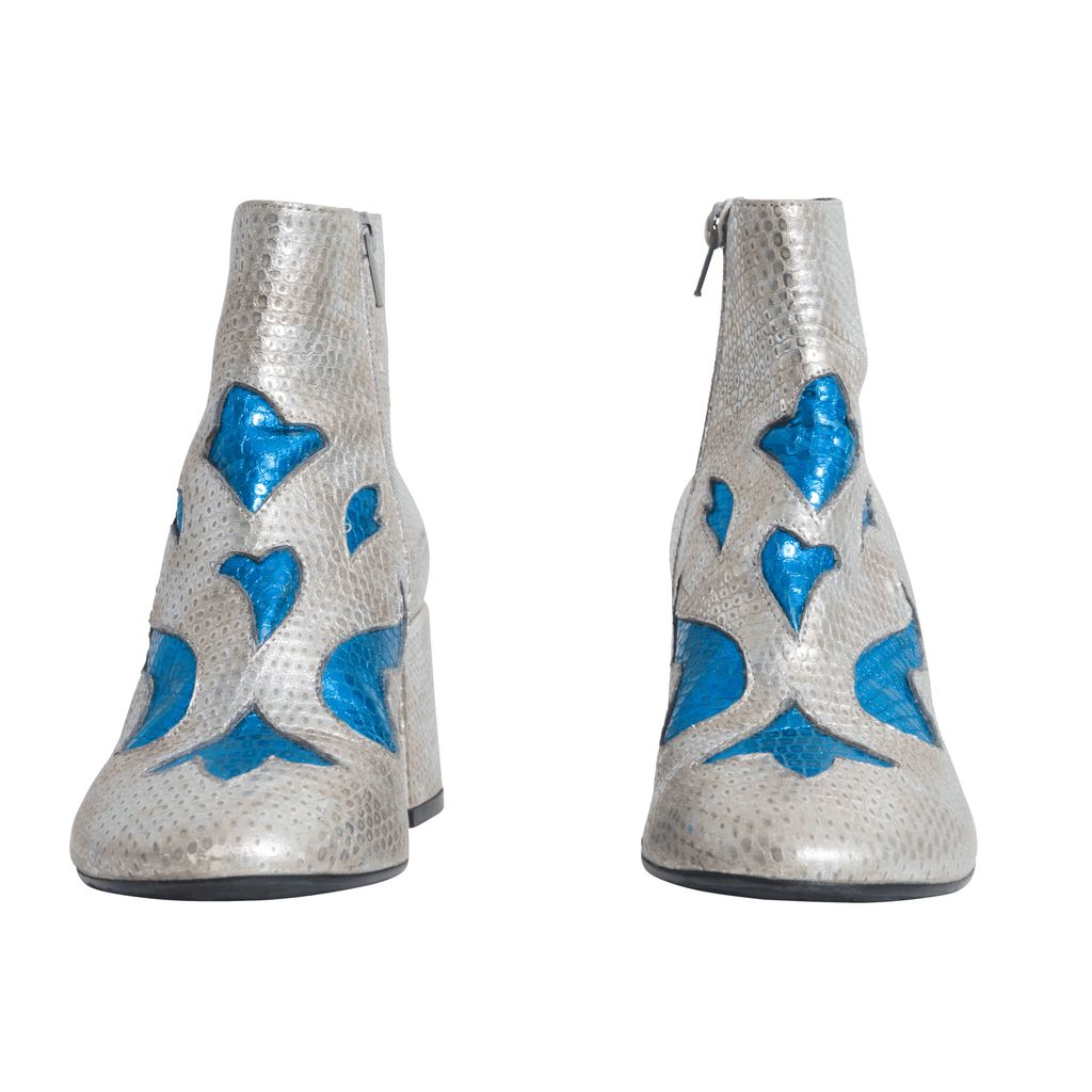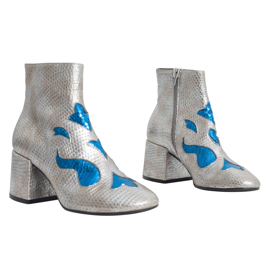 These ankle boots have a snake-skin look to them, with blue cowboy boot inspired trim down the shoe and close to the toes. Zipper for a comfortable fit.