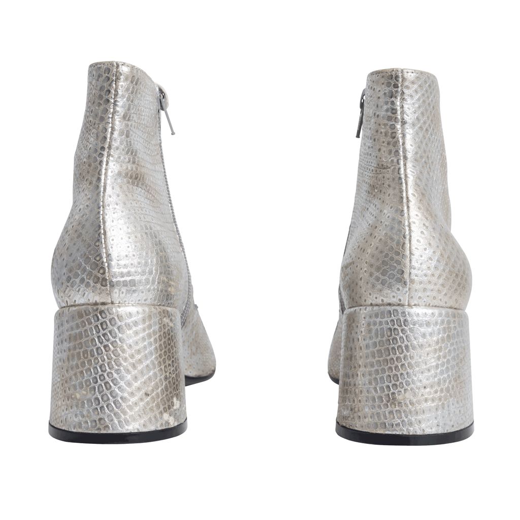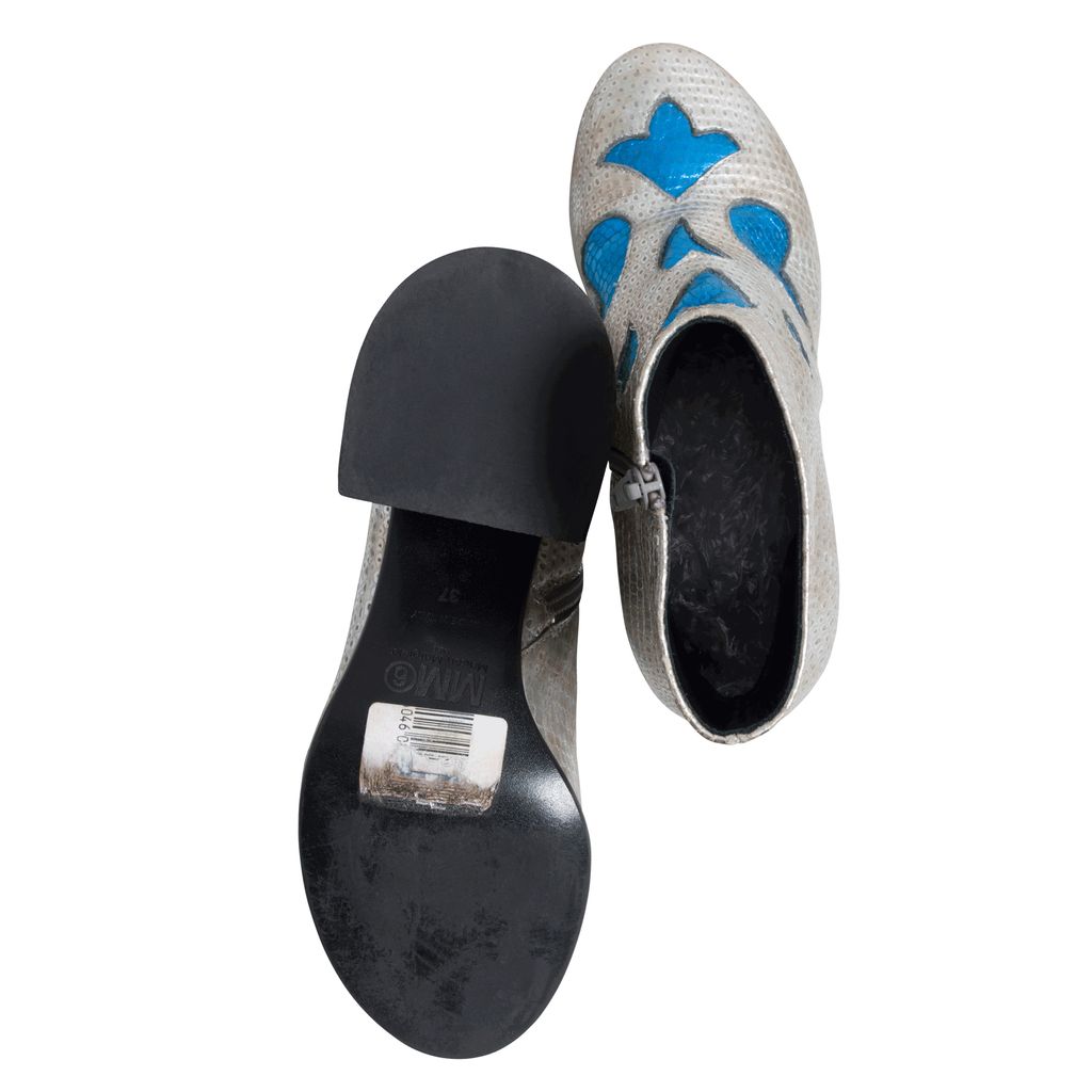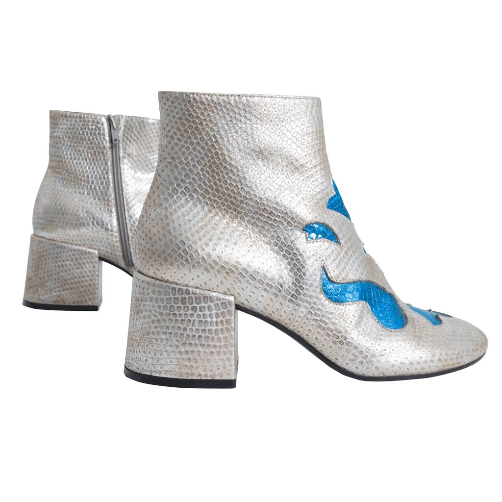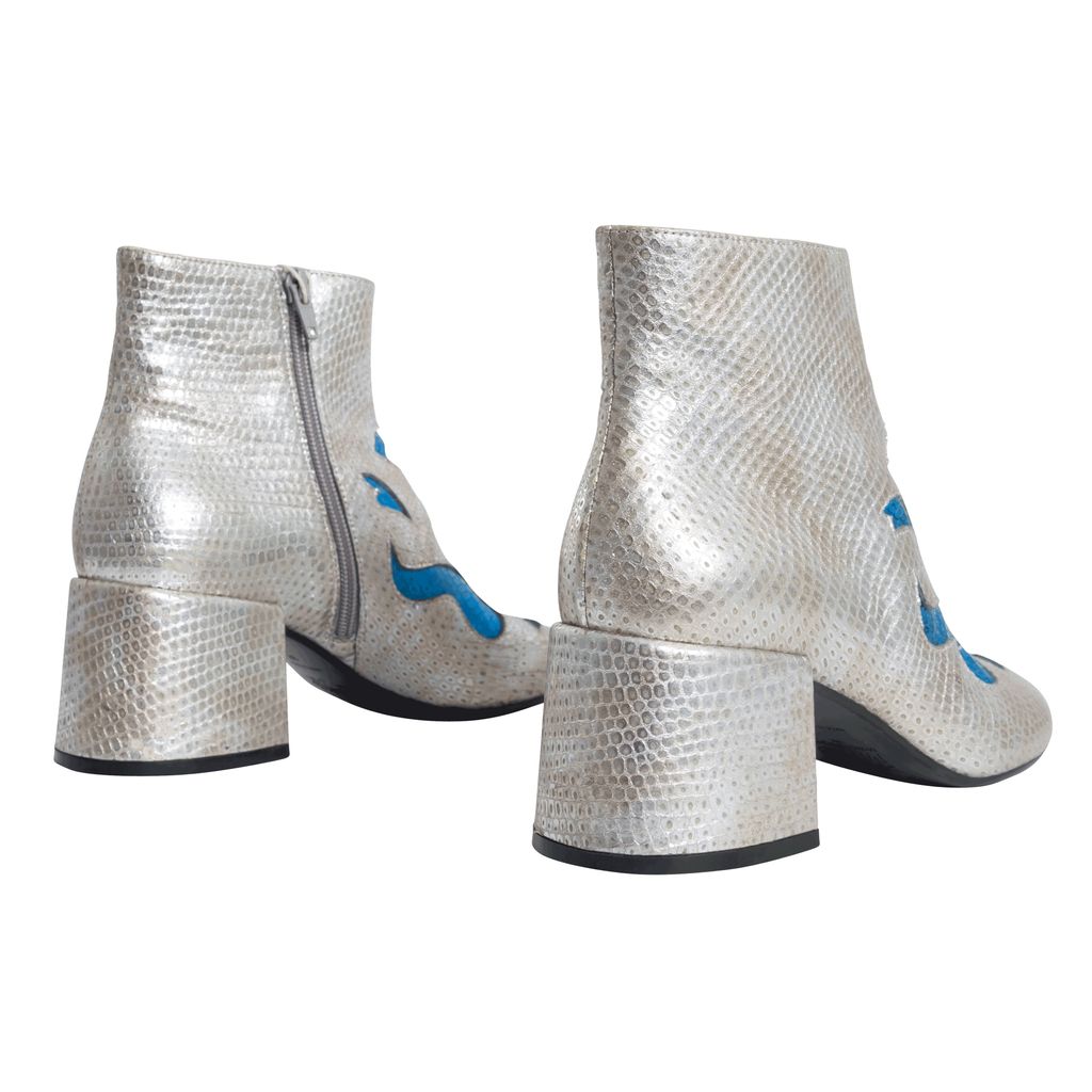 These ankle boots have a snake-skin look to them, with blue cowboy boot inspired trim down the shoe and close to the toes. Zipper for a comfortable fit.