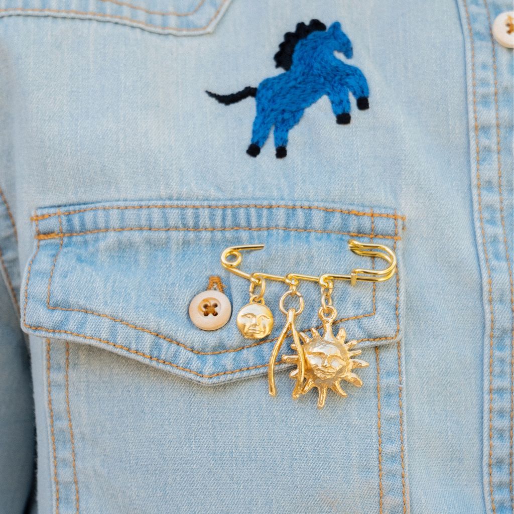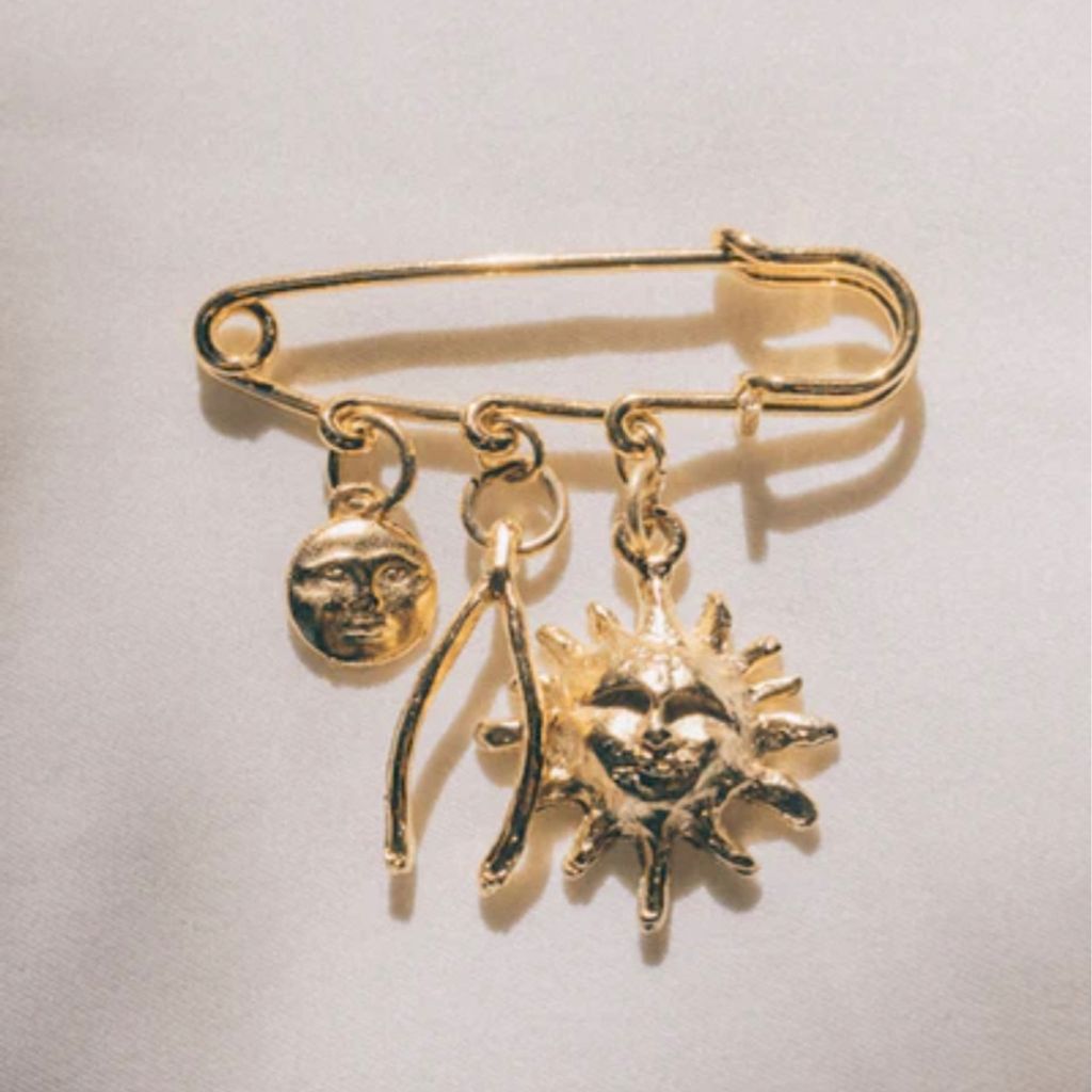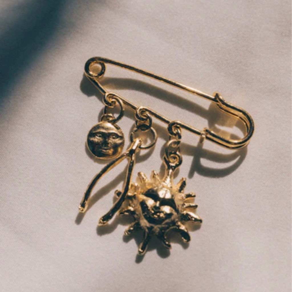 14k gold plated brooch in a shape of a pin. 2" length. Features symbols of sun, moon, and wishbone.