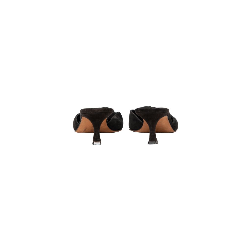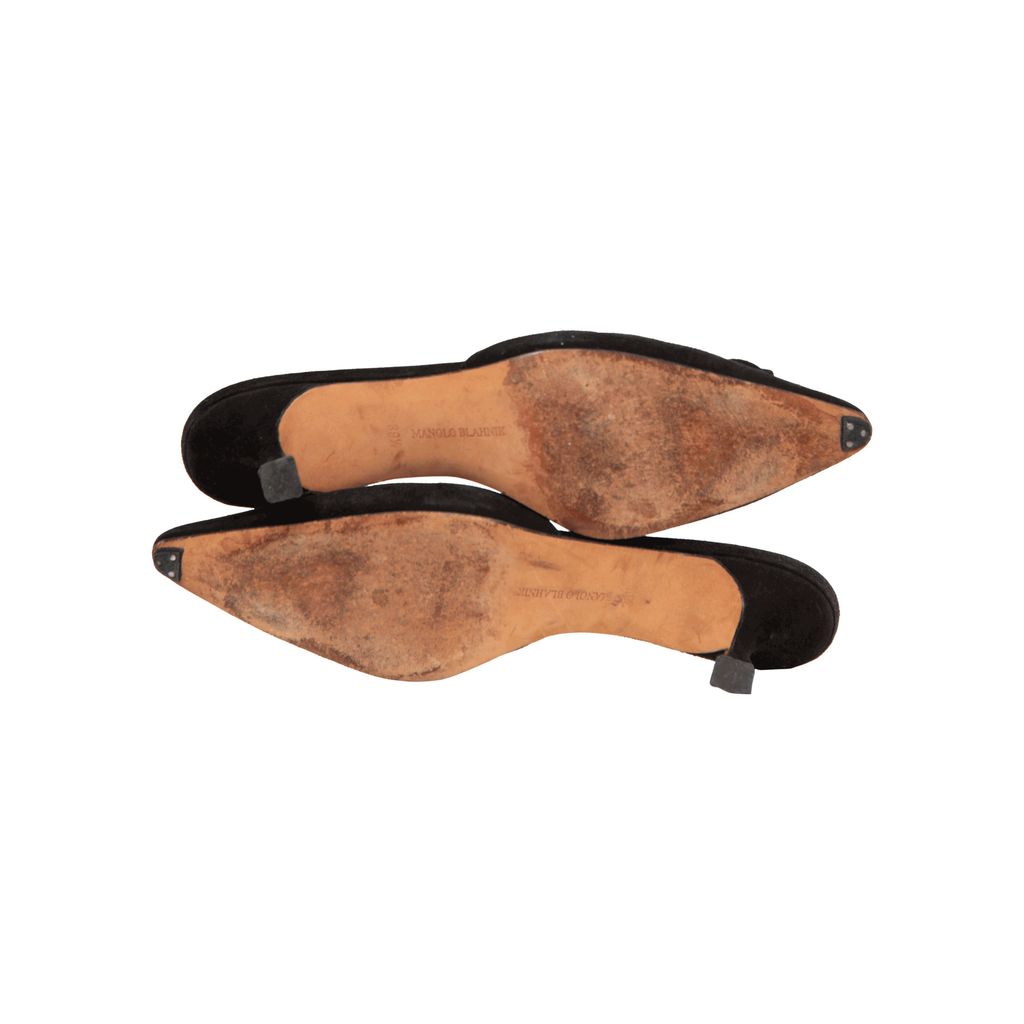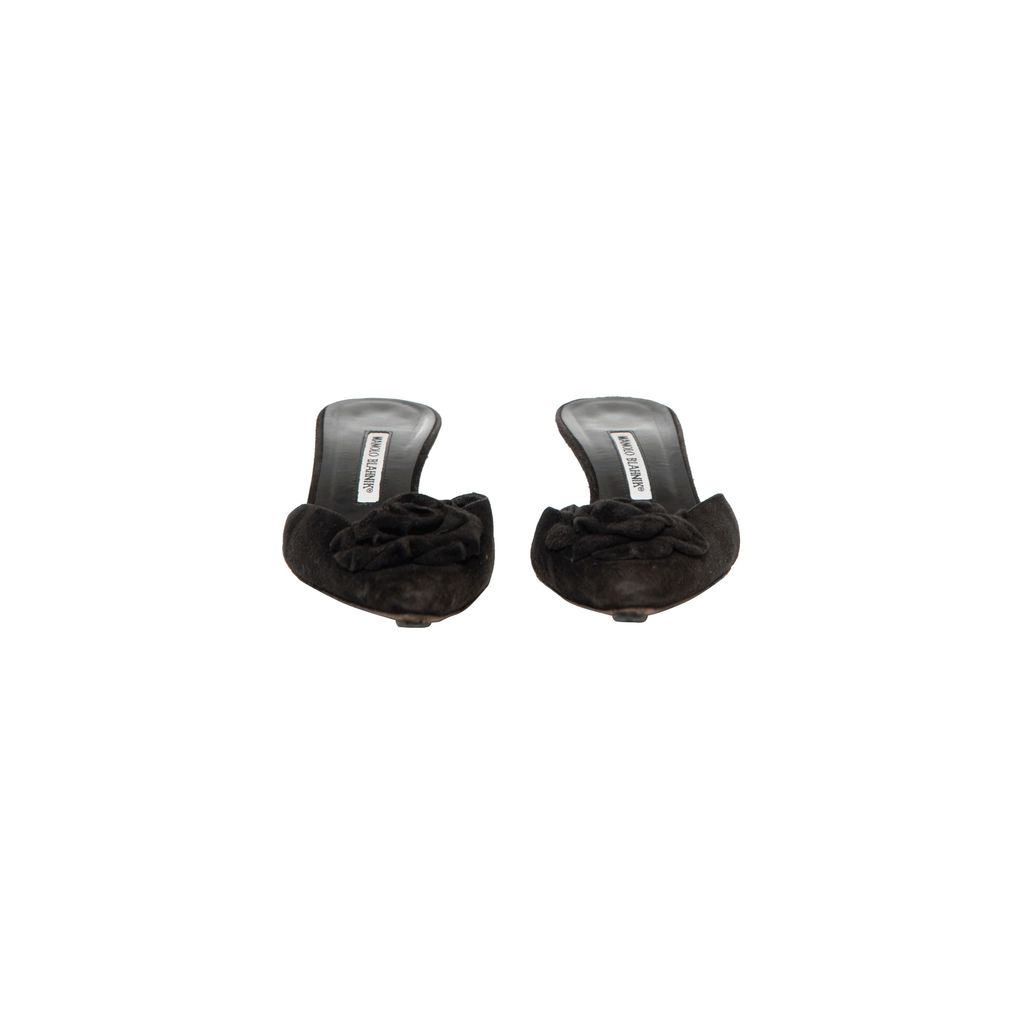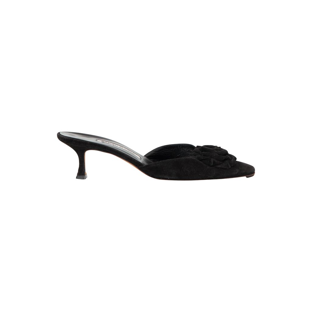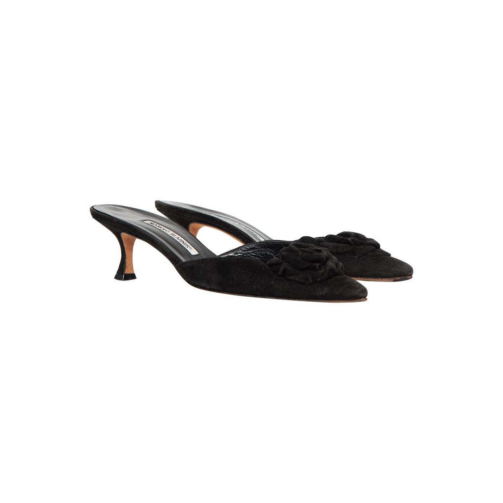 Manolo Blahnik Kitten Heels features floral ribbon at toes, slip on fit.