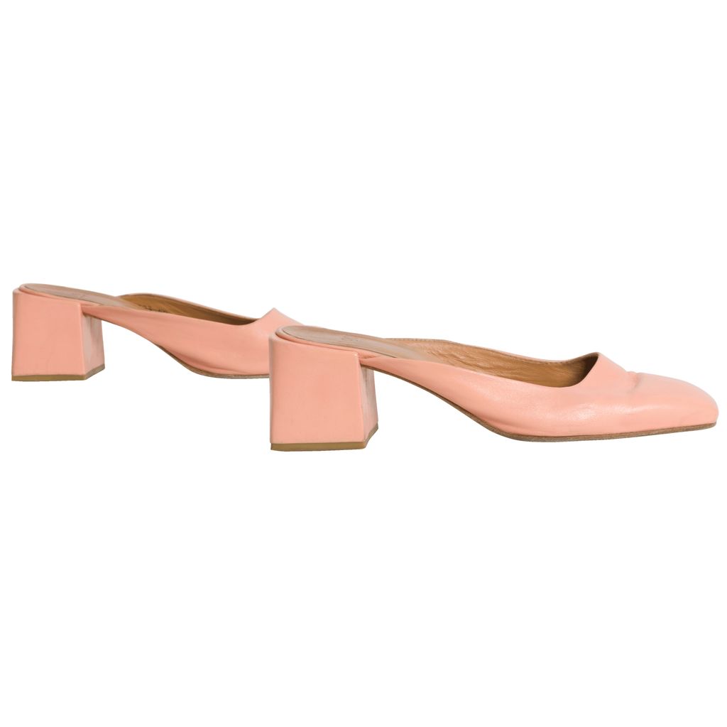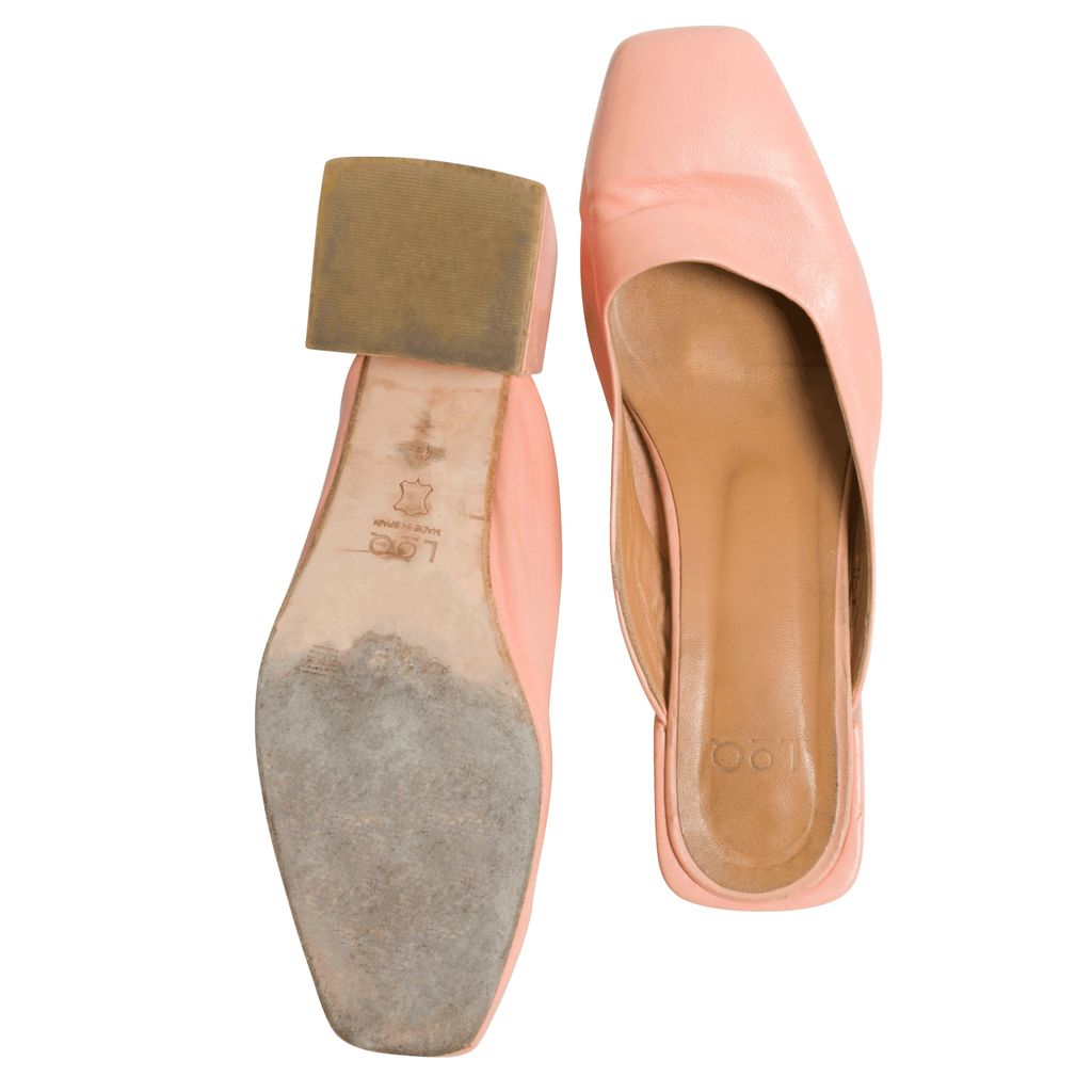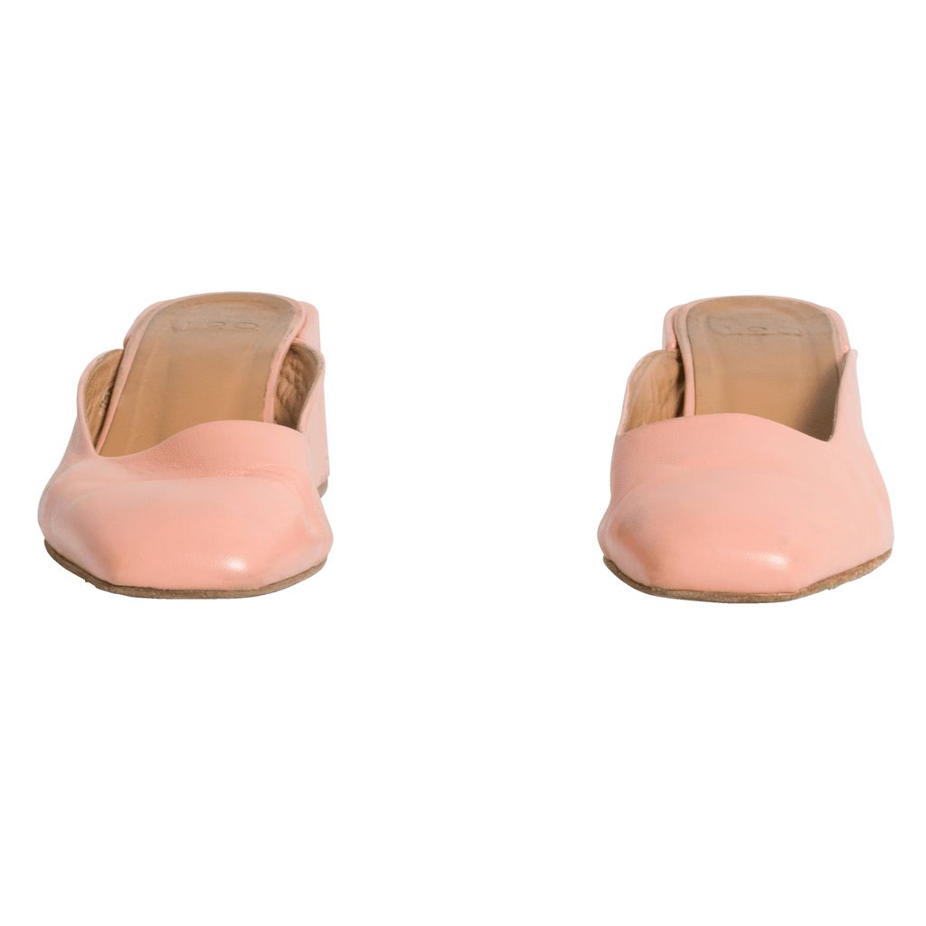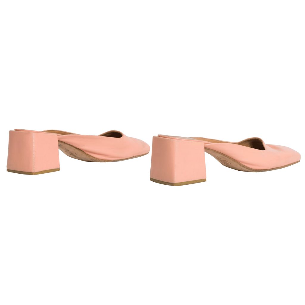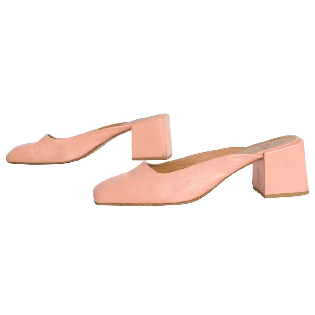 Pink suede mules. 1.75 inch heels. Please note mild discoloration.
