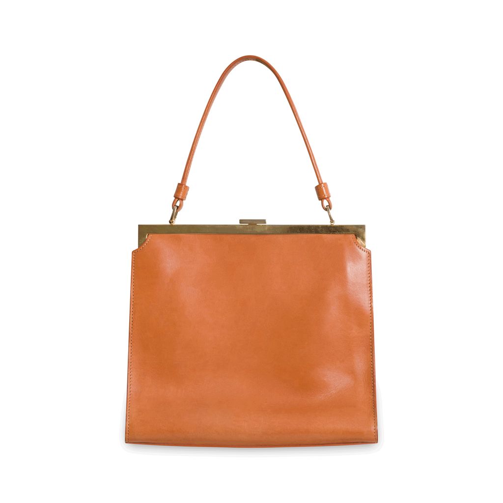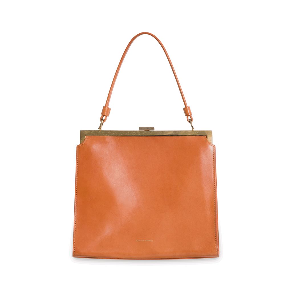 Mansur Gavriel Elegant Bag in Cammello features gold-plating and fastening clip.