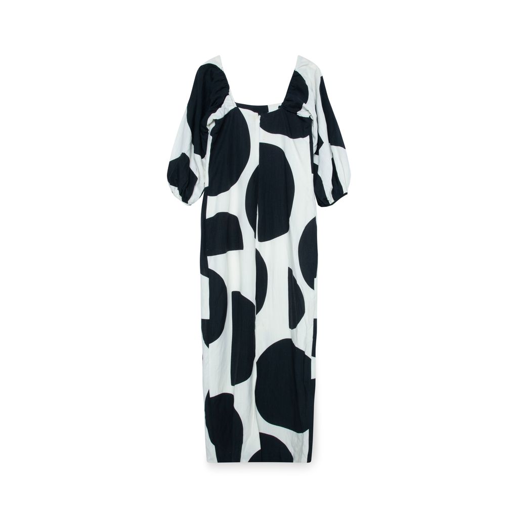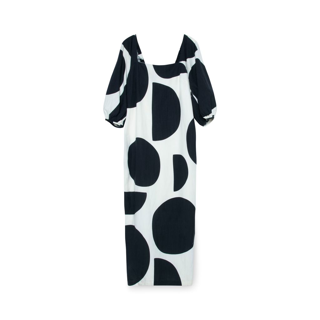 Mara Hoffman Genevieve Linen Dress features puff sleeves, off-shoulder neckline, and black printed cotton.