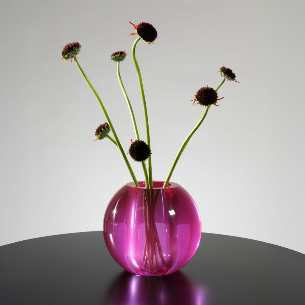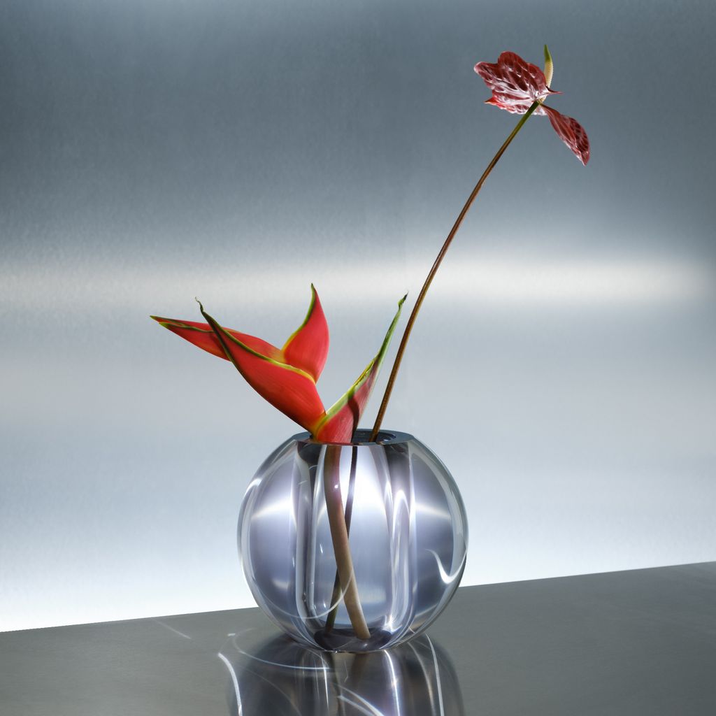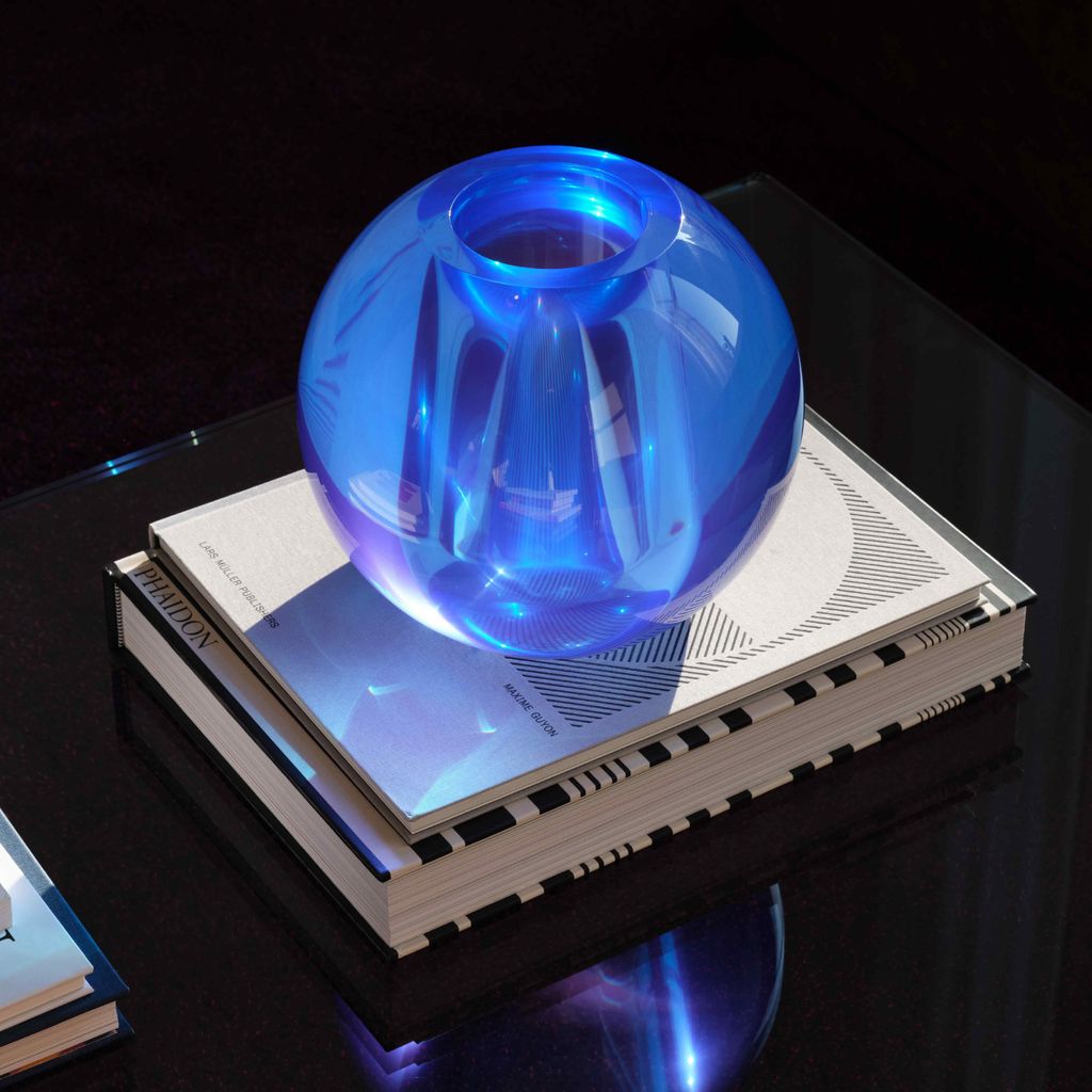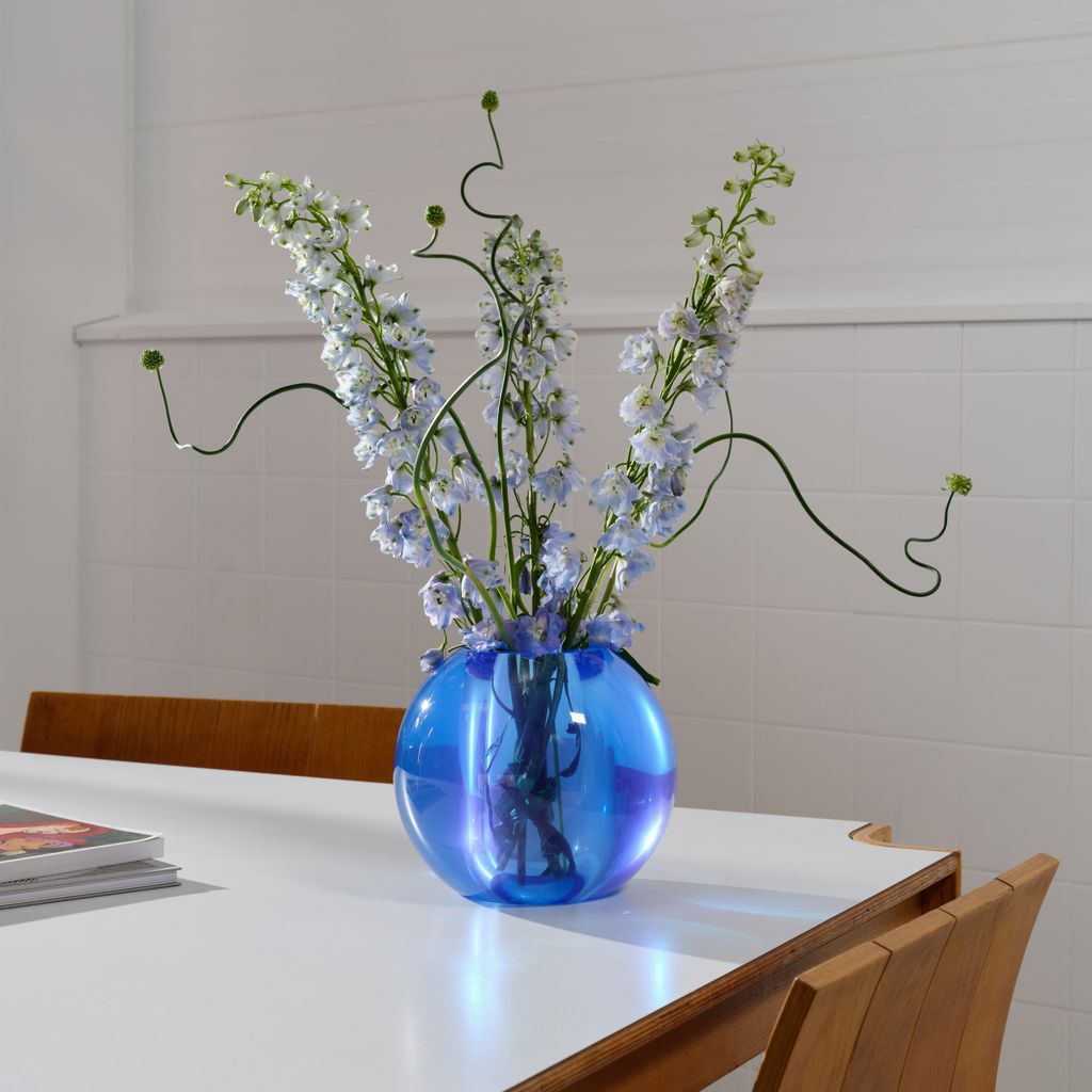 A translucent orb-shaped vase made to elevate your flowers. Smooth, ultra-glossy, and playful like a glass marble, it’s available in four dynamic colours that change with light and the blooms it holds.