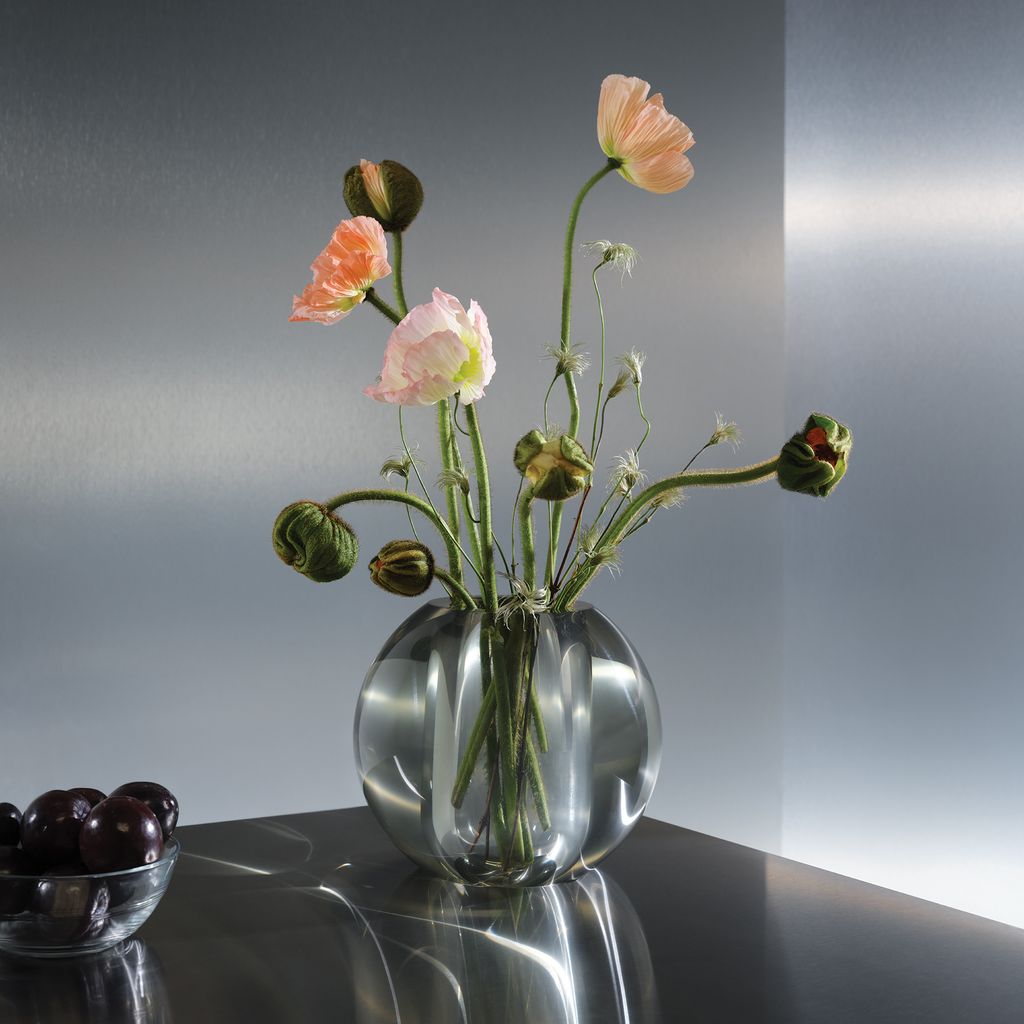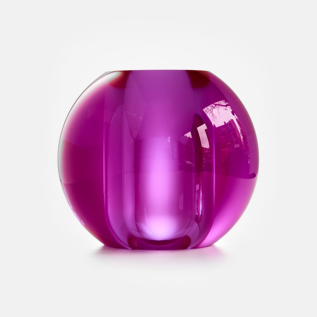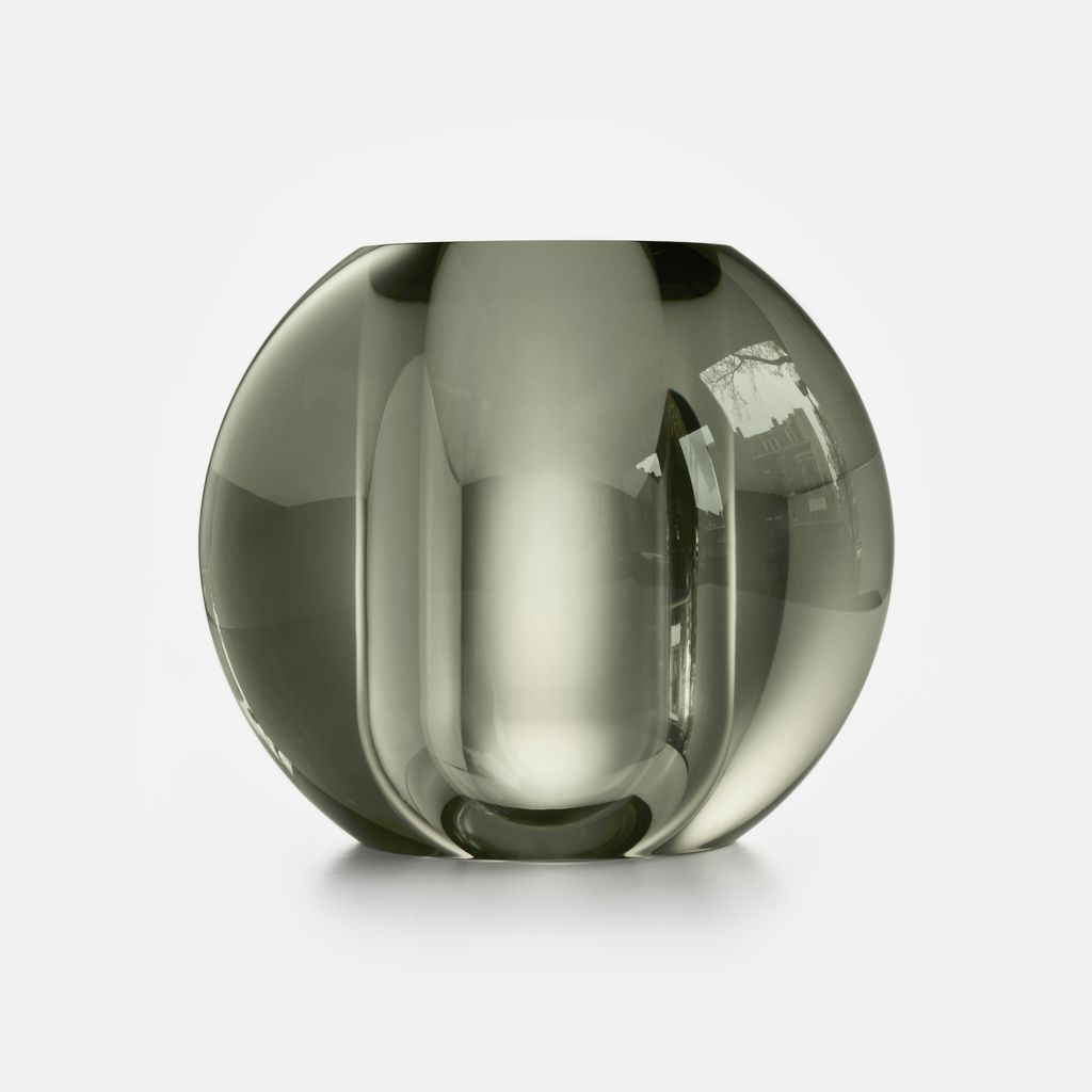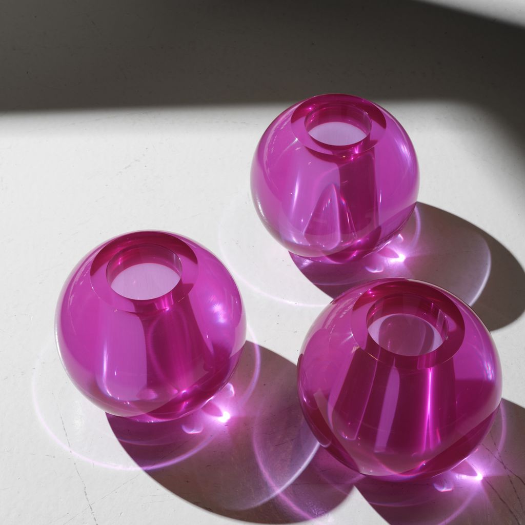 A translucent orb-shaped vase made to elevate your flowers. Smooth, ultra-glossy, and playful like a glass marble, it’s available in four dynamic colours that change with light and the blooms it holds.