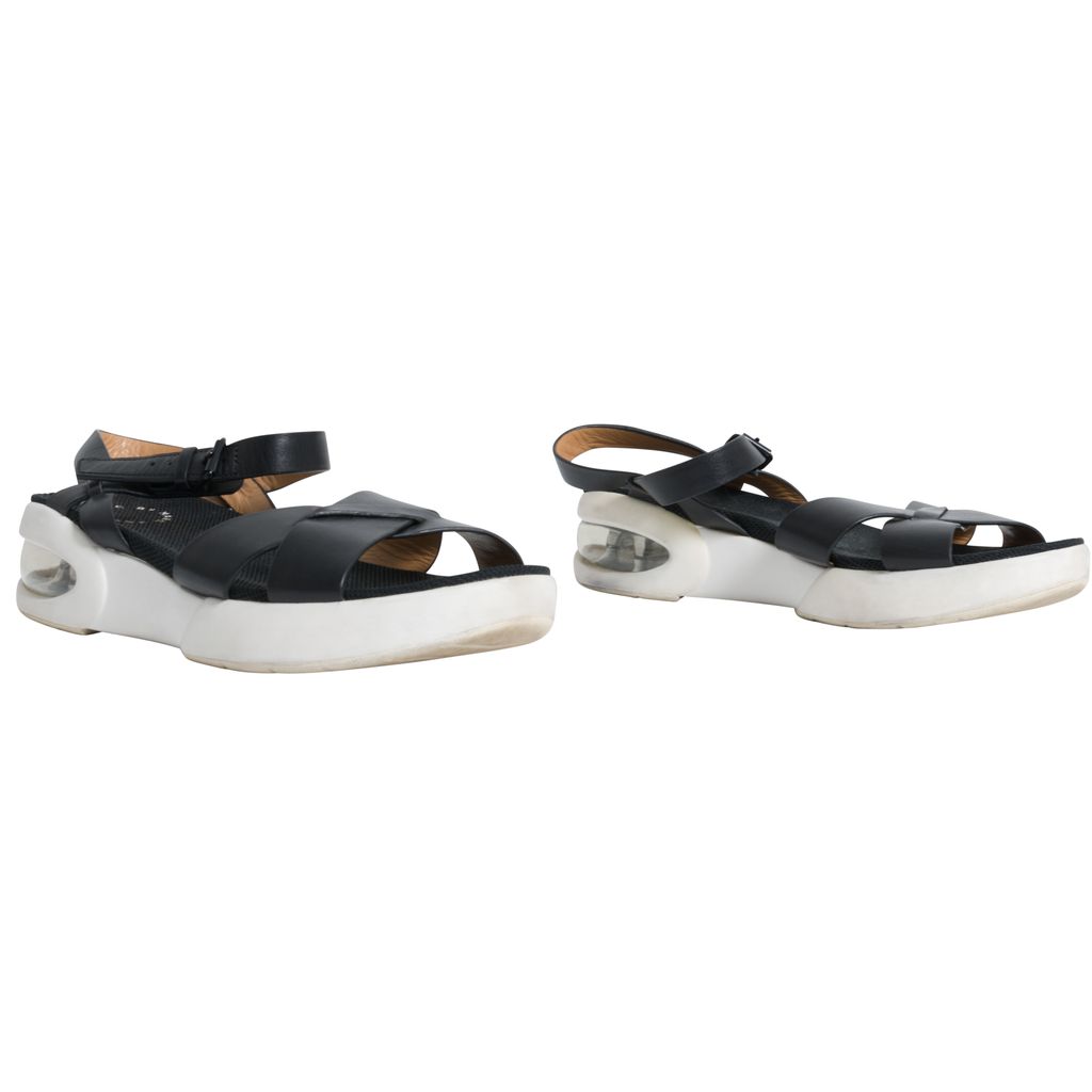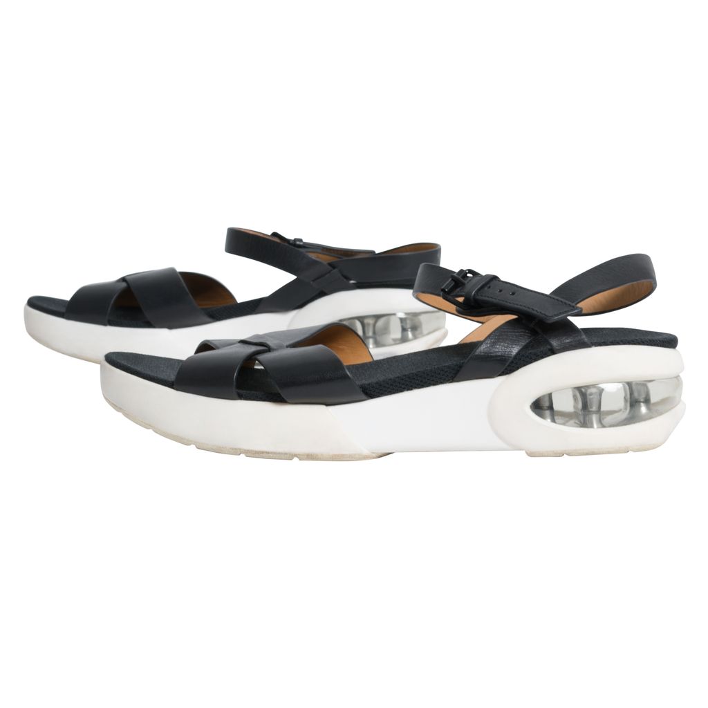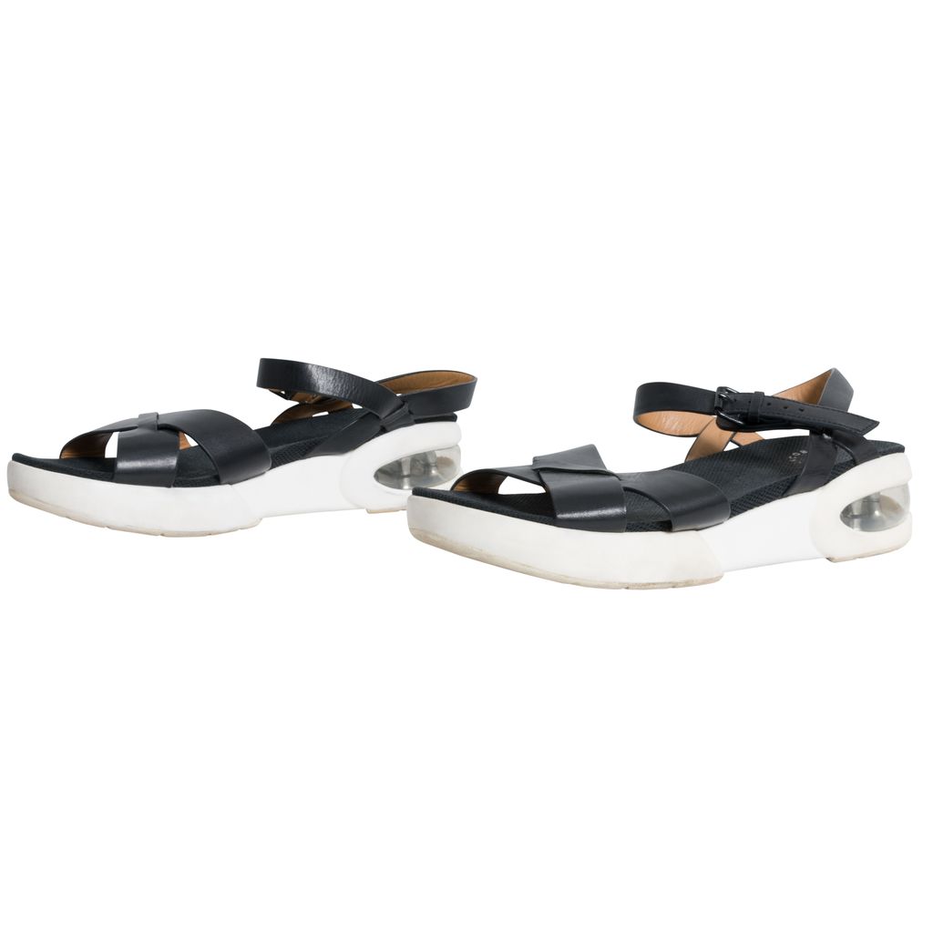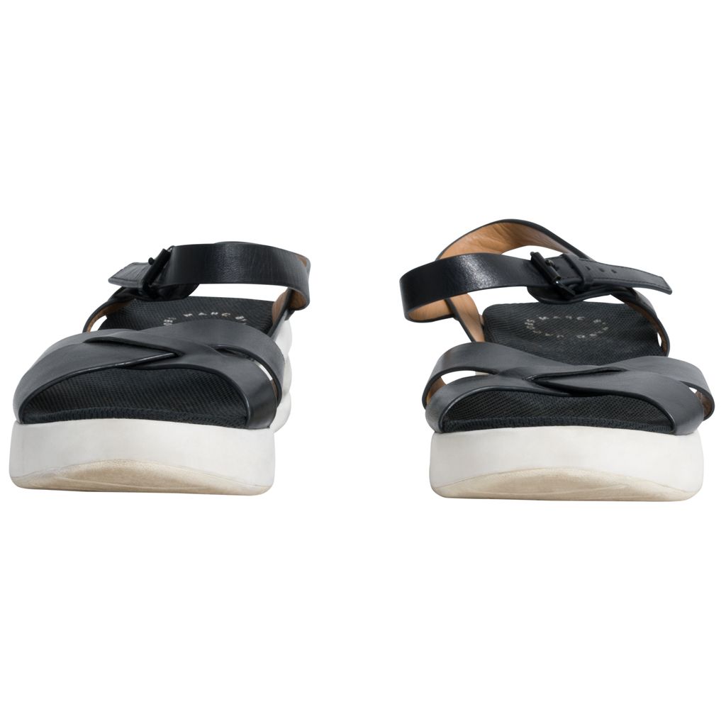 These sporty leather sandals from Marc by Marc Jacobs are styled with criss-cross straps at the toes and feature ankle straps with tonal buckle closures and cushioned rubber sole with transparent PVC panel. In good condition. Moderate discoloration on platform and sole.