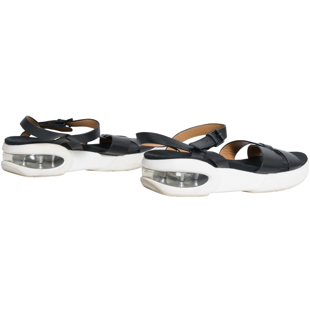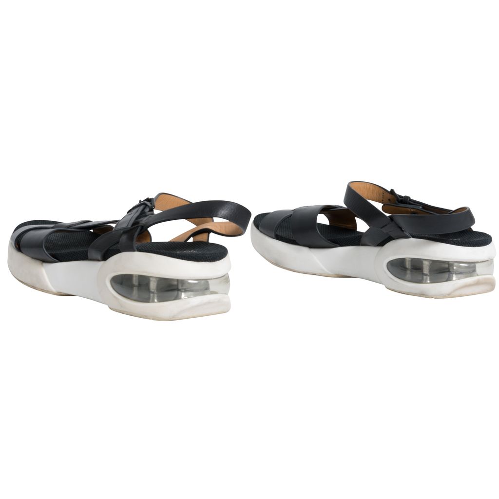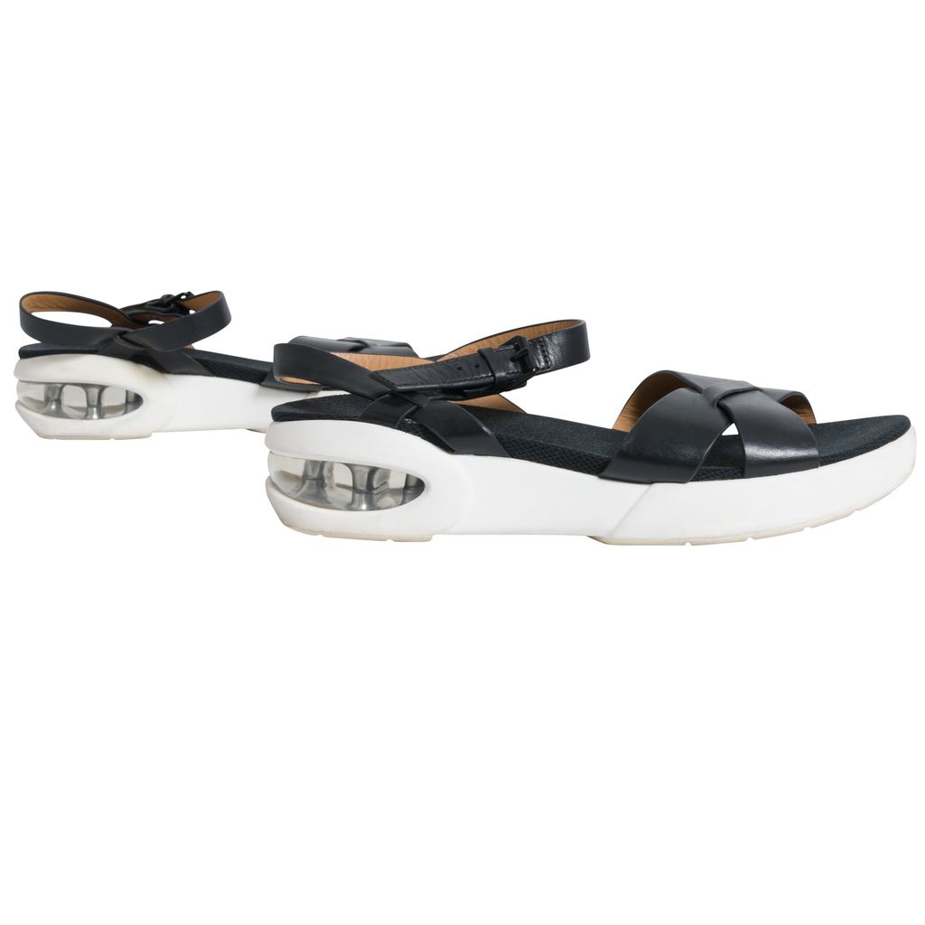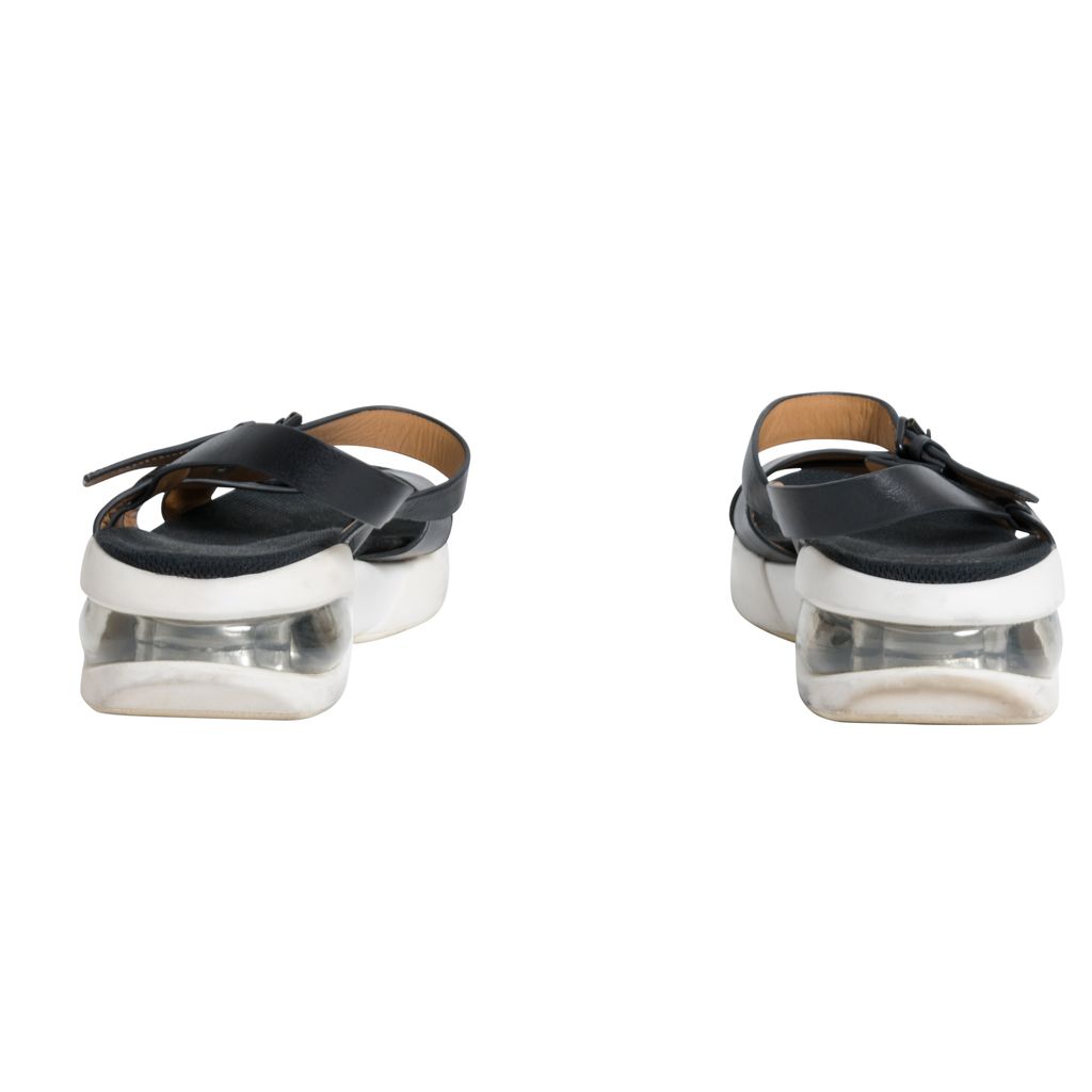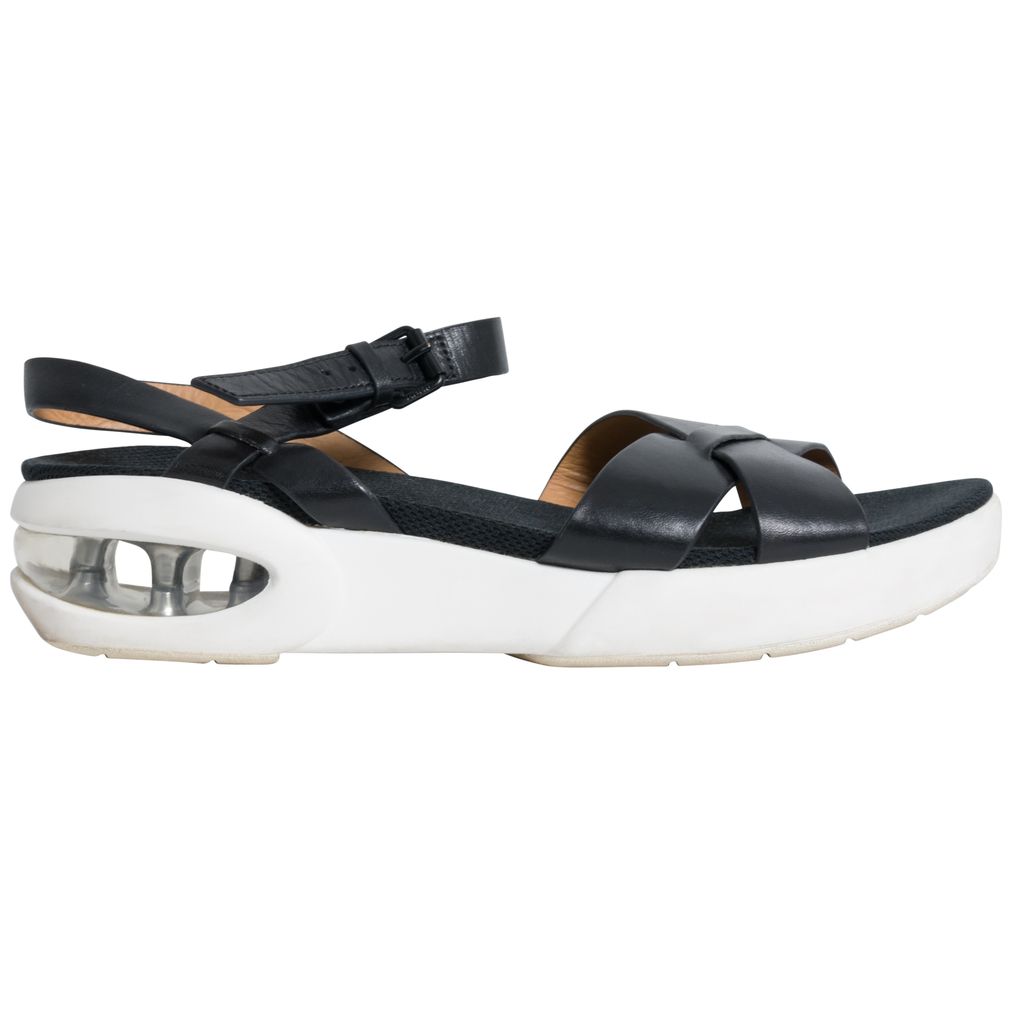 These sporty leather sandals from Marc by Marc Jacobs are styled with criss-cross straps at the toes and feature ankle straps with tonal buckle closures and cushioned rubber sole with transparent PVC panel. In good condition. Moderate discoloration on platform and sole.