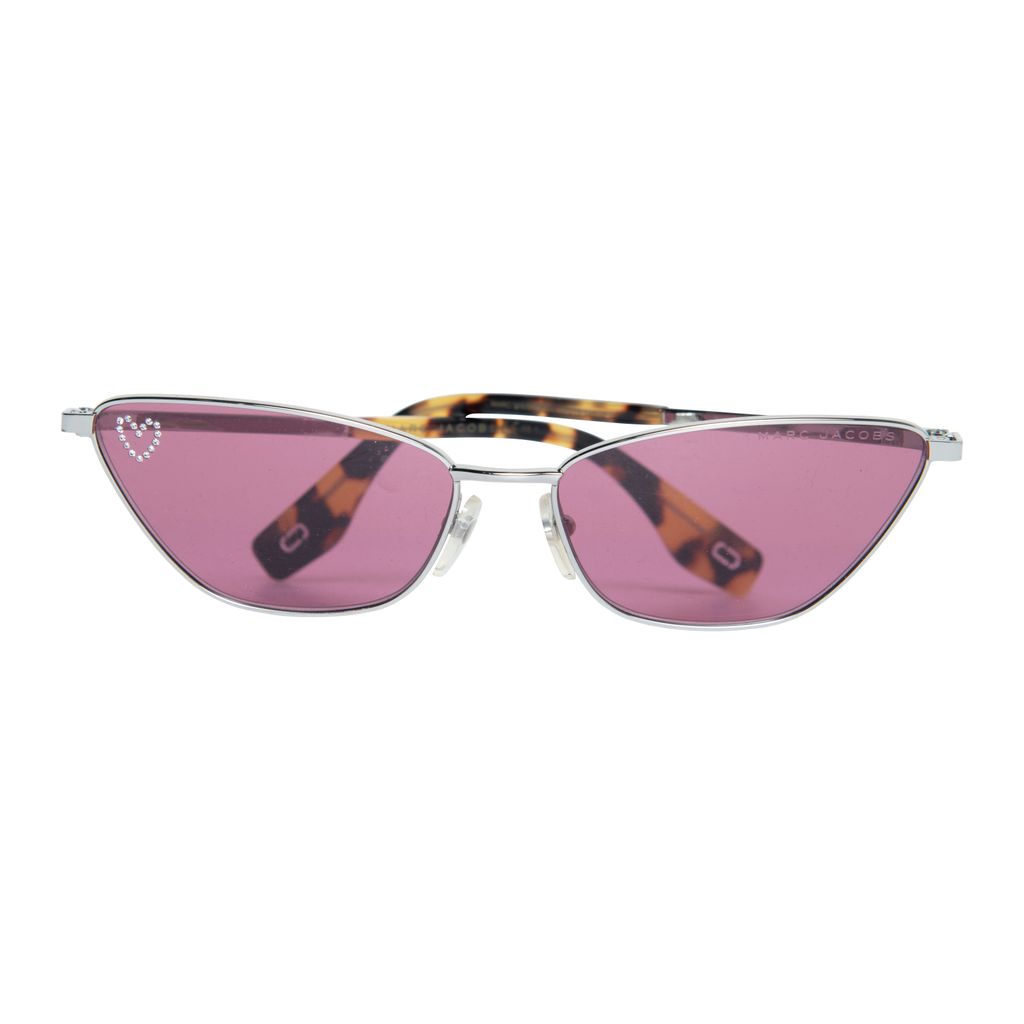 Marc Jacobs Cat Eye Sunglasses features tortoise arms, pink lenses, and heart shaped gems in corner of left lens.