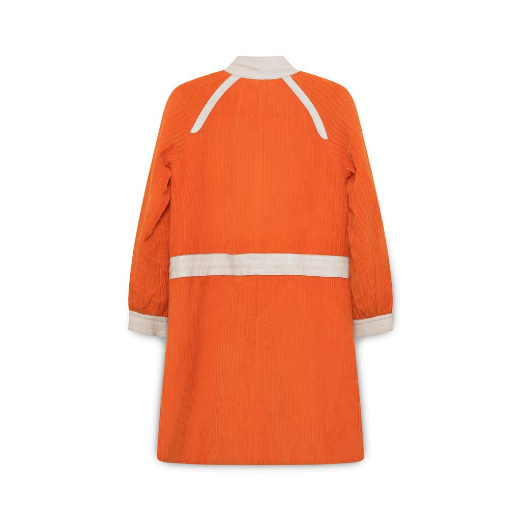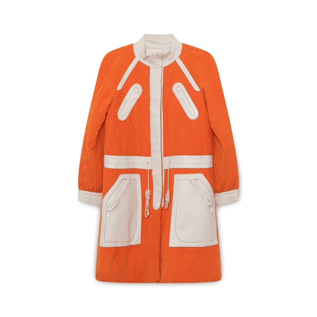 Marc Jacobs Ruffled Orange Coat features snap up closure, adjustable waist via laces, adjustable cuffs, various pockets.