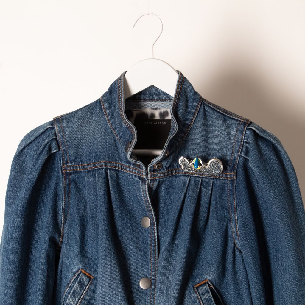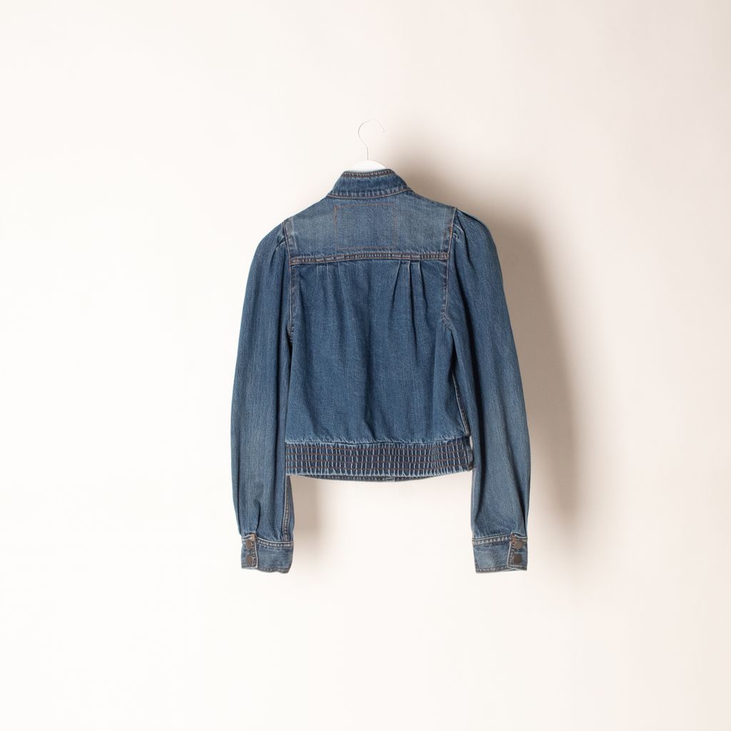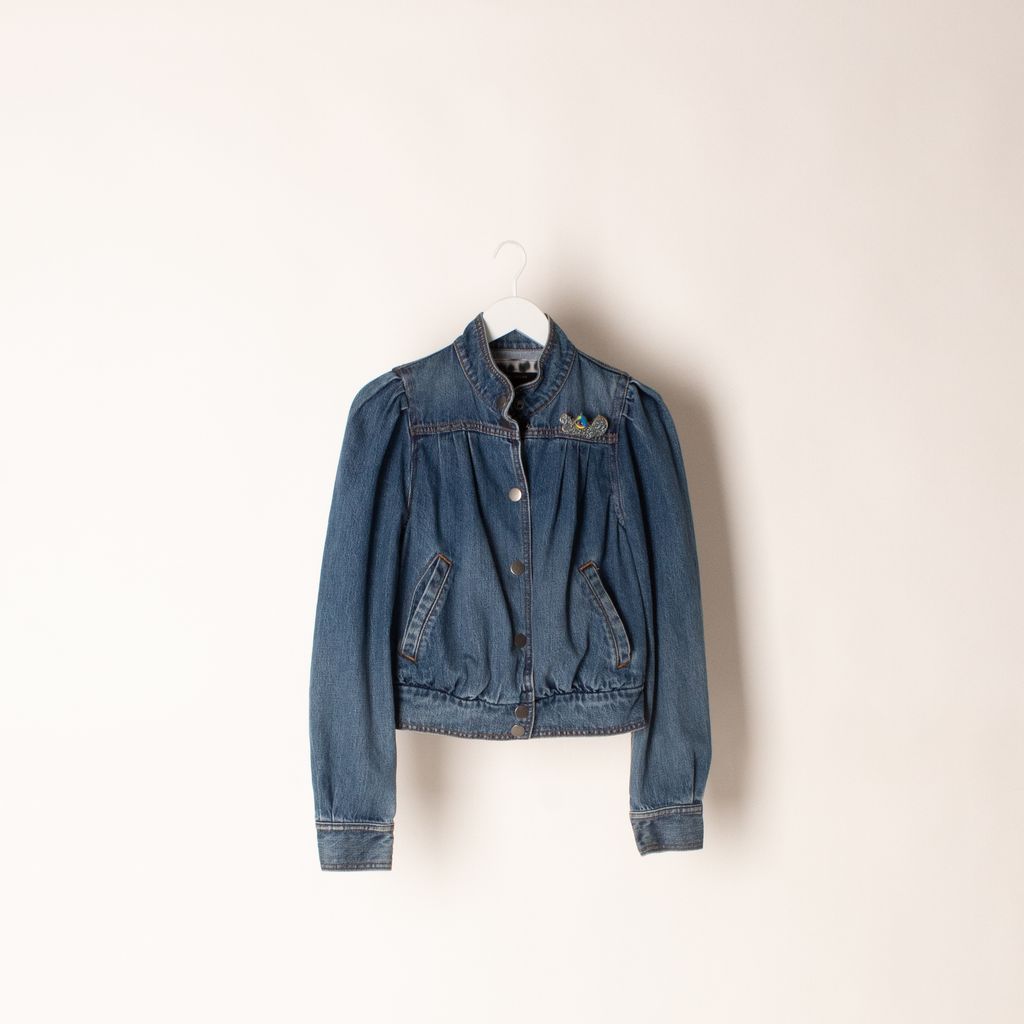 Antique indigo blue cotton shrunken 80's bomber jacket from Marc Jacobs featuring a stand up collar, a snap button closure, side pockets, long sleeves, press stud cuffs, an elasticated hem, a cropped length and an embellished eye brooch to one side.