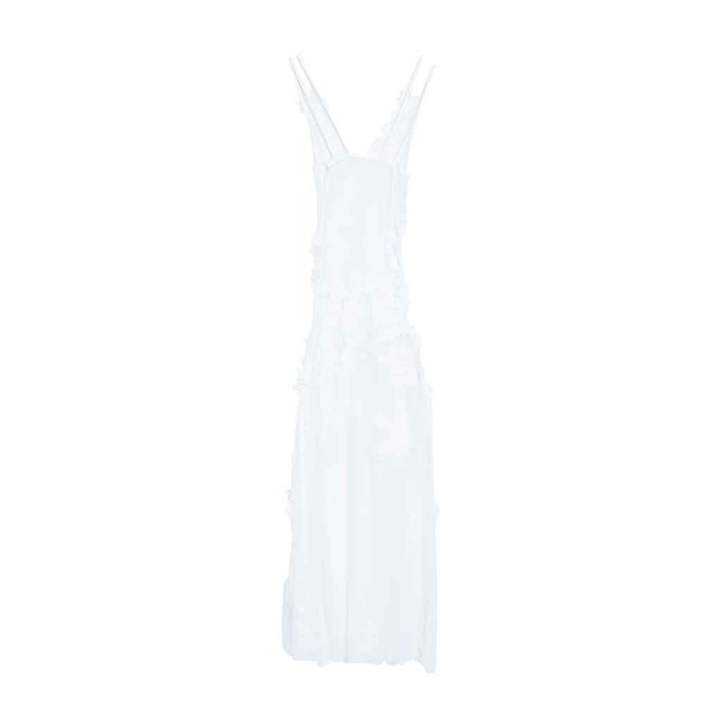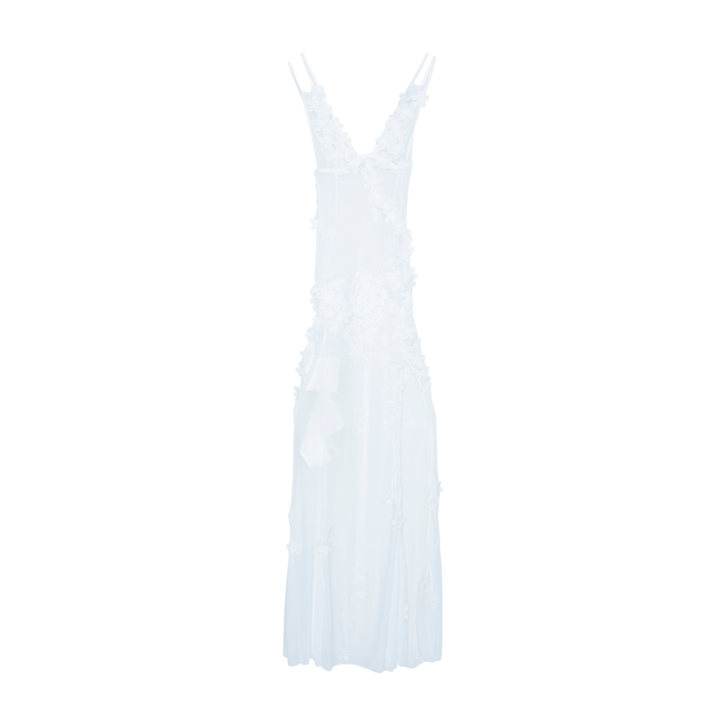 Marcia Maxi Dress features slip on style, handmade and stitched on flower details, mesh and see through style, and white underwear panties.