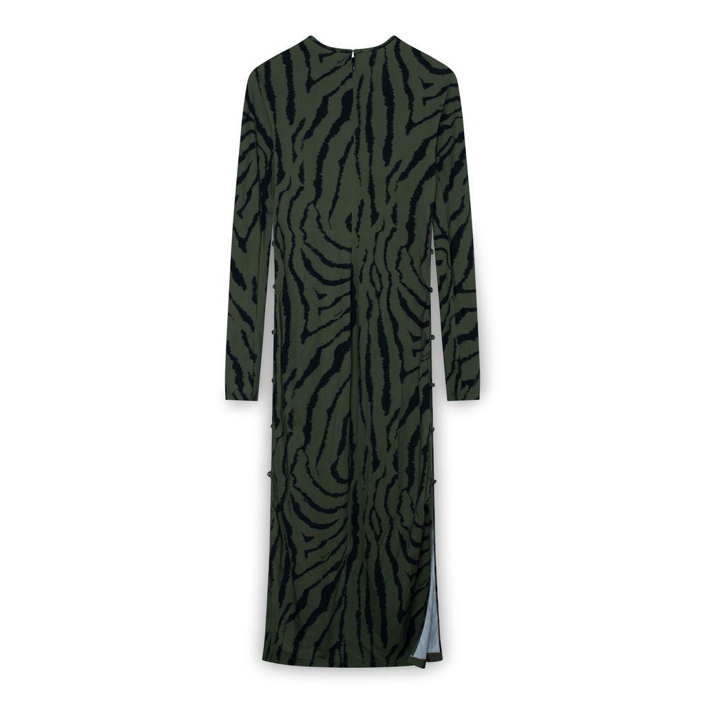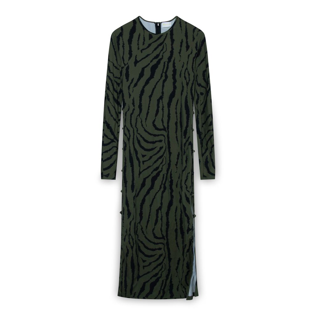 Marcia Tchikiboum Cocktail Dress Zebra Black and Green features long sleeves, slit on both sides, and hidden back zip.