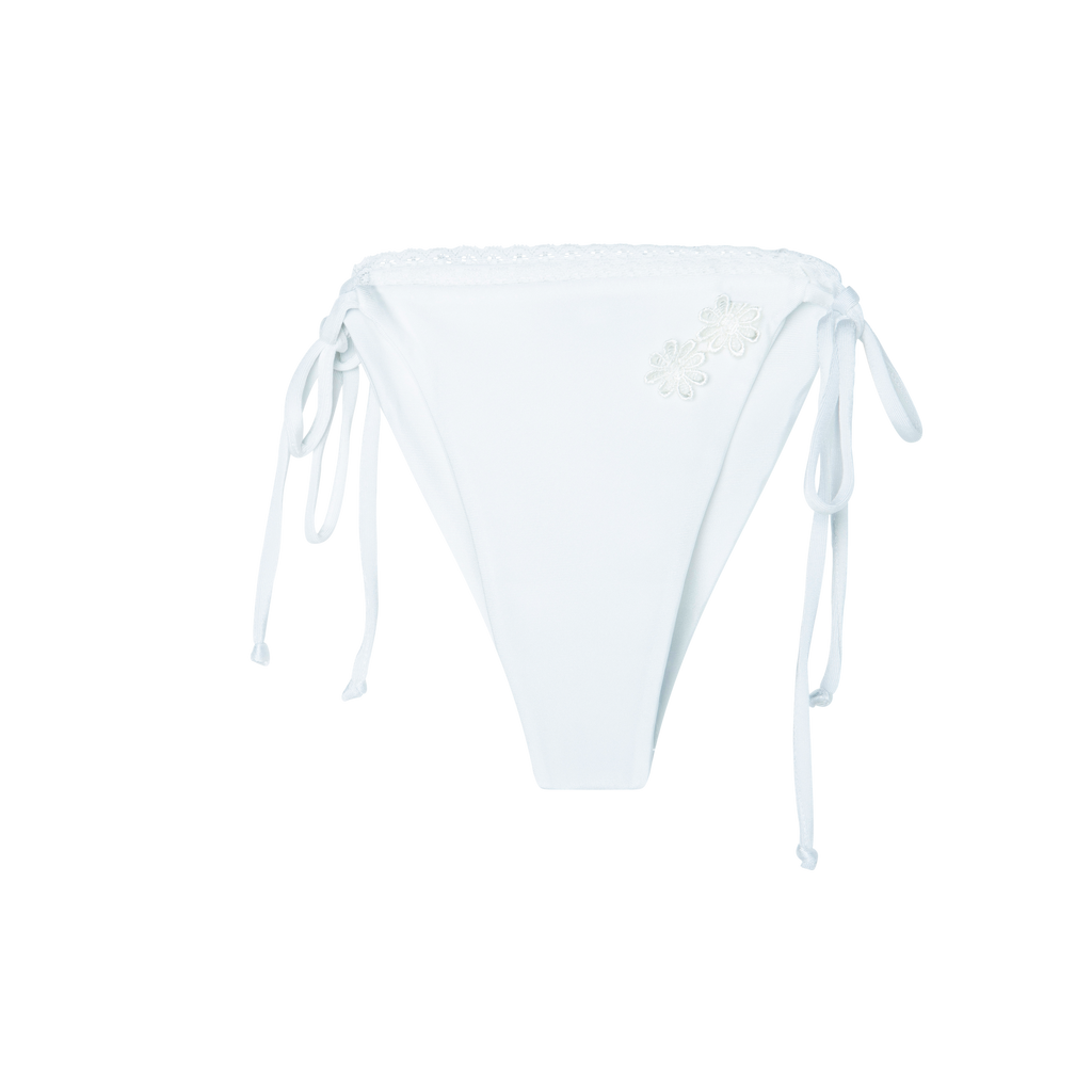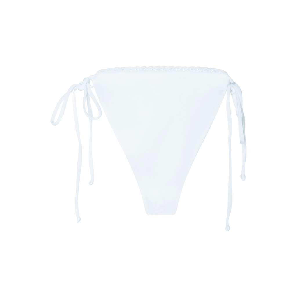 Marcia White String Bikini Bottom features string side tie and shiny stretch fabric.