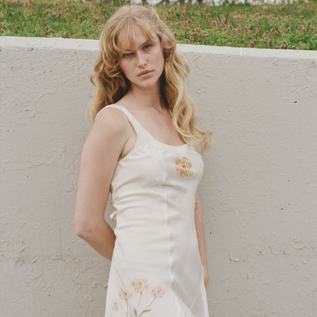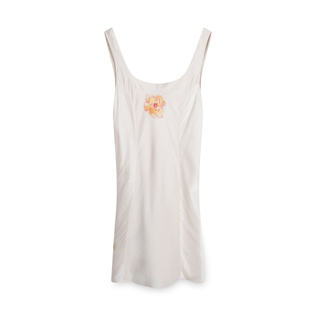 Marigold Mini Dress is a vintage upcycled mini that features hand-painted artwork.