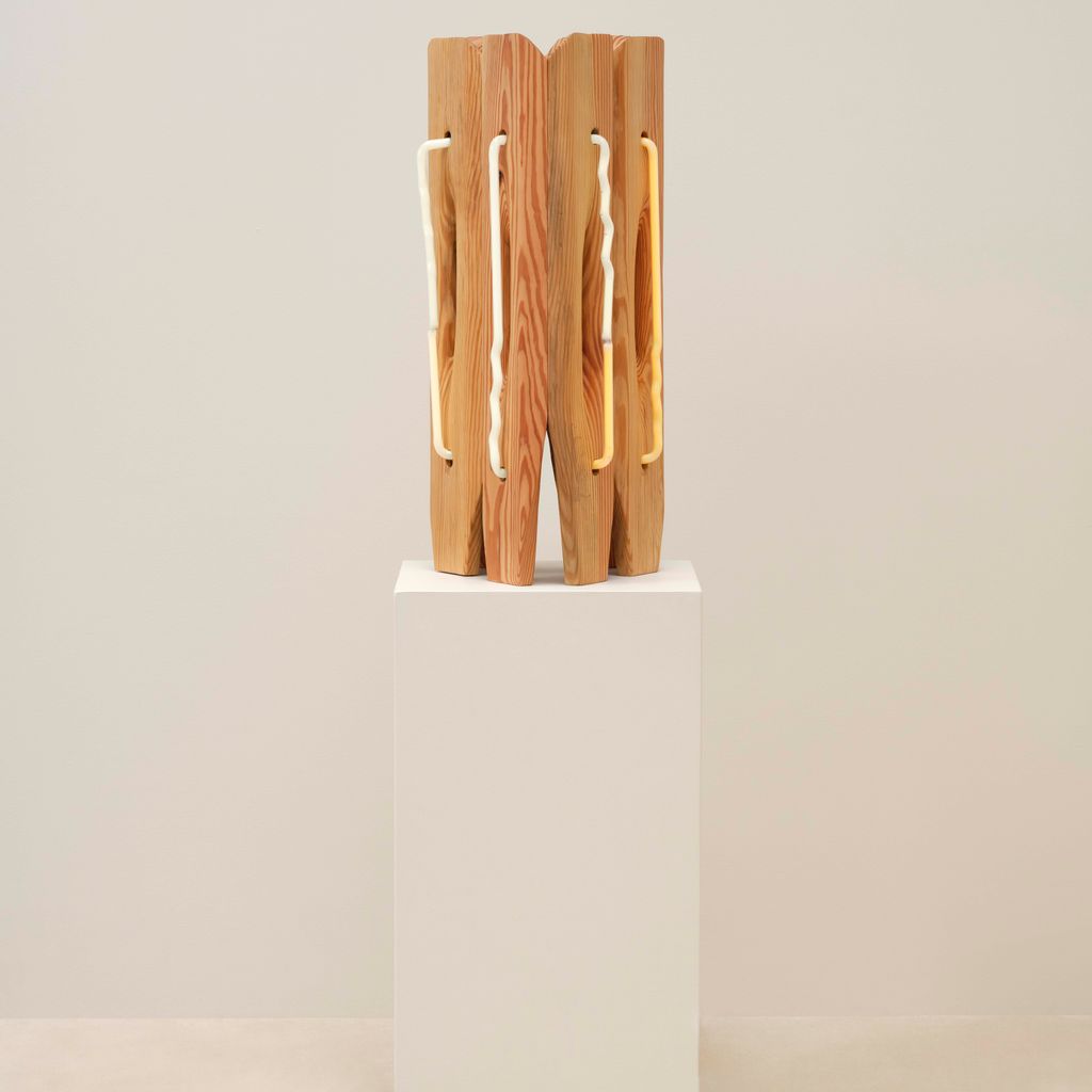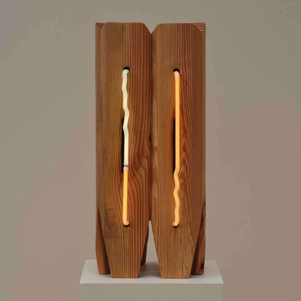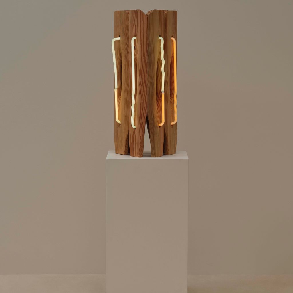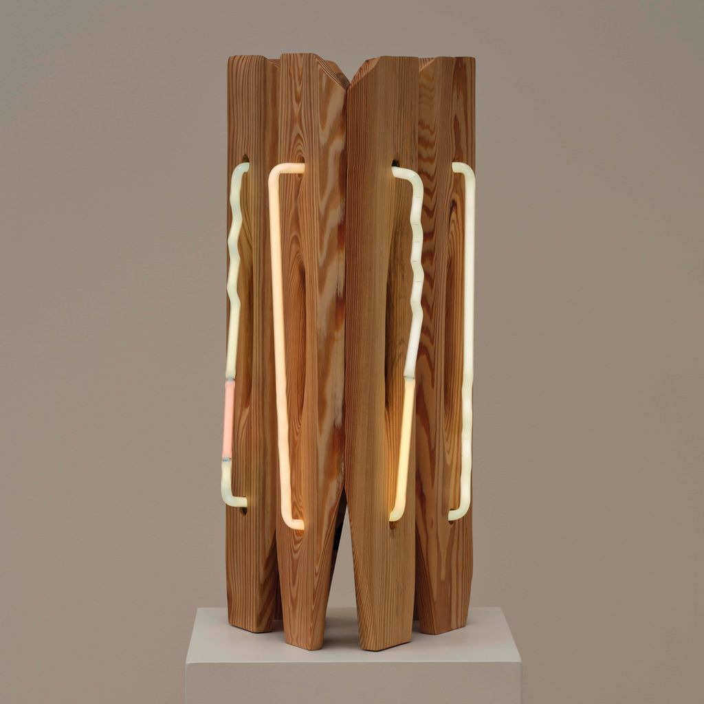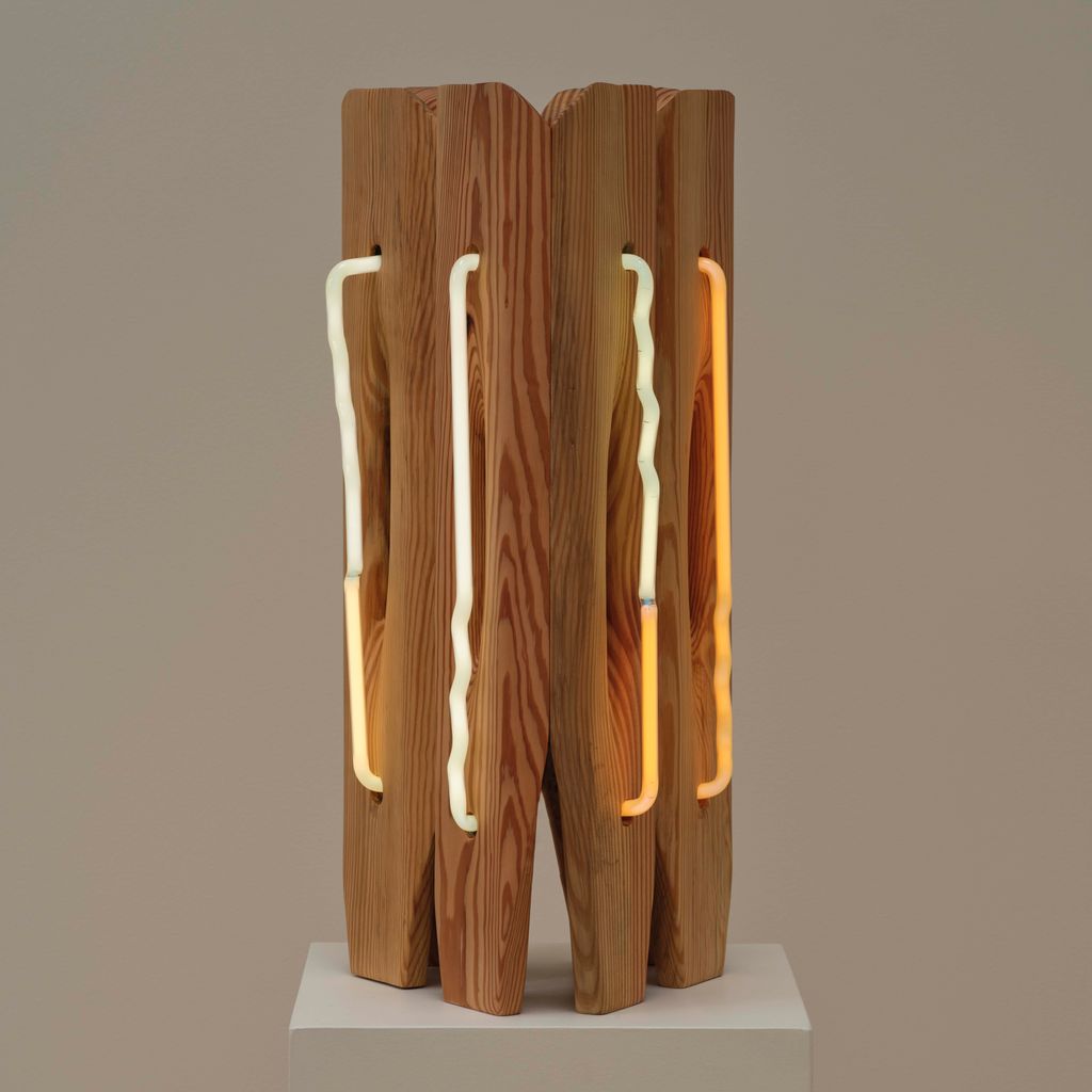American artist Mariko Makino pairs wood and neon to find softness in both. In Table Light, the smallest work in her Ripple series, warm light glows through reclaimed longleaf pine, revealing its grain. Each curve and cut of the wood guides the light differently, turning a single shape into something quietly alive. Makino’s hand-bent neon offers calm over commercial associations, offering illumination that invites stillness instead of spectacle.