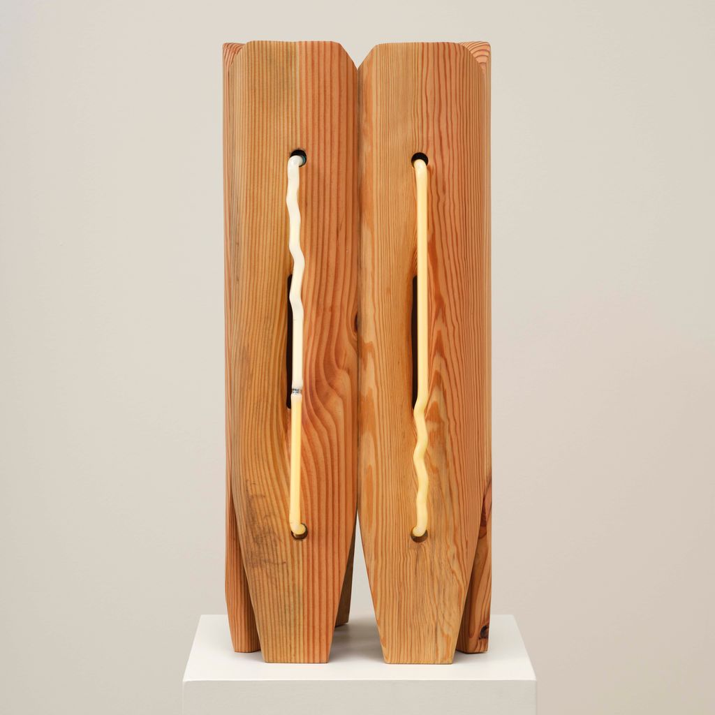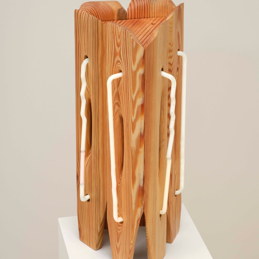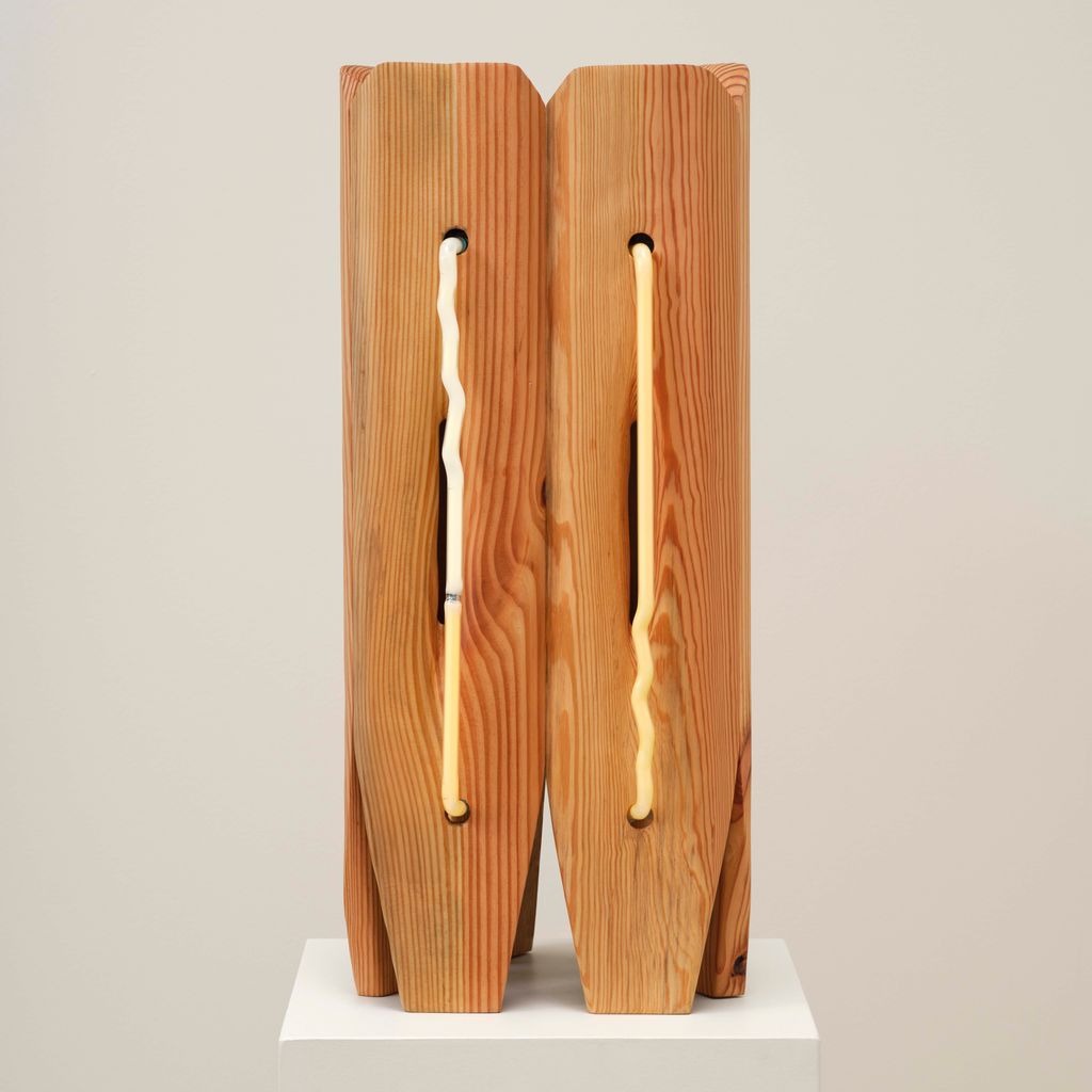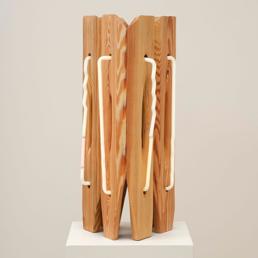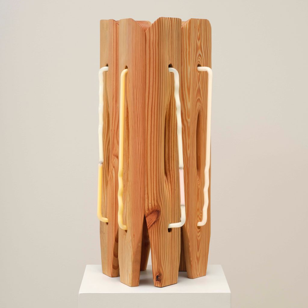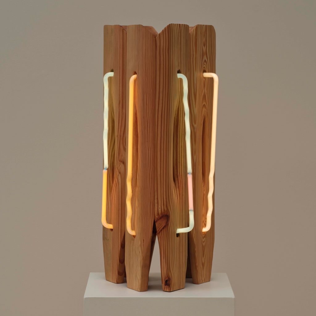 American artist Mariko Makino pairs wood and neon to find softness in both. In Table Light, the smallest work in her Ripple series, warm light glows through reclaimed longleaf pine, revealing its grain. Each curve and cut of the wood guides the light differently, turning a single shape into something quietly alive. Makino’s hand-bent neon offers calm over commercial associations, offering illumination that invites stillness instead of spectacle.