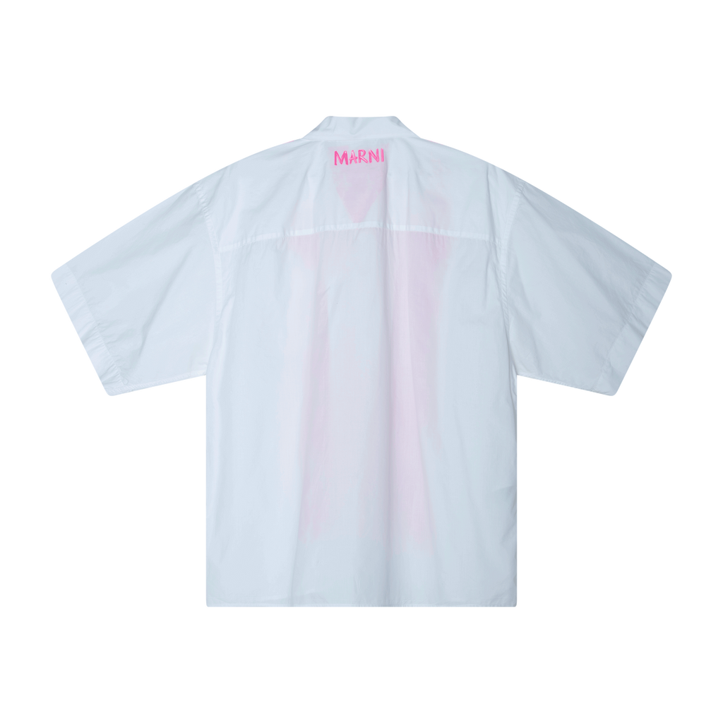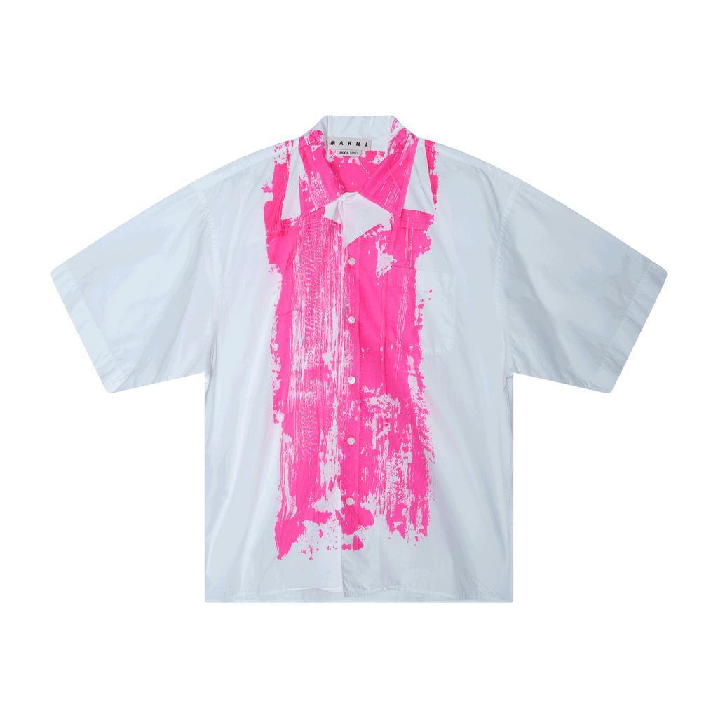 Marni White and Pink Painted Short Sleeve Shirt features graphic printed in pink at front, front button closure, patch pocket at chest, logo printed in back at back, and Mother of Pearl hardware.
