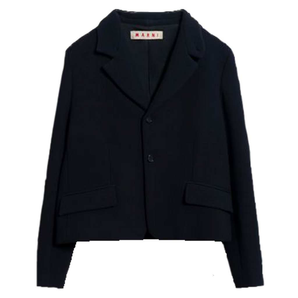 This thick wool blazer from Marni, features a buttoned high collar, a front button closure, long sleeves with button cuffs, and has decorative front pockets. Gently worn, pilling throughout from age and can be easily removed. In good condition.
