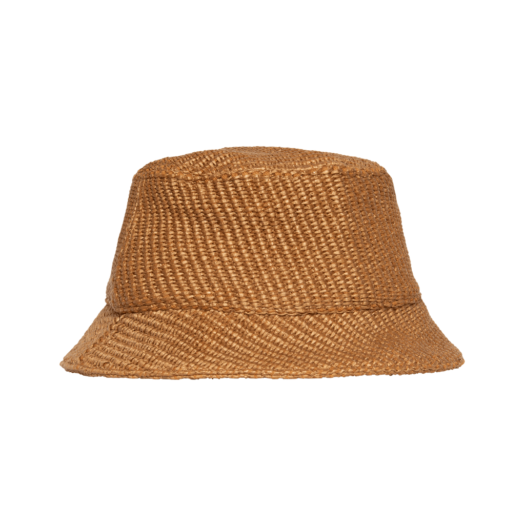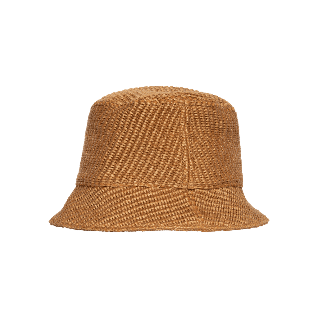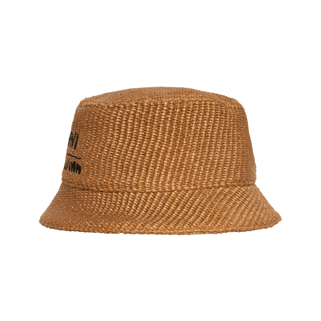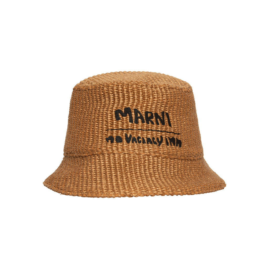 Marni x No Vacancy Inn Raffia Bucket Hat features logo embroidery on front.
