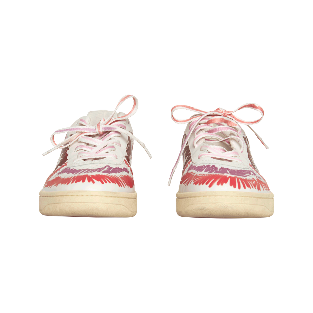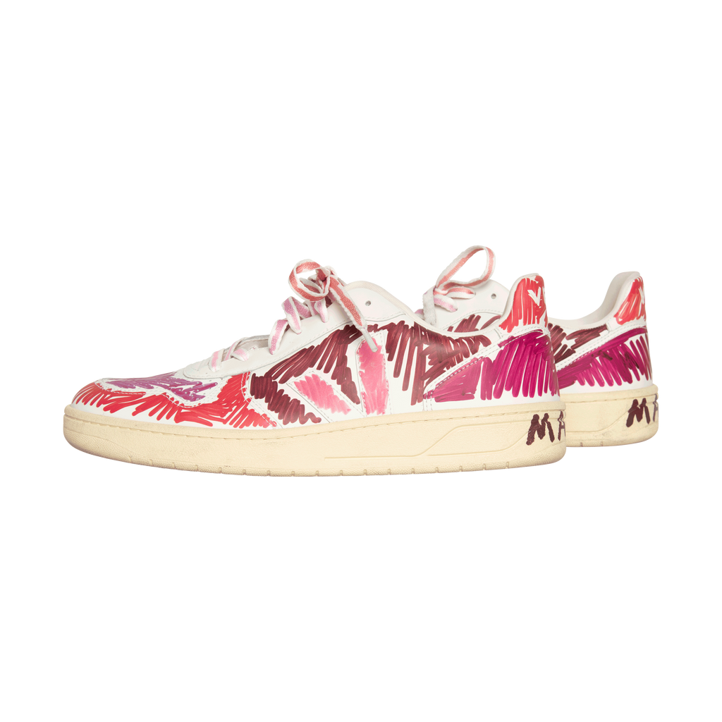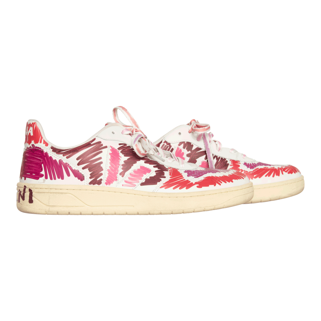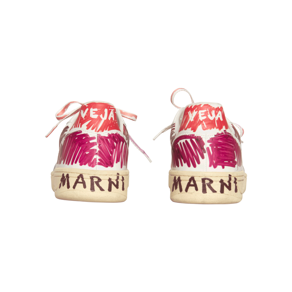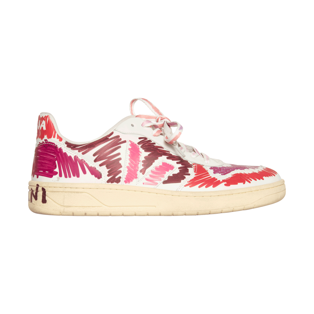 Marni x Veja V-10 Leather Sneakers features low top, pink and purple sharpie design, round toe, and lace up closure at uppers.