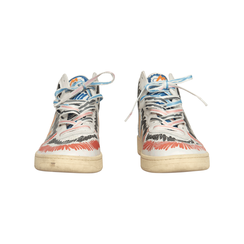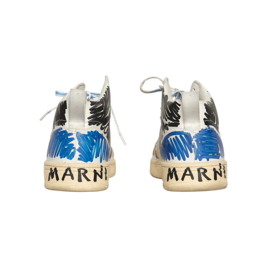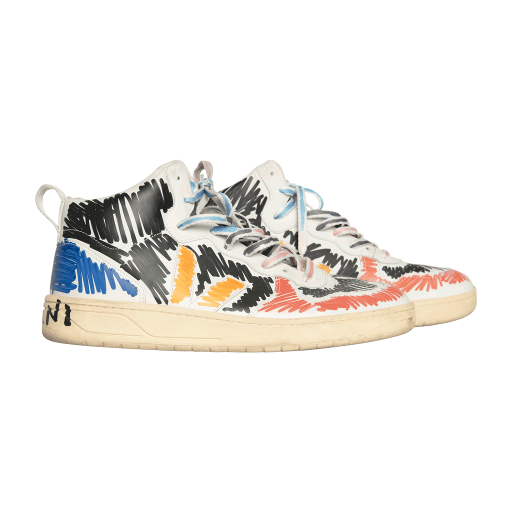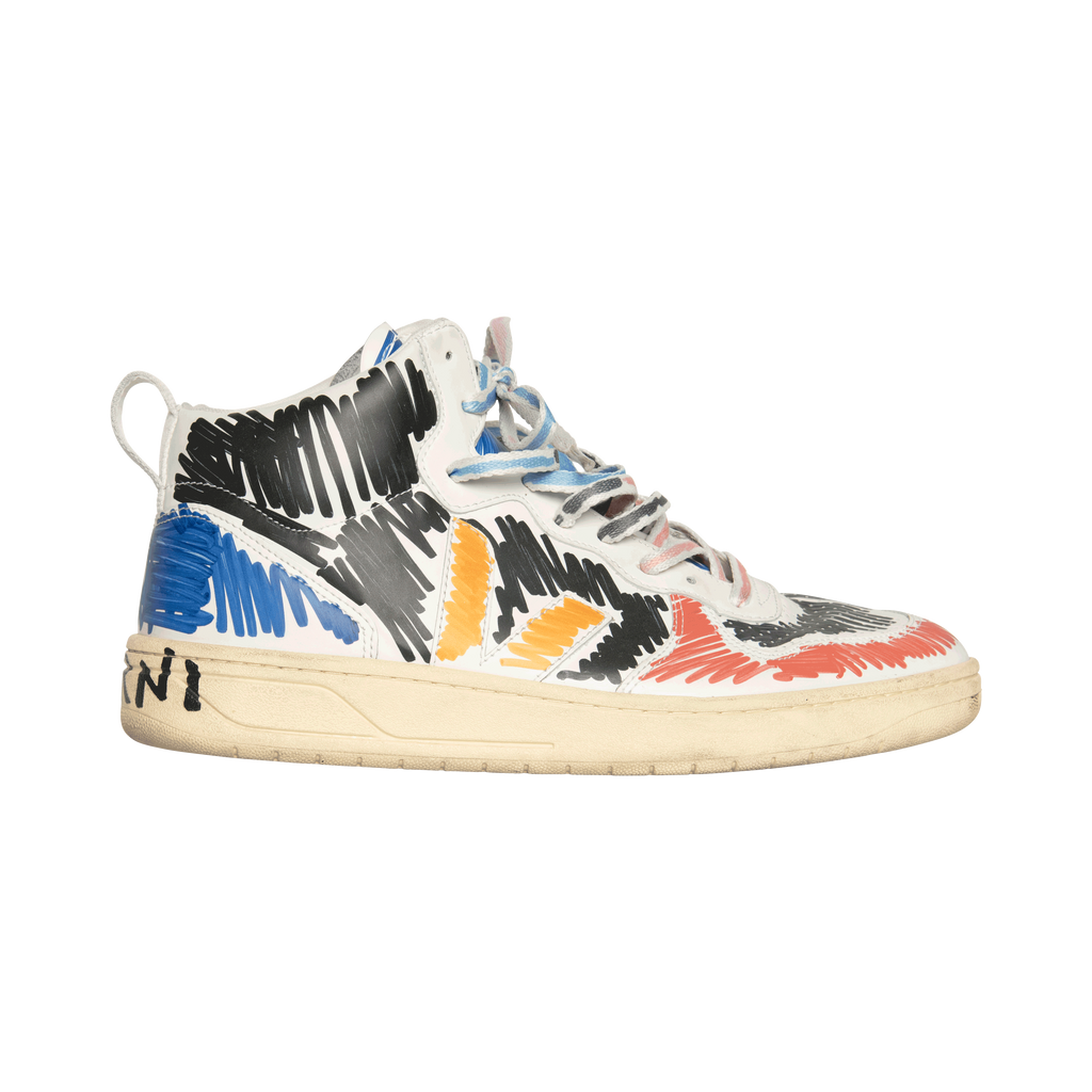 Marni x Veja V-15 High Top Sneaker features perforated round toe, front lace up fastening, logo patch at tongue, pull tab at heel, flat rubber sole, and scribble print.