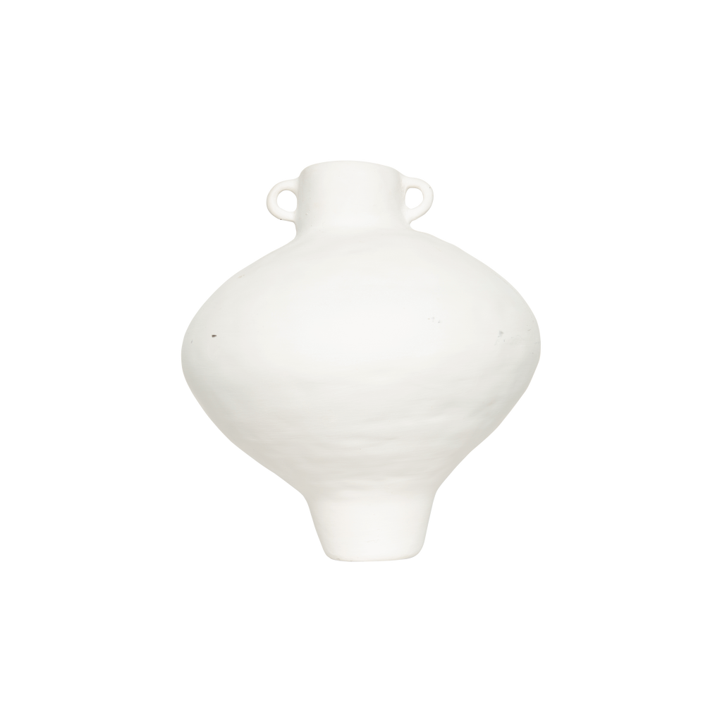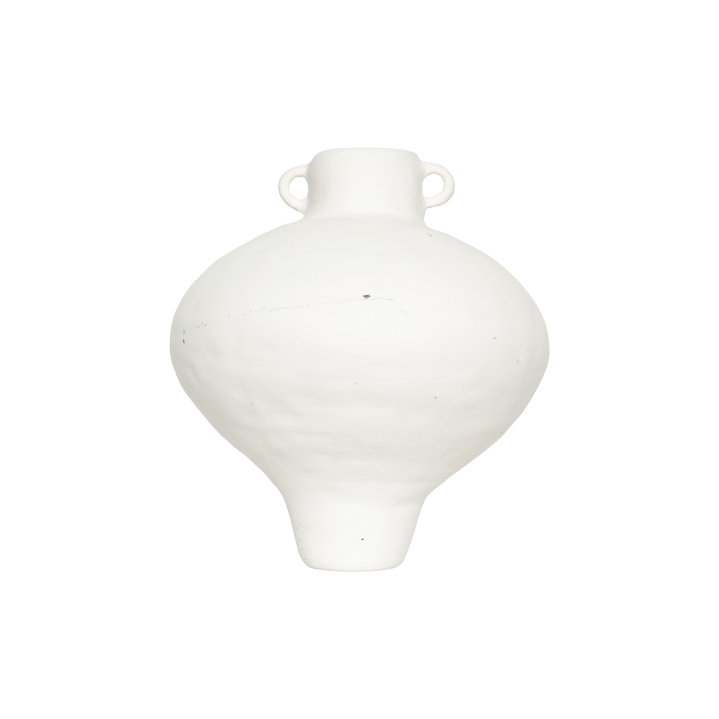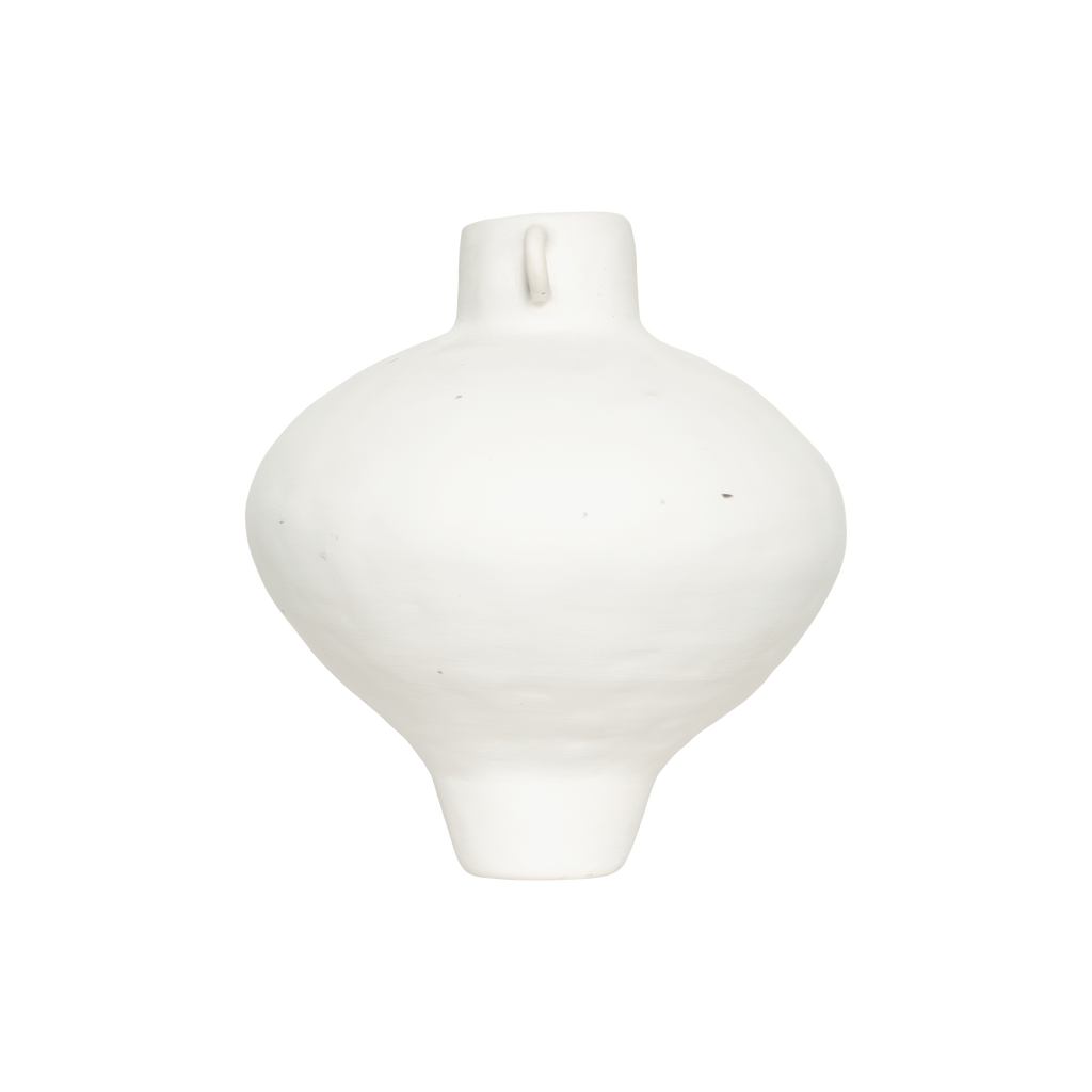 Marta Bonilla White Terracotta Vase features 2 mini handles on neck and rounded design.