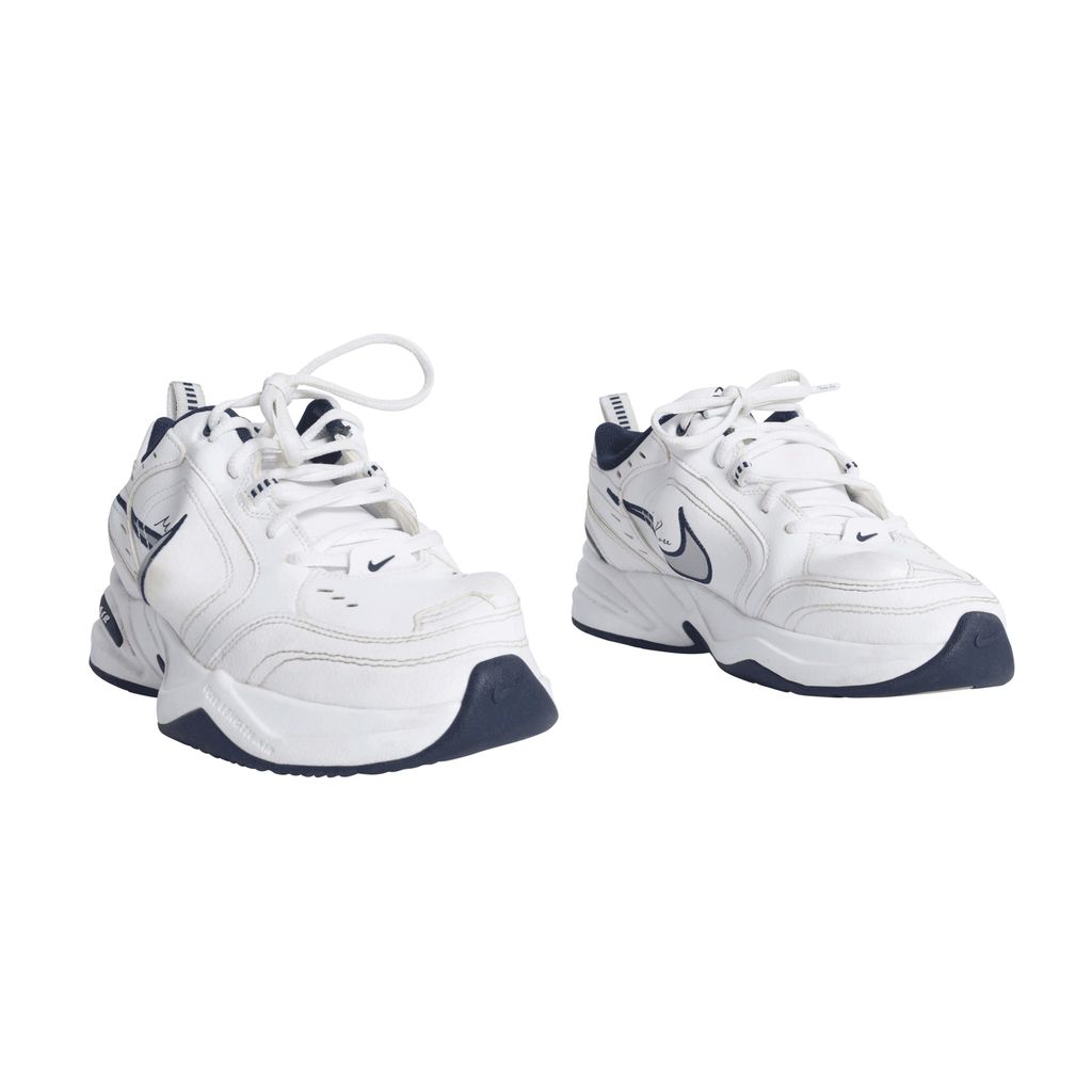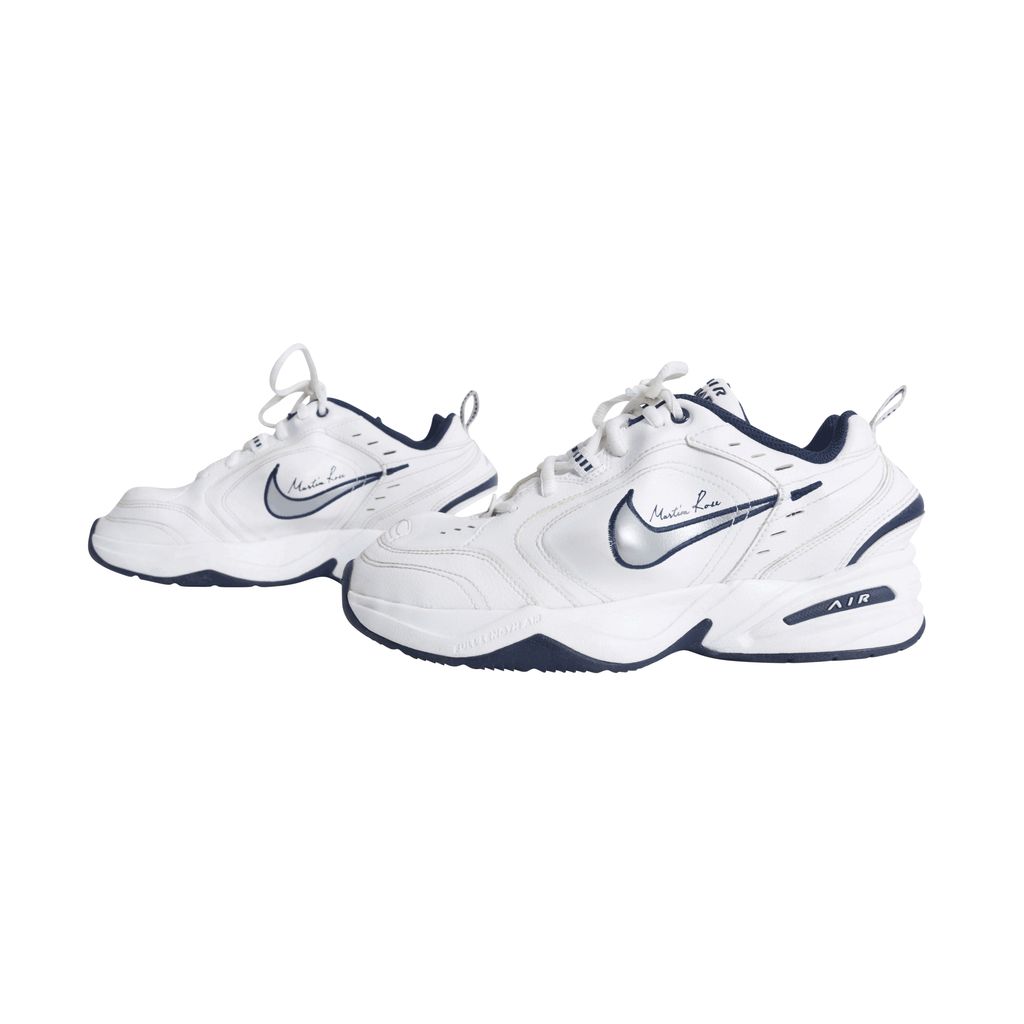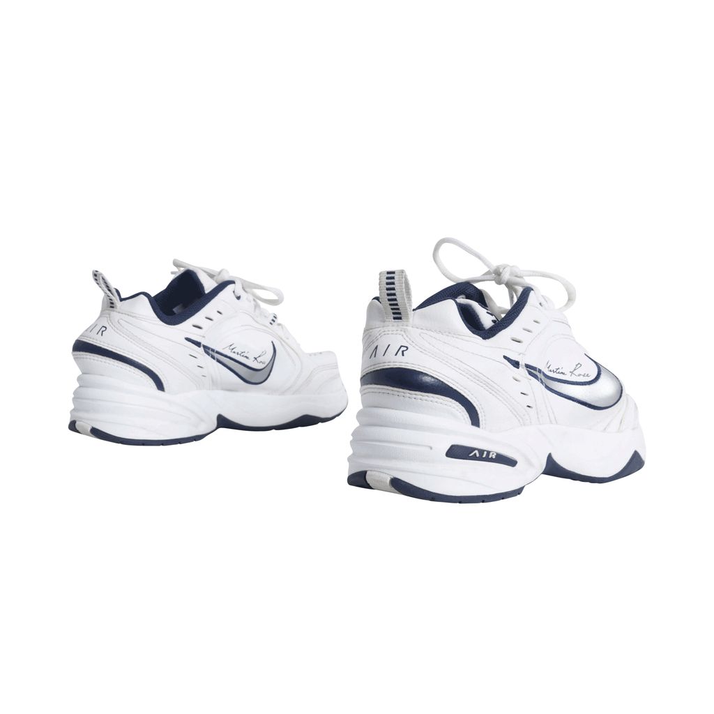 These Martine Rose x Air Monarchs IV in White Navy, London-based designer plays with the general shape of the lifestyle trainer, thanks to protruding PU inserts underneath the white leather upper. Martine Rose signature is seen above the distorted Nike swoosh.