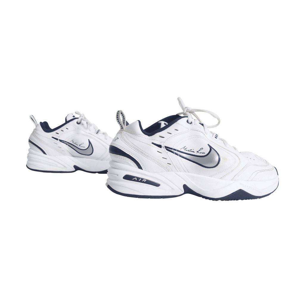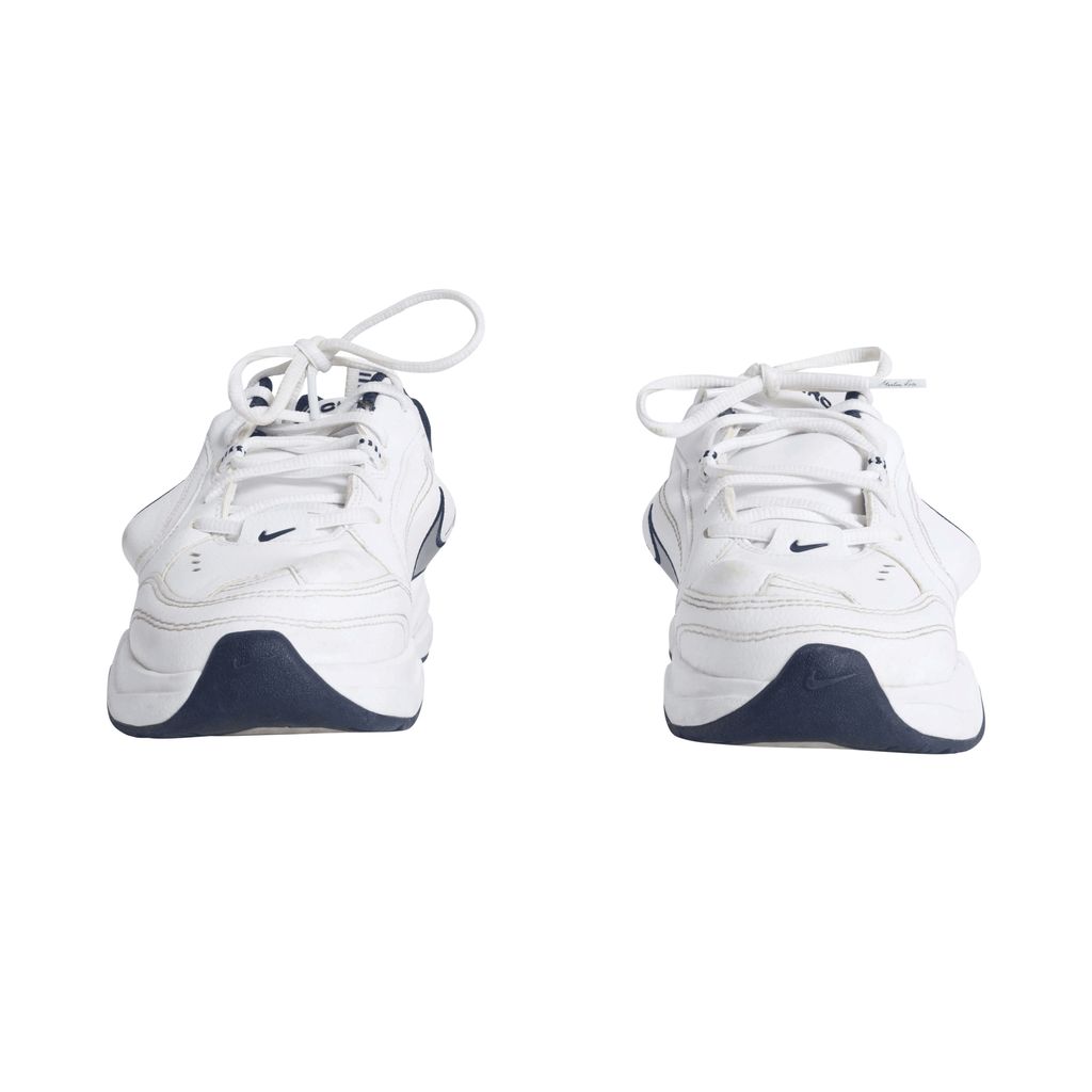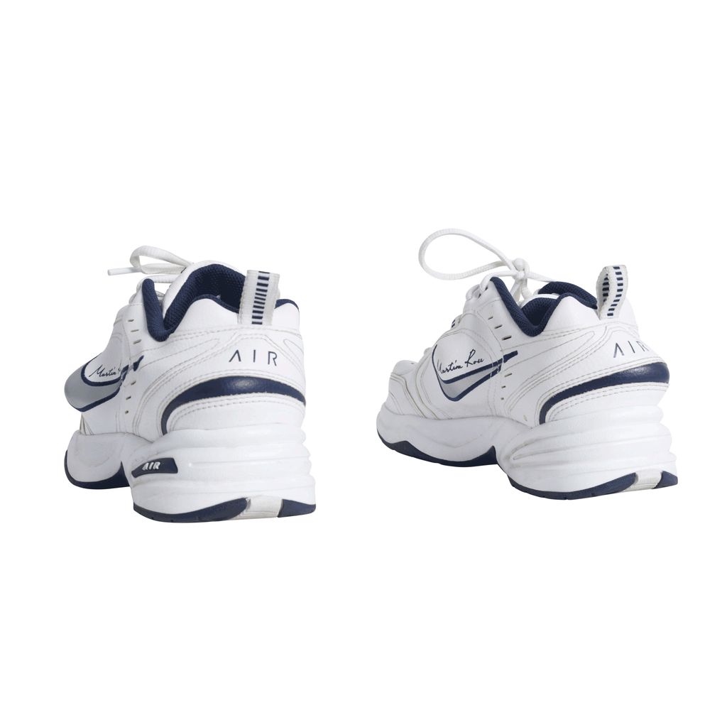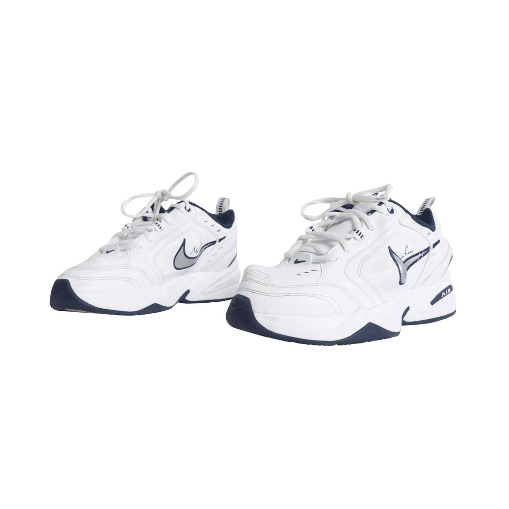 These Martine Rose x Air Monarchs IV in White Navy, London-based designer plays with the general shape of the lifestyle trainer, thanks to protruding PU inserts underneath the white leather upper. Martine Rose signature is seen above the distorted Nike swoosh.