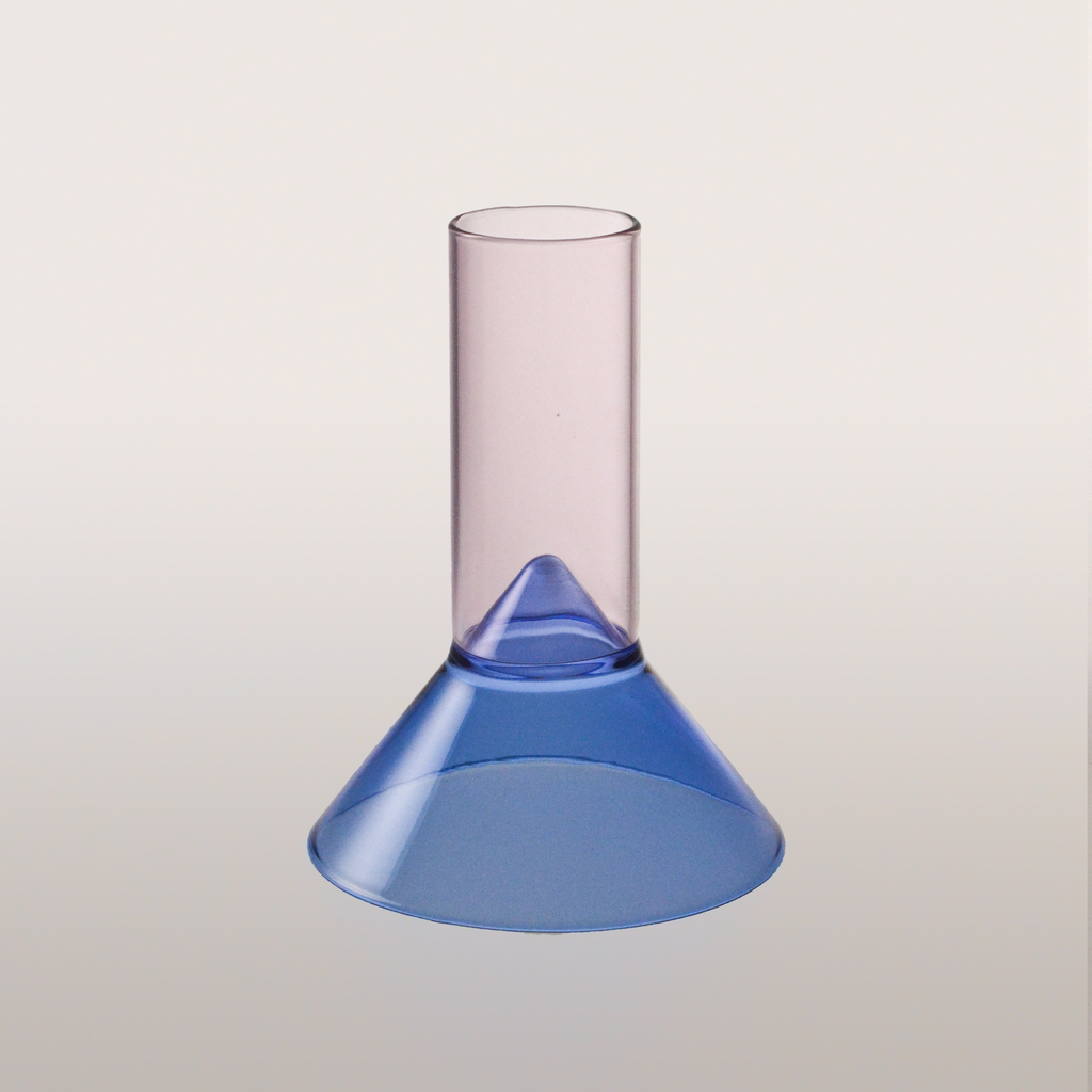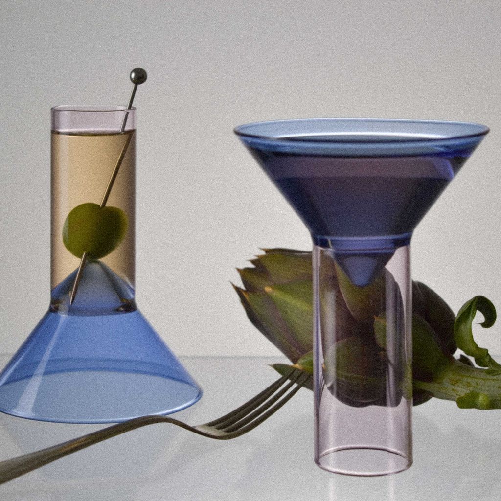 A bifunctional glass : one side designed for Martini cocktails, the opposite side for shots. Each glass is crafted from borosilicate glass, known for its durability and resistance to hot and cold temperature. It includes a steel skewer, great for garnishing with olives. The blue and pink glass combination brings lively vibrancy to urban settings, enhancing any table and setting the stage for an energetic evening.
