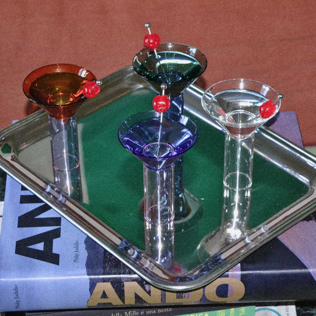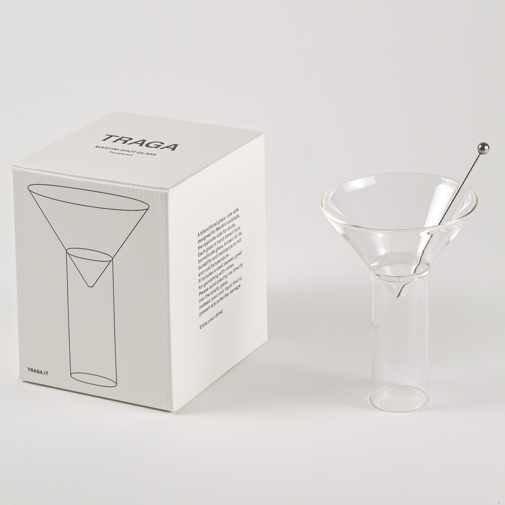 A bifunctional glass : one side designed for Martini cocktails, the opposite side for shots. Each glass is crafted from borosilicate glass, known for its durability and resistance to hot and cold temperature. It includes a steel skewer, great for garnishing with olives. The transparent version of this glass stands as a timeless piece, enhancing the vibrant hues of any beverage it holds.