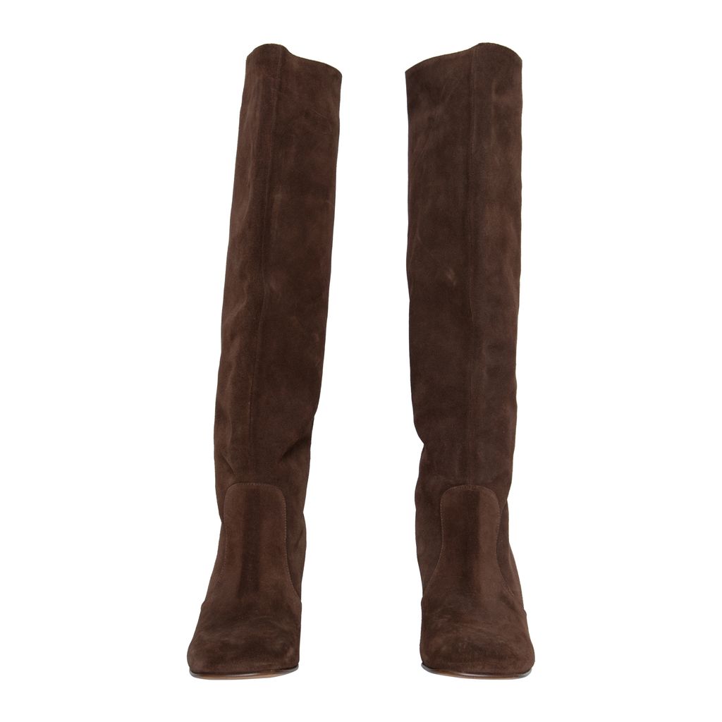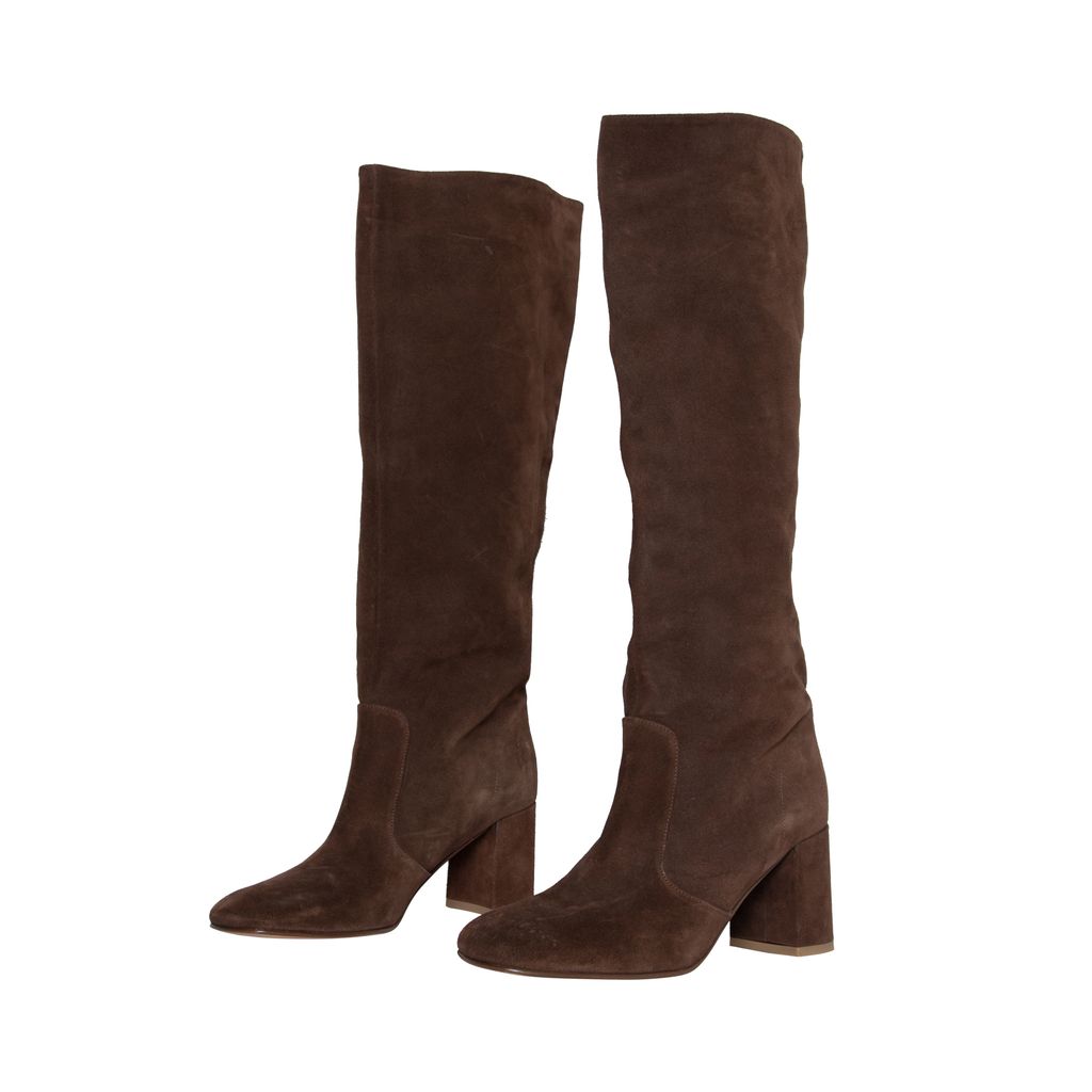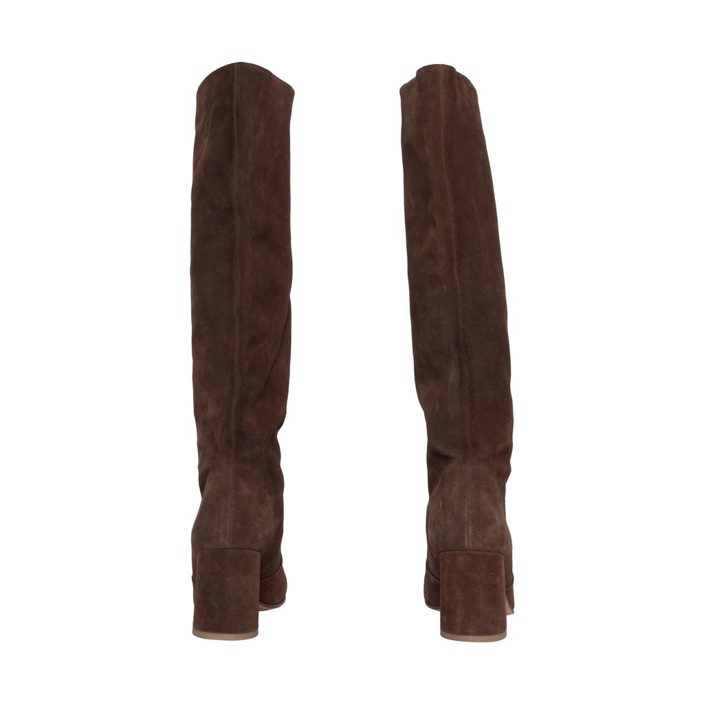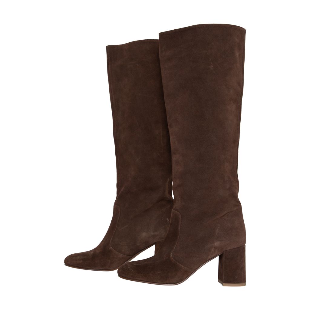 Maryam Nassir Zadeh Brown Knee High Boots features suede material, square toe, and platform.